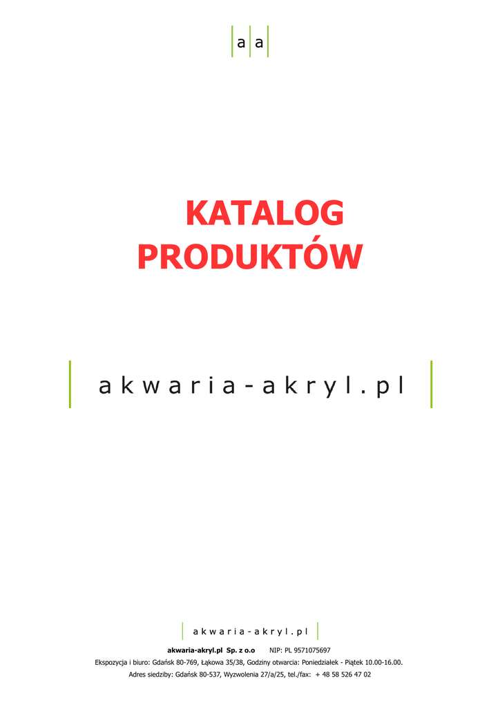 KATALOG PRODUKTÓW akwaria-akryl.pl Sp. z o.o NIP: PL 9571075697 Ekspozycja i biuro: Gdańsk 80-769, Łąkowa 35/38, Godziny otwarcia: Poniedziałek - Piątek 10.00-16.00. Adres siedziby: Gdańsk 80-537, Wyzwolenia 27/a/25, tel./fax: + 48 58 526 47 02 W poniższym katalogu znajdują się oferowane przez naszą firmę produkty. Wszystkie przedstawione rzeczy zostały przez nas przetestowane oraz działają na zrealizowanych przez nas inwestycjach. Podane w katalogu ceny są cenami detalicznymi, po opodatkowaniu podatkiem VAT. Przy dużych zamówieniach możliwe jest otrzymanie korzystnego rabatu. Każdego naszego klienta staramy się traktować indywidualnie, oraz dopasować oferowane przez nas produkty do jego potrzeb. W przypadku zainteresowania nimi prosimy o kontakt, a nasi doradcy z chęcią udzielą Państwu wszelkiej pomocy. Nasze produkty: • Biobale • Cyfrowy Sterownik Poziomu pH ORP • Filtr Piaskowy • Ozonator 6G • Ozonator 300mG • Sterylizator UV • Lampa LED z serii G3plus • Lampa LED z serii G4 • Sztuczne koralowce akwaria-akryl.pl Sp. z o.o NIP: PL 9571075697 Ekspozycja i biuro: Gdańsk 80-769, Łąkowa 35/38, Godziny otwarcia: Poniedziałek - Piątek 10.00-16.00. Adres siedziby: Gdańsk 80-537, Wyzwolenia 27/a/25, tel./fax: + 48 58 526 47 02 BIOBALE Biobale to wypełnienie biologiczne do filtrów zapewniające odpowiednią filtrację biologiczną oraz mechaniczną. Stanowią bardzo dobry wkład biologiczny, są siedliskiem pożytecznych bakterii, nie zapychają się, nie spowalniają przepływu filtra. Nadają się do użytku w akwarium słodko- oraz słonowodnym. Wszystkie oferowane przez nas produkty z powodzeniem działają na wykonanych przez nas realizacjach. Charakterystyka produktu Wymiary ⌀25mm, h = 12mm. Worek 0,1m3 (100l) 9,5kg Ilość szt. w 0,1m3 (100l) 13530 Cena produktu: 569zł brutto akwaria-akryl.pl Sp. z o.o NIP: PL 9571075697 Ekspozycja i biuro: Gdańsk 80-769, Łąkowa 35/38, Godziny otwarcia: Poniedziałek - Piątek 10.00-16.00. Adres siedziby: Gdańsk 80-537, Wyzwolenia 27/a/25, tel./fax: + 48 58 526 47 02 CYFROWY STEROWNIK POZIOMU PH/ORP Oferujemy profesjonalny cyfrowy sterownik do badania i kontroli poziomu pH oraz ORP. Urządzenie wyposażone jest w duży wyświetlacz LED. Stosuje się je w rozwiązaniach przemysłowych, jak i mniejszych realizacjach. W komplecie znajdują się również 2 elektrody do równoczesnego pomiaru ph i redox, 2-obwody gniazd włączeniowych. Wszystkie oferowane przez nas produkty z powodzeniem działają na wykonanych przez nas realizacjach. Charakterystyka produktów Skala PH 0.00~14.00PH ORP -1999~1999mV Dokładność PH ±0.1%+0.02PH ORP ±5 mV Zaokrąglenie wartości PH 0.01PH ORP 1MV Zakres PH 3.50~10.50PH ORP -500~500mV Środowisko Temperatura: 0 ~ 50 ° C Wilgotność <95% Wyświetlacz Wyświetlacz LED Zasilanie 220V±10% 50Hz±2% Wymiary 160mm×102mm×40mm Waga 872g Cena produktu: 999zł brutto akwaria-akryl.pl Sp. z o.o NIP: PL 9571075697 Ekspozycja i biuro: Gdańsk 80-769, Łąkowa 35/38, Godziny otwarcia: Poniedziałek - Piątek 10.00-16.00. Adres siedziby: Gdańsk 80-537, Wyzwolenia 27/a/25, tel./fax: + 48 58 526 47 02 FILTR PIASKOWY Z POMPĄ WODY Z WBUDOWANĄ LAMPĄ UV Działanie filtru piaskowego polega na usunięciu wszelkich zanieczyszczeń większych od ziarna piasku. Oferowany przez nas filtr dodatkowo wyposażony jest w lampę UV-C o mocy 36W. Wszystkie oferowane przez nas produkty z powodzeniem działają na wykonanych przez nas realizacjach. Charakterystyka filtra piaskowego Wymiary Ø500 x 600mm Powierzchnia filtracji 40m2 Maksymalny przepływ wody 9,5m3/h Maksymalne ciśnienie 0,3 bar Moc lampy UV-C 36W Przeznaczony do powierzchni 50m2 Charakterystyka pompy wody do filtra piaskowego Wysokość maksymalna (m) 7 Przepływ 130l/h Moc 280W Napięcie 220-240/50Hz Ilość faz 1 Cena produktu: 3.399zł brutto akwaria-akryl.pl Sp. z o.o NIP: PL 9571075697 Ekspozycja i biuro: Gdańsk 80-769, Łąkowa 35/38, Godziny otwarcia: Poniedziałek - Piątek 10.00-16.00. Adres siedziby: Gdańsk 80-537, Wyzwolenia 27/a/25, tel./fax: + 48 58 526 47 02 OZONATOR 6G Profesjonalny generator ozonu o wydajności 6G/h (6000mg/h). Ozonator służy do oczyszczenia wody z drobnoustrojów i bakterii (dezynfekcji wody). Zabija wszelkie chorobotwórcze patogeny oraz zarodniki glonów oraz odgrywa kluczową rolę w procesie krystalizacji optycznej wody. Wszystkie oferowane przez nas produkty z powodzeniem działają na wykonanych przez nas realizacjach. Charakterystyka produktu Wydajność ozonu: 5.2 – 6.7 G/h Chłodzenie: Powietrze Gaz zasilający: Tlen Moc: 100W Napięcie: AC220/110V Sugerowana przestrzeń: 400-500m3 Waga: 5.50kg Wymiary: 345x172x288mm Zestaw zawiera dodatkowo: Wąż sylikonowy – 2m Kamień napowietrzający – 2szt. Bezpieczniki – 2szt. Cena produktu: 2.299zł brutto akwaria-akryl.pl Sp. z o.o NIP: PL 9571075697 Ekspozycja i biuro: Gdańsk 80-769, Łąkowa 35/38, Godziny otwarcia: Poniedziałek - Piątek 10.00-16.00. Adres siedziby: Gdańsk 80-537, Wyzwolenia 27/a/25, tel./fax: + 48 58 526 47 02 OZONATOR 300mG Profesjonalny generator ozonu o wydajności 300mg/h. Ozonator służy do oczyszczenia wody z drobnoustrojów i bakterii (dezynfekcji wody). Zabija wszelkie chorobotwórcze patogeny oraz zarodniki glonów oraz odgrywa kluczową rolę w procesie krystalizacji optycznej wody. Wszystkie oferowane przez nas produkty z powodzeniem działają na wykonanych przez nas realizacjach. Charakterystyka produktu Wydajność ozonu 0-300 mg/h Materiał Tworzywo sztuczne Wlot powietrza/Wylot ozon 1/4" Napięcie 220V/50Hz 110V/60Hz, DC 12V Wymiary 7,5 x 12 x 5 cm Waga 0.2 kg Zestaw zawiera dodatkowo Wąż sylikonowy – 2szt. Kamień napowietrzający – 1szt. Oferowany przez nas produkt charakteryzuje się wyjątkowo dobrym współczynnikiem jakości do ceny. Cena produktu: 949zł brutto akwaria-akryl.pl Sp. z o.o NIP: PL 9571075697 Ekspozycja i biuro: Gdańsk 80-769, Łąkowa 35/38, Godziny otwarcia: 