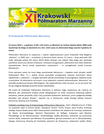 XI Krakowski Półmaraton Marzanny 23 marca 2014 r. o godzinie 11:00 z linii startu na Błoniach (w Cichym Kąciku) blisko 3000 osób wystartuje do biegu na dystansie 21,1 km. Limit czasu na ukończenie biegu wynosi 3 godziny 15 minut. Półmaraton Marzanny to najstarsza z imprez organizowanych przez Krakowski Klub Biegacza „Dystans”, w 2004 roku – oczywiście w pierwszy dzień wiosny, 21 marca – bieg ukończyło 209 osób, dziesiątą edycję (24 marca 2013) blisko dziesięć razy więcej! Ideą biegu jest sportowe powitanie wiosny po okresie żmudnych, zimowych przygotowań; półmaraton jest także idealnym sprawdzianem formy przed wiosennymi maratonami – w szczególności przed Cracovia Maratonem. Przez pierwsze osiem lat trasa biegu pozostawała identyczna – niepełne sześć okrążeń wokół krakowskich Błoń. To z jednej strony pozwalało przygotować imprezę skromnymi siłami zapaleńców z „Dystansu”, z drugiej stanowiło jednak przeszkodę w przyciągnięciu większej liczby uczestników. W odróżnieniu od innych, coraz większych, polskich półmaratonów „Marzanna” nie potrafiła przekroczyć bariery 500 biegaczy. Dla organizatorów stało się jasne, że na tej trasie nie da się osiągnąć dalszego przyrostu liczby zawodników. Od trzech lat Krakowski Półmaraton Marzanny w dalszym ciągu rozpoczyna się i kończy na Błoniach, dla zachowania tradycji przed wbiegnięciem na metę uczestnicy wykonują półtora okrążenia, jednak pozostała część trasy prowadzi bulwarami wiślanymi, przez podgórską Kładkę Bernatka, aby okrążyć Wawel i zapuścić się w historyczne zaułki Starego Miasta (ulicami Kanoniczą, Senacką oraz Poselską). Dokładny przebieg trasy XI Krakowskiego Półmaratonu Marzanny: start z deptaka przy al. 3 Maja na wysokości pętli w Cichym Kąciku. Następnie ulicami: Focha, Emaus, Jaksy Gryfity, Królowej Jadwigi, Księcia Józefa, przez Most Zwierzyniecki chodnikiem do stadionu KS Tramwaj, bulwarami do Mostu Grunwaldzkiego, Mostem Retmańskim do Rollego, bulwarem pod Mostem Piłsudskiego aż do Staromostowej i Brodzińskiego, kładką Bernatka, bulwarem po przeciwnej stronie Wisły, bulwarem pod Mostem Grunwaldzkim, górnym bulwarem do ul. Bernardyńskiej, Idziego, Kanoniczą, Senacką do Poselskiej, plantami do Podzamcza, bulwarami wzdłuż Wisły, Flisacką, Kościuszki, Kasztelańską, deptakiem i częściowo jezdnią al. 3 Maja okrążenie wokół Błoń Krakowskich aż do wysokości ul. Chodowieckiego, gdzie zlokalizowana będzie meta. Dla zapewnienia właściwego przebiegu imprezy, trasa zostanie odpowiednio zabezpieczona i oznakowana, nad bezpieczeństwem biegaczy czuwać będą funkcjonariusze Policji oraz Straży Miejskiej, pracownicy firmy ochroniarskiej oraz wolontariusze. Niestety tak duża liczba biegaczy na trasie przebiegającej przez centrum miasta musi spowodować pewne utrudnienia w ruchu: na całej trasie półmaratonu będą obowiązywały znaki zakazu zatrzymywania się pojazdów oraz zostaną wyłączone drogi dla rowerów; al. 3 Maja – zamknięta dla ruchu w godz. 6.00-15.00 (ruch tramwajowy bez zmian); al. Focha – utrudnienia w ruchu w godz. 10.00-14.30, zamknięcie w rejonie mostu na Rudawie w godz. 10.30-12.00; ul. Kościuszki – zamknięta od ul. Królowej Jadwigi do ul. Komorowskiego w godz. 10.0014.15; ul. Idziego oraz ul. Podzamcze do skrzyżowania z ul. Straszewskiego – zamknięte w godz. 10:30-13:00 na pozostałych ulicach na trasie biegu oraz na Bulwarach Wiślanych są przewidywane utrudnienia w ruchu (wyłączenia ruchu pieszego i kołowego na czas przebiegnięcia uczestników imprezy) w godz. 11.00-14.15. Organizatorzy z góry przepraszają za ewentualne niedogodności związane ze wspomnianymi zmianami i proszą o zwrócenie uwagi na wprowadzone zmiany w organizacji ruchu i oraz przestrzeganie poleceń wydawanych przez funkcjonariuszy Policji, Straży Miejskiej i Służb Porządkowych. W tym roku organizatorami Krakowskiego Półmaratonu Marzanny są Krakowski Klub Biegacza „Dystans” oraz Stowarzyszenie ITMBW Kraków, które niedawno obchodziło pierwszą rocznicę swojej działalności. Biuro zawodów oraz zaplecze biegu (przebieralnie dla mężczyzn oraz kobiet, depozyt odzieży, natryski i toalety) znajdują się w budynku Studium Wychowania Fizycznego i Sportu UJ przy ul. Piastowskiej 26. Biuro Zawodów będzie czynne w sobotę od 14.00 do 21.00 oraz w dniu startu od 7:00 do 10.15; w tym czasie można jeszcze zapisać się na bieg. Wszystkich biegaczy z Krakowa i okolic, którzy mają taką możliwość, zapraszamy do Biura Zawodów w sobotę. Wszyscy biegacze otrzymają koszulki w radosnych, wiosennych kolorach ufundowane przez jednego ze sponsorów. Inni zadbają o napoje izotoniczne przed startem oraz co koło 5 kilometrów. Każdy zawodnik wbiegający na metę otrzyma pamiątkowy medal, wodę oraz ciepły posiłek. W czasie biegu zawodnicy będą dopingowani przez mieszkańców Krakowa, własne grupy znajomych i przyjaciół, za przyjemny hałas na trasie będą też odpowiadały zespoły muzyczne. Zarejestrowane grupy kibiców biorą udział w konkursie „Mistrzowie dopingu”, zapraszamy także do konkursu fotograficznego „Mistrz obiektywu”. Wszelkie dodatkowe informacje znajdują się na stronie www.PolmaratonMarzanny.pl oraz profilu na Fabecooku - facebook.com/polmaratonmarzanny Sponsorzy – Decathlon Kraków Plaza, Oshee, Subaru Emil Frey Retail Polska, Fitness Platinum, Małopolanka Zdrój; Partner – Gmina Miejska Kraków; Partner techniczny – Zarząd Infrastruktury Sportowej w Krakowie; Partner sportowy – AZS AWF Masters Kraków; Patroni medialni – TVP Kraków, Radio Kraków, Gazeta Wyborcza, www.krakow.pl, MaratonyPolskie.pl, Kobietki Biegają; Partnerzy – Idee Kaffee, Fabryka Magika, Elfin Design, Inspektorat Ruchu Drogowego ZHP, Kangurowe Przedszkole, Techwa, International Trade Group, Hostel Juvenia. Dotychczasowi zwycięzcy Krakowskieg