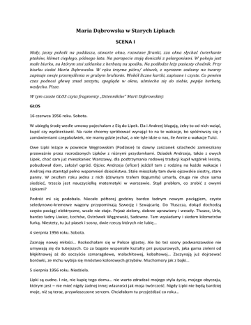 Maria Dąbrowska w Starych Lipkach SCENA I Mały, jasny pokoik na poddaszu, otwarte okno, rozwiane firanki, zza okna słychać ćwierkanie ptaków, klimat ciepłego, późnego lata. Na parapecie stoją doniczki z pelargoniami. W pokoju jest małe biurko, na którym stoi szklanka z herbatą na spodku. Na podłodze leży pasiasty chodnik. Przy biurku siedzi Maria Dąbrowska. W ręku trzyma pióro/ ołówek, z wyrazem zadumy na twarzy zapisuje swoje przemyślenia w grubym brulionie. Wokół liczne kartki, zapisane i czyste. Co pewien czas podnosi głowę znad zeszytu, spogląda w okno, uśmiecha się do siebie, popija herbatę, wzdycha. Pisze. W tym czasie GLOS czyta fragmenty „Dzienników” Marii Dąbrowskiej: GŁOS 16 czerwca 1956 roku. Sobota. W ubiegłą środę wedle umowy pojechałam z Elą do Lipek. Ela i Andrzej błagają, żeby to od nich wziąć, kupić czy wydzierżawić. Na razie chcemy spróbować wynająć to na te wakacje, bo spóźniwszy się z zamówieniami czegokolwiek, nie mamy gdzie jechać, a nie tyle idzie o nas, ile Annie o wakacje Tulci. Owe Lipki leżące w powiecie Węgrowskim (Podlasie) to dawny zaścianek szlachecki zamieszkany przeważnie przez rozrodzonych Lipków z różnymi przydomkami. Dziadek Andrzeja, także z owych Lipek, choć sam już mieszkaniec Warszawy, dla podtrzymania rodowej tradycji kupił wzgórek lesisty, pobudował dom, założył ogród. Ojciec Andrzeja (oficer) jeździł tam z rodziną na każde wakacje i Andrzej ma stamtąd pełno wspomnień dzieciństwa. Stale mieszkały tam dwie ojcowskie siostry, stare panny. W zeszłym roku jedna z nich (dziwnym trafem Bogumiła) umarła, druga nie chce sama siedzieć, trzecia jest nauczycielką matematyki w warszawie. Stąd problem, co zrobić z owymi Lipkami? Podróż mi się podobała. Niecałe półtorej godziny bardzo ładnym nowym pociągiem, czyste seledynowo-kremowe wagony przypominają Szwecję i Szwajcarię. Do Tłuszcza, dokąd dochodzą często pociągi elektryczne, wcale nie staje. Pejzaż zielony, dobrze uprawiony i wesoły. Tłuszcz, Urle, bardzo ładny Liwiec, Łochów, Ostrówek Węgrowski, Sadowne. Tam wysiadamy i siedem kilometrów furką. Niestety, tu już piasek i sosny, dwie rzeczy których nie lubię… 4 sierpnia 1956 roku. Sobota. Zaznaję nowej miłości… Rozkochałam się w Polsce iglastej. Ale bo też sosny podwarszawskie nie umywają się do tutejszych. Co za bogate wspaniałe kształty pni purpurowych, jaka gama zieleni od błękitnawej aż do soczyście szmaragdowe, malachitowej, kobaltowej… Zaczynają już dojrzewać borówki, ze mchu wybija się mnóstwo kolorowych grzybów. Muchomory jak z bajki… 5 sierpnia 1956 roku. Niedziela. Lipki są cudne. I nie, nie kupię tego domu… nie warto zdradzać mojego stylu życia, mojego obyczaju, którym jest – nie mieć nigdy żadnej innej własności jak moja twórczość. Nigdy Lipki nie będą bardziej moje, niż są teraz, przywłaszczone sercem. Chciałabym tu przyjeżdżać co roku… SCENA II Wnętrze wiejskiej kuchni, przy jednej ścianie stoi kredens, na środku stoi stół i 2-3 krzesła. Na podłodze leży chodnik, widać zamknięte okno, na parapecie stoją doniczki z pelargoniami. Kobieta I – Gospodyni krząta się przy kredensie, Maria Dąbrowska siedzi przy stole, popija herbatę. Słychać pukanie, raptownie otwierają się drzwi i wchodzi Kobieta II – Chudzikowa. CHUDZIKOWA -Pochwalony! Gospodyni się odwraca od kredensu, Maria Dąbrowska odwraca głowę w kierunku gościa. Nie czekając na odpowiedź Chudzikowa od progu mówi: -U nas wielka sensacja! Młócą motorem! MARIA DĄBROWSKA Przerywa z zaciekawieniem pytając -Jak to motorem? CHUDZIKOWA -Motorem! Wielka młockarnia stoi na klepisku i wypełnia cale przejście między sąsiekami. To już nie „parówka”, to motorek na benzynę. Ten motorek stoi pośrodku podwórza na podstawce na czterech zielonych kółkach z szerokimi obręczami. MARIA DĄBROWSKA -To teraz robota szybko pójdzie! CHUDZIKOWA -A nie! Kochana Pani, pożyczka motoru za droga. I jeszcze dziesięciu ludzi musieliśmy nająć! MARIA DĄBROWSKA -Aż tylu ludzi? To faktycznie drogo! CHUDZIKOWA -Oj drogo, kochana Pani, drogo! A jeszcze wódki nie mogliśmy dla nich kupić! W stoczku zabrakło, a spółdzielnia w Lipkach nie sprzedaje! Dopiero dziś rano dowieźli i mój pojechał do Stoczka i wódkę kupił. I dopiero w południe zaczęliśmy! SCENA III Maria Dąbrowska siedzi przy stole, popija herbatę i notuje. GŁOS 16 sierpnia 1956 roku. Czwartek. Pytałam Chudzikową, ile płaci się dniówki najętemu robotnikowi. 80 zł i pięć razy na dzień życie. I to musi być dobre życie, bo inaczej pomstują i nie chcą robić. Pobierająca za kosiarzem bierze 70 zł i życie. Także para żniwiarzy kosztuje 150 zł oprócz świadczeń w naturze. W PGR-ach państwo płaci dniówkę 14 zł bez życia. To jak te PGR-y mogą już nie dobrze, ale w ogóle gospodarować? SCENA IV Maria Dąbrowska siedzi przy stole, przy którym stoją 4 krzesła i popija herbatę i notuje. GŁOS 27 kwietnia 1957 roku. Sobota. 18 kwietnia wyjechaliśmy naszym autem na święta do Lipek. Jurek dobrze prowadził, ale na piaskach podlaskich nie dal rady i uszkodził trochę auto… Poznałyśmy w Lipkach księdza Terlikowskiego ze Stoczka. Przepyszna postać, też monologista, ale z jego opowiadań można by nowego podlaskiego „Pana Tadeusza” ułożyć… Przyjechał do Państwa u których mieszkaliśmy na wielkanocne śniadanie… Maria Dąbrowska schodzi ze sceny. Na scenie zostaje stół i 4 krzesła. Dwie osoby wnosi na stół 4 nakrycia ( talerze i sztućce) i talerz z pisankami. Wchodzi ksiądz, Maria Dąbrowska i dwoje gospodarzy, siadają przy stole. W czasie spożywania posiłku toczy się rozmowa. KSIĄDZ Zwracając się do Marii Dąbrowskiej -Mam, Szanowna Pani, w parafii kronikę, pisaną, sprzed stu lat. Kiedyś proboszcz ze Stoczka miał karczmę… GOSPODARZ Pyta ze zdziwieniem -Karczm