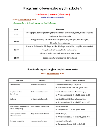Program obowiązkowych szkoleń Studia stacjonarne ( dzienne ) studia pierwszego stopnia dzień: 3 października 2016 miejsce: aula nr 1, II piętro przy ul. Kozietulskiego godz. 9.00 kierunek Pedagogika, Edukacja artystyczna w zakresie sztuki muzycznej, Praca Socjalna, Socjologia, Administracja Pielęgniarstwo, Ratownictwo medyczne, Fizjoterapia, Matematyka, 10.00 Biologia, Kosmetologia Historia, Politologia, Filologia polska, Filologia (angielska, rosyjska, niemiecka), 11.00 Turystyka i rekreacja, Fizyka techniczna, Edukacja techniczno-informatyczna, Geografia 12.00 Bezpieczeństwo narodowe, Zarządzanie Spotkanie organizacyjne z opiekunem roku dzień: 3 października 2016 Kierunek Administracja opiekun dr Rafał Kuligowski miejsce i godz. spotkania Katedra Administracji i Socjologii, ul. Westerplatte 64, sala 216, godz. 10.00 Bezpieczeństwo Narodowe Dr Ireneusz Bieniecki Biologia dr Agnieszka Parzych Instytut Bezpieczeństwa Narodowego, ul. Arciszewskiego 22 d, sala 16, godz. 11.00 Instytut Biologii i Ochrony Środowiska, ul. Arciszewskiego 22 b, sala 106, godz. 8.15 Edukacja art. w zakresie sztuki muzycznej Mgr Medea Berianidze Edukacja technicznoinformatyczna Mgr Damian Stoltmann Filologia angielska mgr Agata Adamska Instytut Muzyki, ul. Partyzantów 27, s.105, godz. 11.00 Instytut Fizyki, ul. Arciszewskiego 22 b, aula 105, godz. 9.45 Instytut Neofilologii, ul. Słowiańska 8, aula 019, godz. 9.00 Filologia germańska dr Monika Bielska Instytut Neofilologii, ul. Słowiańska 8, sala 126, godz. 9.00 Filologia polska Dr Małgorzata Matusiak Instytut Polonistyki, ul. Arciszewskiego 22 A, sala 50, godz. 10:00 Filologia rosyjska dr Marzena Rycielska Instytut Neofilologii, ul. Słowiańska 8, sala 228, godz. 9.00 Fizjoterapia dr Aleksandra Kulczyk Instytut Nauk o Zdrowiu, ul. Westerplatte 64, sala 115, godz. 11.00 Fizyka techniczna Dr Roman Majchrowski Instytut Fizyki, ul. Arciszewskiego 22 b, sala 102, godz. 9.00 Geografia dr Joanna Gadziszewska Instytut Geografii i Studiów Regionalnych ul. Partyzantów 27, sala 13, godz. 13.30 Historia Dr Wojciech Bejda Instytut Historii i Politologii, ul. Arciszewskiego 22a, s.28, godz. 10.00 Kosmetologia dr Brygida Radawiec Instytut Biologii i Ochrony Środowiska, ul. Arciszewskiego 22 b, sala 7, godz. 8.15 Matematyka dr Irena Dominik Instytut Matematyki, ul. Kozietulskiego, aula II piętro, godz. 9.30 Pedagogika dr Ewa Murawska Instytut Pedagogiki i Pracy Socjalnej ul. Kozietulskiego, aula 1 II piętro, godz. 8.00 Pielęgniarstwo mgr Regina Berbeć Instytut Nauk o Zdrowiu, ul. Westerplatte 64, sala 114, godz. 11.00 Politologia Dr Sylwia Górzna Instytut Historii i Politologii, ul. Arciszewskiego 22a, s.30, godz. 10.00 Praca socjalna Ratownictwo medyczne mgr Klaudia Żelechowska-Durka Instytut Pedagogiki i Pracy Socjalnej mgr Monika Rut Instytut Nauk o Zdrowiu, ul. Westerplatte 64, sala 302, godz. 8.00 ul. Westerplatte 64, sala 114, godz. 11.00 Socjologia mgr Agnieszka Próchniak Katedra Administracji i Socjologii, ul. Westerplatte 64, sala 506, godz. 10.00 Turystyka i rekreacja mgr Łukasz Marszałek Instytut Geografii i Studiów Regionalnych ul. Partyzantów 27, sala 13, godz. 13.30 Zarządzanie Mgr Aldona Kulikowska Instytut Bezpieczeństwa Narodowego, ul. Arciszewskiego 22 d, sala 28, godzina 11.00 Zarządzanie (wieczorowe) Mgr Aldona Kulikowska Instytut Bezpieczeństwa Narodowego, ul. Arciszewskiego 22 d, sala 26, godzina 17.00 Program obowiązkowych szkoleń Studia niestacjonarne ( zaoczne ) studia pierwszego stopnia dzień: 7 października 2016 miejsce: aula - s.414, III piętro przy ul. Boh. Westerplatte 64 godz. 15.00 kierunek Pedagogika, Bezpieczeństwo narodowe, Filologia angielska, Praca Socjalna, Administracja, Ratownictwo medyczne, Zarządzanie, Kosmetologia Spotkanie organizacyjne z opiekunem roku dzień: 7 października 2016 Kierunek opiekun miejsce i godz. spotkania Administracja dr Rafał Kuligowski Katedra Administracji i Socjologii, ul. Westerplatte 64, sala 214, godz. 16.00 Bezpieczeństwo Narodowe Mgr Aneta Kamińska Nawrot Instytut Bezpieczeństwa Narodowego, Filologia angielska dr Marta Gierczyńska-Kolas Instytut Neofilologii, ul. Arciszewskiego 22 d, sala 16, godzina 17.00 ul. Słowiańska 8, sala 010, godz. 16.30 Kosmetologia dr Józef Antonowicz Instytut Biologii i Ochrony Środowiska, ul. Arciszewskiego 22 b,, sala 7, godz. 16.30 Pedagogika mgr Marta Gliniecka Instytut Pedagogiki i Pracy Socjalnej ul. Westerplatte 64, sala 414, godz. 17.00 Praca socjalna mgr Ryszard Sitek Instytut Pedagogiki i Pracy Socjalnej ul. Westerplatte 64, sala 302, godz. 17.00 Ratownictwo medyczne dr Elżbieta Grygorowicz Instytut Nauk o Zdrowiu, ul. Westerplatte 64, sala 114, godz. 16.00 Zarządzanie Mgr Ewa Białek Instytut Bezpieczeństwa Narodowego, ul. Arciszewskiego 22 d, sala 28, godzina 17.00
