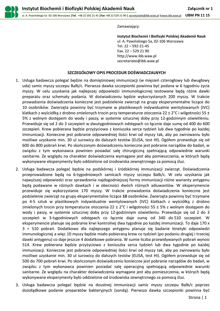 Instytut Biochemii i Biofizyki Polskiej Akademii Nauk ul. A. Pawińskiego 5a 02-106 Warszawa |Tel. +48 22 592 21 45 |Fax +48 22 529 21 90 | [email protected] |www.ibb.waw.pl Załącznik nr 1 UBM PN 11 15 Zamawiający: Instytut Biochemii i Biofizyki Polskiej Akademii Nauk ul. A. Pawińskiego 5a, 02-106 Warszawa Tel. 22 – 592-21-45 Fax. 22 – 529 21 90 http://www.ibb.waw.pl [email protected] SZCZEGÓŁOWY OPIS PROCEDUR DOŚWIADCZALNYCH 1. Usługa badawcza polegać będzie na domięśniowej immunizacji (w mięsień czterogłowy lub dwugłowy uda) samic myszy szczepu Balb/c. Pierwsza dawka szczepionki powinna być podana w 6 tygodniu życia myszy. W celu uzyskania jak najlepszej odpowiedzi immunologicznej testowane będą różne dawki preparatu oraz schematy podania. W doświadczeniu będzie wykorzystanych 200 myszy. W trakcie prowadzenia doświadczenia konieczne jest podzielenie zwierząt na grupy eksperymentalne liczące do 10 osobników. Zwierzęta powinny być trzymane w plastikowych indywidualnie wentylowanych (IVC) klatkach z wyściółką z drobno zmielonych trocin przy temperaturze otoczenia 22 ± 2°C i wilgotności 55 ± 5% z wolnym dostępem do wody i paszy, w systemie sztucznej doby przy 12-godzinnym oświetleniu. Przewiduje się od 2 do 3 szczepień w dwutygodniowych odstępach co łącznie daje sumę od 400 do 600 szczepień. Krew pobierana będzie przyżyciowo z koniuszka serca tydzień lub dwa tygodnie po każdej immunizacji. Konieczne jest pobranie odpowiedniej ilości krwi od myszy tak, aby po zwirowaniu było możliwe uzyskanie min. 30 ul surowicy do dalszych testów (ELISA, test HI). Ogółem przewiduje się od 600 do 800 pobrań krwi. Po skończonym doświadczeniu konieczne jest pobranie narządów do badań, w związku z tym wykonawca powinien posiadać salę chirurgiczną spełniającą odpowiednie warunki sanitarne. Ze względu na charakter doświadczenia wymagane jest aby pomieszczenia, w których będą wykonywane eksperymenty było oddzielone od środowiska zewnętrznego za pomocą śluz. 2. Usługa badawcza polegać będzie na podskórnej i śródskórnej immunizacji zwierząt. Doświadczenia przeprowadzone będą na 6-tygodniowych samicach myszy szczepu Balb/c. W celu uzyskania jak najwyższej odpowiedzi oraz sprawdzenia najdogodniejszej formy immunizacji różne warianty antygenu będą podawane w różnych dawkach i w obecności dwóch różnych adiuwantów. W eksperymencie przewiduje się wykorzystanie 170 myszy. W trakcie prowadzenia doświadczenia konieczne jest podzielenie zwierząt na grupy eksperymentalne liczące 10 osobników. Zwierzęta powinny być trzymane po 4-5 sztuk w plastikowych indywidualnie wentylowanych (IVC) klatkach z wyściółką z drobno zmielonych trocin przy temperaturze otoczenia 22 ± 2°C i wilgotności 55 ± 5% z wolnym dostępem do wody i paszy, w systemie sztucznej doby przy 12-godzinnym oświetleniu. Przewiduje się od 2 do 3 szczepień w 3-tygodniowych odstępach co łącznie daje sumę od 340 do 510 szczepień. W eksperymencie planuje się pobranie krwi kontrolnej dwa tygodnie po każdej immunizacji. To daje 170 x 3 = 510 pobrań. Dodatkowo dla najlepszego antygenu planuje się badanie kinetyki odpowiedzi immunologicznej a więc 10 myszy będzie miało pobieraną krew co tydzień (po podaniu drugiej i trzeciej dawki antygenu) co daje jeszcze 4 dodatkowe pobrania. W sumie liczba przewidywanych pobrań wynosi 514. Krew pobierana będzie przyżyciowo z koniuszka serca tydzień lub dwa tygodnie po każdej immunizacji. Konieczne jest pobranie odpowiedniej ilości krwi od myszy tak, aby po zwirowaniu było możliwe uzyskanie min. 30 ul surowicy do dalszych testów (ELISA, test HI). Ogółem przewiduje się od 500 do 700 pobrań krwi. Po skończonym doświadczeniu konieczne jest pobranie narządów do badań, w związku z tym wykonawca powinien posiadać salę operacyjną spełniającą odpowiednie warunki sanitarne. Ze względu na charakter doświadczenia wymagane jest aby pomieszczenia, w których będą wykonywane eksperymenty było oddzielone od środowiska zewnętrznego za pomocą śluz. 3. Usługa badawcza polegać będzie na doustnej immunizacji samic myszy szczepu Balb/c poprzez dożołądkowe podanie preparatów bakteryjnych (sondą). Pierwsza dawka szczepionki powinna być Strona | 1 Instytut Biochemii i Biofizyki Polskiej Akademii Nauk ul. A. Pawińskiego 5a 02-106 Warszawa |Tel. +48 22 592 21 45 |Fax +48 22 529 21 90 | [email protected] |www.ibb.waw.pl Załącznik nr 1 UBM PN 11 15 podana w 6 tygodniu życia myszy. W celu uzyskania jak najlepszej odpowiedzi testowane będą różne preparaty bakteryjne oraz schematy podania. W doświadczeniu będzie wykorzystanych łącznie 150 myszy. W trakcie prowadzenia doświadczenia konieczne jest podzielenie zwierząt na grupy eksperymentalne liczące do 10 osobników. Zwierzęta powinny być trzymane w plastikowych indywidualnie wentylowanych (IVC) klatkach z wyściółką z drobno zmielonych trocin przy temperaturze otoczenia 22 ± 2°C i wilgotności 55 ± 5% z wolnym dostępem do wody i paszy, w systemie sztucznej doby przy 12-godzinnym oświetleniu. Przewiduje się od 5 do 7 szczepień w 2-3 tygodniowych odstępach co łącznie daje sumę od 750 do 1050 szczepień W eksperymencie planuje się pobranie krwi kontrolnej przed podaniem pierwszej dawki antygenu a następnie dwa tygodnie po każdej immunizacji. Ogółem przewiduje się od 900 pobrań krwi Konieczne jest pobranie odpowiedniej ilości krwi od myszy tak, aby po zwirowaniu było możliwe uzyskanie min. 30 ul surowicy do dalszych testów (ELISA, test HI). Z jednoczesnym pobraniem krwi, przewiduje się również pobieranie odchodów mysich do dalszych doświadczeń. Ze względu na charakter doświadczenia wymagane jest aby pomieszczenia, w których będą wykonywane eksperymenty było oddzielone od środowiska zewnętrznego za pomocą śluz. Po zakończeniu doświadczenia zwierzęta poddane zostaną humanitarnej eutana