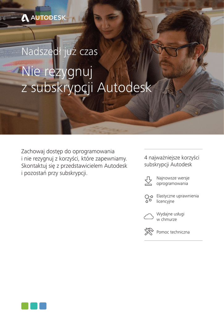 Nadszedł już czas Nie rezygnuj z subskrypcji Autodesk Zachowaj dostęp do oprogramowania i nie rezygnuj z korzyści, które zapewniamy. Skontaktuj się z przedstawicielem Autodesk i pozostań przy subskrypcji. 4 najważniejsze korzyści subskrypcji Autodesk Najnowsze wersje oprogramowania Elastyczne uprawnienia licencyjne Wydajne usługi w chmurze Pomoc techniczna Zdobądź taniej najnowsze wersje oprogramowania Subskrypcja Autodesk® stanowi elastyczny i opłacalny sposób uzyskania dostępu do najnowszych wersji oprogramowania projektowego. Subskrypcja produktów Autodesk jest równie prosta, co skalowalna, a mając do wyboru szereg opcji można z łatwością dobrać najlepszą z nich pod kątem budżetu i wymagań projektowych. Jeśli chcesz zachować przewagę nad konkurencją, powinieneś korzystać z najnowszego i najlepszego na rynku oprogramowania. Jeszcze dziś skontaktuj się z autoryzowanym przedstawicielem Autodesk i wznów subskrypcję. Dzięki nowym rozszerzeniom produktu Twoje narzędzia projektowe nie stracą na aktualności Bez względu na to, czy rozbudowujesz swój zespół, czy też starasz się przydzielić więcej zadań obecnym pracownikom, utrzymanie wysokiego poziomu wydajności ma decydujące znaczenie. Efektywna praca wymaga innowacyjnego i optymalnego oprogramowania – narzędzia, dzięki któremu pracujesz szybciej i jesteś bardziej konkurencyjny. Subskrybenci Autodesk mają dostęp do najnowszych aktualizacji i rozszerzeń oprogramowania już w chwili ich wydania*. Stały dostęp do najnowszych narzędzi projektowych i usług w chmurze umożliwia realizację zadań, których nie da się wykonać z użyciem przestarzałej technologii. A to z kolei zapewnia utrzymanie przewagi nad konkurencją. Utrzymaj wydajność firmy dzięki elastycznym uprawnieniom licencyjnym Współpraca w obrębie wewnętrznych i zewnętrznych zespołów wymaga odpowiedniego oprogramowania, które dostępne jest zawsze we właściwym miejscu i czasie. Elastyczne prawa licencyjne, obejmujące uprawnienia do korzystania z poprzednich wersji oraz dostępu do oprogramowania na wielu komputerach, na całym świecie**, dają tę możliwość. Możesz mieć dostęp do najnowszego oprogramowania i jego poprzednich wersji, pracować na komputerze w biurze i w domu, a także wykonywać pracę poza swoim krajem zamieszkania.** Narzędzia w chmurze umożliwiają rozwinięcie procesów projektowych Jeśli Twoim zadaniem jest wizualizacja, optymalizacja i udostępnianie większej ilości opcji projektowych członkom zespołu i klientom w różnych miejscach, to subskrypcja umożliwi Ci zwiększenie mobilności, uproszczenie współpracy oraz optymalizację i analizę projektów dzięki uprzywilejowanemu dostępowi do szeregu usług w chmurze**. Usługi te wykorzystują niemal nieograniczoną moc obliczeniową chmury i umożliwiają realizację złożonych zadań, jak analiza i rendering, bez angażowania w to własnego komputera. Pomoc techniczna umożliwia utrzymanie wydajności W razie pojawienia się problemów konieczne jest szybkie ich rozwiązanie, by minimalizować przestoje i nie dopuścić do powstania zaległości. Będąc subskrybentem Autodesk masz pełny dostęp do pomocy technicznej – od przewodników, przez społecznościowe fora dyskusyjne, po wsparcie ze strony specjalistów – zatem z łatwością rozwiążesz każdy problem związany z danym produktem. Narzędzia zarządzania do monitorowania Twojej inwestycji Zarządzanie licencjami oprogramowania, jego wieloma wersjami i wykorzystaniem może być trudne i czasochłonne. Narzędzia w portalu Autodesk Account i raporty online umożliwiają zarządzanie dostępem do produktów i usług przez poszczególnych użytkowników, aktualizacjami produktów, odnowieniami oraz stopniem wykorzystania chmury. Możesz teraz bardziej poświęcić się pracy i mniej czasu spędzać na zarządzaniu oprogramowaniem. Kontynuuj subskrypcję z korzyścią dla Twojej firmy! Już dziś skontaktuj się z przedstawicielem Autodesk! Korzyści wynikające z subskrypcji określone są warunkami umowy. Nie wszystkie korzyści i oferty mogą być dostępne w odniesieniu do wszystkich produktów i/lub we wszystkich językach. Dostęp do usług w chmurze wymaga połączenia internetowego i zależy od ograniczeń geograficznych określonych w Warunkach świadczenia usług. * Subskrybenci Autodesk na całym świecie mogą pobrać aktualizacje oprogramowania, zarówno pojedynczych produktów jak i pakietów, poprzez portal Autodesk Account pod adresem: https://accounts.autodesk.com. ** Dostęp globalny zależy od oprogramowania zakupionego w kraju zamieszkania subskrybenta. Więcej informacji podano w Warunkach Autodesk. ***Dostęp do usług w chmurze wymaga połączenia internetowego i zależy od ograniczeń geograficznych określonych w Warunkach świadczenia usług. Autodesk and the Autodesk logo are registered trademarks or trademarks of Autodesk, Inc., and/or its subsidiaries and/or affiliates in the USA and/or other countries. All other brand names, product names, or trademarks belong to their respective holders. Autodesk reserves the right to alter product and services offerings, and specifications and pricing at any time without notice, and is not responsible for typographical or graphical errors that may appear in this document. © 2016 Autodesk, Inc. All rights reserved.