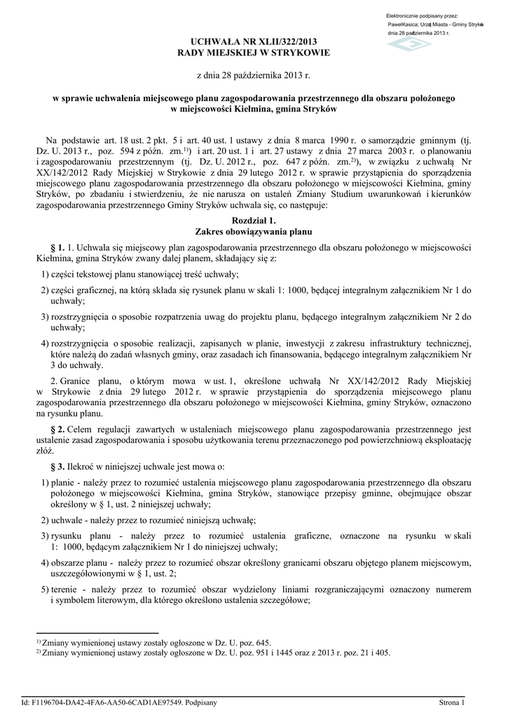 Elektronicznie podpisany przez: Paweł Kasica; Urząd Miasta - Gminy Stryków dnia 28 października 2013 r. UCHWAŁA NR XLII/322/2013 RADY MIEJSKIEJ W STRYKOWIE z dnia 28 października 2013 r. w sprawie uchwalenia miejscowego planu zagospodarowania przestrzennego dla obszaru położonego w miejscowości Kiełmina, gmina Stryków Na podstawie art. 18 ust. 2 pkt. 5 i art. 40 ust. 1 ustawy z dnia 8 marca 1990 r. o samorządzie gminnym (tj. Dz. U. 2013 r., poz. 594 z późn. zm.1)) i art. 20 ust. 1 i art. 27 ustawy z dnia 27 marca 2003 r. o planowaniu i zagospodarowaniu przestrzennym (tj. Dz. U. 2012 r., poz. 647 z późn. zm.2)), w związku z uchwałą Nr XX/142/2012 Rady Miejskiej w Strykowie z dnia 29 lutego 2012 r. w sprawie przystąpienia do sporządzenia miejscowego planu zagospodarowania przestrzennego dla obszaru położonego w miejscowości Kiełmina, gminy Stryków, po zbadaniu i stwierdzeniu, że nie narusza on ustaleń Zmiany Studium uwarunkowań i kierunków zagospodarowania przestrzennego Gminy Stryków uchwala się, co następuje: Rozdział 1. Zakres obowiązywania planu § 1. 1. Uchwala się miejscowy plan zagospodarowania przestrzennego dla obszaru położonego w miejscowości Kiełmina, gmina Stryków zwany dalej planem, składający się z: 1) części tekstowej planu stanowiącej treść uchwały; 2) części graficznej, na którą składa się rysunek planu w skali 1: 1000, będącej integralnym załącznikiem Nr 1 do uchwały; 3) rozstrzygnięcia o sposobie rozpatrzenia uwag do projektu planu, będącego integralnym załącznikiem Nr 2 do uchwały; 4) rozstrzygnięcia o sposobie realizacji, zapisanych w planie, inwestycji z zakresu infrastruktury technicznej, które należą do zadań własnych gminy, oraz zasadach ich finansowania, będącego integralnym załącznikiem Nr 3 do uchwały. 2. Granice planu, o którym mowa w ust. 1, określone uchwałą Nr XX/142/2012 Rady Miejskiej w Strykowie z dnia 29 lutego 2012 r. w sprawie przystąpienia do sporządzenia miejscowego planu zagospodarowania przestrzennego dla obszaru położonego w miejscowości Kiełmina, gminy Stryków, oznaczono na rysunku planu. § 2. Celem regulacji zawartych w ustaleniach miejscowego planu zagospodarowania przestrzennego jest ustalenie zasad zagospodarowania i sposobu użytkowania terenu przeznaczonego pod powierzchniową eksploatację złóż. § 3. Ilekroć w niniejszej uchwale jest mowa o: 1) planie - należy przez to rozumieć ustalenia miejscowego planu zagospodarowania przestrzennego dla obszaru położonego w miejscowości Kiełmina, gmina Stryków, stanowiące przepisy gminne, obejmujące obszar określony w § 1, ust. 2 niniejszej uchwały; 2) uchwale - należy przez to rozumieć niniejszą uchwałę; 3) rysunku planu - należy przez to rozumieć ustalenia graficzne, oznaczone na rysunku w skali 1: 1000, będącym załącznikiem Nr 1 do niniejszej uchwały; 4) obszarze planu - należy przez to rozumieć obszar określony granicami obszaru objętego planem miejscowym, uszczegółowionymi w § 1, ust. 2; 5) terenie - należy przez to rozumieć obszar wydzielony liniami rozgraniczającymi oznaczony numerem i symbolem literowym, dla którego określono ustalenia szczegółowe; 1) Zmiany 2) Zmiany wymienionej ustawy zostały ogłoszone w Dz. U. poz. 645. wymienionej ustawy zostały ogłoszone w Dz. U. poz. 951 i 1445 oraz z 2013 r. poz. 21 i 405. Id: F1196704-DA42-4FA6-AA50-6CAD1AE97549. Podpisany Strona 1 6) przeznaczeniu podstawowym – należy przez to rozumieć określony w planie rodzaj przeznaczenia, który dominuje lub będzie dominować na danym terenie; 7) przeznaczeniu uzupełniającym - należy przez to rozumieć rodzaje przeznaczenia inne niż podstawowe, które uzupełniają lub wzbogacają przeznaczenie podstawowe; 8) tablicach i urządzeniach reklamowych - należy przez to rozumieć nośnik informacji wizualnej w jakiejkolwiek materialnej formie wraz z elementami konstrukcyjnymi i zamocowaniami, umieszczony w polu widzenia użytkowników drogi, niebędący znakiem w rozumieniu przepisów o znakach i sygnałach lub znakiem informującym o obiektach użyteczności publicznej ustawionym przez gminę; 9) nośniku informacji wizualnej - należy przez to rozumieć urządzenia wraz z konstrukcja nośną, służące reklamie; 10) reklamie - należy przez to rozumieć przekaz handlowy, pochodzący od podmiotu publicznego lub prywatnego, w związku z jego działalnością gospodarczą lub zawodową, zmierzający do promocji sprzedaży lub odpłatnego korzystania z towarów lub usług. § 4. 1. W planie ustala się: 1) przeznaczenie terenów oraz linie rozgraniczające tereny o różnym przeznaczeniu lub różnych zasadach zagospodarowania; 2) zasady ochrony i kształtowania ładu przestrzennego; 3) zasady ochrony środowiska, przyrody i krajobrazu kulturowego; 4) zasady kształtowania zabudowy oraz wskaźniki zagospodarowania terenu; 5) szczegółowe zasady i warunki scalania i podziału nieruchomości objętych planem miejscowym; 6) szczególne warunki zagospodarowania terenów, oraz ograniczenia w ich użytkowaniu, w tym zakaz zabudowy; 7) zasady modernizacji, rozbudowy i budowy systemów komunikacji i infrastruktury technicznej; 8) sposób i termin tymczasowego zagospodarowania, urządzania i użytkowania terenów; 9) stawki procentowe, na podstawie których ustala się opłatę z tytułu wzrostu wartości nieruchomości, w związku z uchwaleniem planu. 2. Ustalenia planu określone są w treści uchwały oraz na rysunku planu. § 5. 1. Na rysunku planu przedstawiono graficznie: 1) granicę obszaru objętego planem miejscowym; 2) linie rozgraniczające tereny o różnym przeznaczeniu lub różnych zasadach zagospodarowania; 3) granicę udokumentowanych złóż kopalin; 4) teren powierzchniowej eksploatacji złóż; 5) teren drogi lokalnej. 2. Pozostałe oznaczenia graficzne na rysunku planu mają charakter informacyjny. § 6. Plan wyodrębnia tereny o różnym przeznaczeniu lub różn