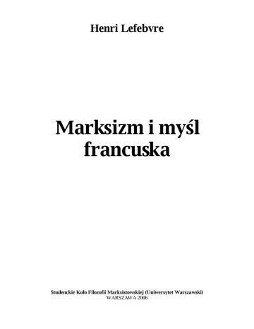 Henri Lefebvre Marksizm i myśl francuska Studenckie Koło Filozofii Marksistowskiej (Uniwersytet Warszawski) WARSZAWA 2006 Henri Lefebvre – Marksizm i myśl francuska (1957 rok) „Marksizm i myśl francuska” to esej z 1957 roku napisany specjalnie dla polskiego czytelnika przez jednego z czołowych francuskich socjologów i filozofów marksistowskich Henri Lefebvre'a. Niniejsze wydanie ma za podstawę czasopismo społeczno-literackie „Twórczość”, nr 4 z 1957 r. Tłumaczenie z języka francuskiego: Jan Strzelecki. Korekta: Piotr Strębski. -2© Studenckie Koło Filozofii Marksistowskiej (UW) www.skfm-uw.w.pl Henri Lefebvre – Marksizm i myśl francuska (1957 rok) Oczywistą jest rzeczą, że sytuacja myśli marksistowskiej w dzisiejszej Francji wiąże się ściśle z ogólną sytuacją w filozofii, a tej z kolei nie można oddzielać od zjawisk gospodarczych i politycznych. Marksista chciałby mieć tu prawo do rozgłoszenia tezy, że w obliczu powolnego, lecz nieuchronnego rozkładu myśli mieszczańskiej myśl marksistowska dumnie wznosi czoło, że błyszczy swą żywotnością, swą postawą, swą jasnością, że odcina się ostro od tła ogólnej posuchy i że w końcu, podsumowując, ukazuje wyraźnie drogę ku przyszłości. Na nieszczęście sprawa wygląda zupełnie inaczej. Orzeczenia oficjalne wypowiadane ze strony marksizmu są niestety równie fałszywe i złudne, co tezy przeciwników, rzeczników ideologii mieszczańskiej. Każdy „obóz” wynosi pod niebo swą chwałę i sławę; każdy „obóz” systematycznie wyszydza przeciwnika. Gdyby wierzyć anty- lub nie-marksistom, od Sartre'a do Merleau-Ponty lub Raymonda Arona, nie istnieje dziś myśl marksistowska, jeśli nawet założyć, że niegdyś istniała. Czytając zaś jedynie pisma „urzędowo” marksistowskie, dowiemy się, że z drugiej strony bytują jedynie trupy w stanie przewlekłego rozkładu. Rzeczą dość zabawną i śmieszną jest to, że obie strony przyjmują, implicite lub explicite, teorię dwu obozów, ze wszystkimi jej uproszczeniami i dodatkami do rzeczywistości. Prawdą jest, że zarówno w myśli francuskiej, jak gdzie indziej w świecie, istnieją dwie orientacje, dwie przeciwstawne tendencje – marksistowska i niemarksistowska, mniej lub więcej skierowana przeciw marksizmowi, lecz, w zależności od chwili, o zmiennym natężeniu i z dążnością do zapożyczania tematów, zagadnień i pojęć. Gdy kilka lat temu niektórzy pseudo-marksiści próbowali zamknąć w teoretycznym schemacie całą złożoność tej sytuacji, dokonali cięć w żywym ciele i zerwali mosty. W ruch, który niesie zarówno przeciwieństwa jak pewien rodzaj jedności, wprowadzili ideologiczną i logiczną szczerbę. Przeprowadzili niszczycielską operację, schematyzując życie, odpychając daleko wielu ludzi i lokując w jednym „obozie” wszystkich intelektualistów, którzy nie zajęli najwyraźniejszego, zarówno politycznego jak ideologicznego, stanowiska opowiadającego się za marksizmem-leninizmem, przedłużonym o stalinizm. To pozorne wyjaśnienie sytuacji zrobiło nieopisane zamieszanie. Po jednej stronie wszystko działo się rzekomo jak najlepiej, nie było cieni, panował życiodajny, cieszący oczy rozkwit. (To oficjalne kłamstwo, obok wielu innych, wywołuje jedynie śmiech.) Po drugiej – wszystko tonęło w dekadencji i w powszechnym upadku. (Z kolei to twierdzenie wywołuje niepokój swą niefrasobliwością.) Autor poniższego szkicu chciałby oprzeć swą analizę na poważniejszej i zdrowszej intelektualnie ocenie sytuacji. * Na początku warto raz jeszcze rzucić okiem na ubiegłe dwanaście lat. Wyzwolenie przekształciło podstawowe dane intelektualnego życia Francji: uległa zmianie tematyka refleksji, zagadnienia, pojęcia i postawy. Ograniczając się do filozofii (rozpatrywanej jako intelektualne sklepienie kultury, jako stężone streszczenie stanu ideologii) powiemy, że wyzwolenie ujawniło zanik kierunków myślowych, które przed wojną odgrywały znaczną i doniosłą rolę. Ich nurt, brutalnie przerwany przez wojnę, nie odnalazł z jej końcem dawnej żywotności. Stało się tak z wielu różnorodnych racji i powodów. Zeszli ze świata nosiciele tych prądów (Leon Brunschvicg, Bergson, później Alain), ale przede wszystkim zaważyło na szali to, że określane przez nich postawy wobec świata nie wytrzymały ani uderzenia wypadków, ani napływu nowych zagadnień. Intelektualizmowi Leona Brunschvicga nie brakło ani charakteru, ani wielkości. U swych początków wyrażał on językiem filozoficznych pojęć oburzenie, które ogarnęło francuskich intelektualistów na widok niesprawiedliwości, kłamstwa, ucisku w czasie sprawy Dreyfusa. Te głęboko zakorzenione uczucia ożywiały również inne, rozpoczynane w tym czasie, poszukiwania w dziedzinie filozofii i literatury (a mianowicie niezwykle doniosłe dzieło Roger Martin du Garda). Racjonalizm Brunschvicga przeciwstawiał się wszelkiemu wtargnięciu brutalnej siły w imię niezależności i wolności jednostkowego sądu. Przeciwstawiał się zatem wszelkim filozofiom, głoszącym nadrzędność pojęć i wszelkim filozofiom historii -3© Studenckie Koło Filozofii Marksistowskiej (UW) www.skfm-uw.w.pl Henri Lefebvre – Marksizm i myśl francuska (1957 rok) (a więc zarówno hegeliańskiej dialektyce, jak dialektycznemu materializmowi marksistów). Nie podporządkowywał jednak sądu jednostki czystemu indywidualizmowi: usiłował oprzeć go na podstawach, zrodzonych ze śledzenia rozwoju ludzkiego poznania i nauk przyrodniczych, a przede wszystkim rozwoju matematyki i fizyki matematycznej. Alain zajmował postawę podobną, jeśli chodziło o uznanie prymatu sądu jednostki (sądu o faktach czy o wartościach); nie szukał jednak mocnego oparcia w teorii poznania i poszczególnych naukach, lecz zmierzał w swym dziele w stronę luźnego eseju i czystego indywidualizmu. Stąd pochodzi zarówn