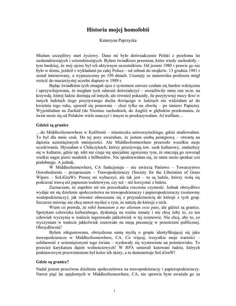 Historia mojej homofobii Katarzyna Paprzycka Miałam szczęśliwy start życiowy. Dane mi było doświadczenie Polski z przełomu lat siedemdziesiątych i osiemdziesiątych. Byłam świadkiem przemian, które wtedy zachodziły – tym bardziej, że mój ojciec był ich aktywnym uczestnikiem. Od jesieni 1980 r prawie go nie było w domu, jeździł z wykładami po całej Polsce – od zebrań do strajków. 13 grudnia 1981 r został internowany, a wypuszczony po 350 dniach. Usunięty ze stanowiska profesora mógł wrócić do macierzystej uczelni dopiero w 1989 r. Będąc świadkiem tych zmagań ojca z systemem zawsze czułam się bardzo wdzięczna i uprzywilejowana, że mogłam tych zdarzeń doświadczyć – uwrażliwiły mnie one m.in. na krzywdę, której ludzie doznają od innych, ale również pokazały, ile pozytywnej mocy tkwi w innych ludziach (tego pozytywnego ducha tkwiącego w ludziach nie widziałam aż do kwietnia tego roku, ujawnił się ponownie – choć tylko na chwilę – po śmierci Papieża). Wyjeżdżałam na Zachód (do Niemiec zachodnich, do Anglii) w głębokim przekonaniu, że świat może się od Polaków wiele nauczyć i innym to przekazywałam. Aż trafiłam… Gdzieś są granice …do Middleofsomewhere w Kalifornii – miasteczka uniwersyteckiego, gdzie studiowałam. To był dla mnie szok. Do tej pory uważałam, że jestem osobą postępową – otwartą na dążenia uciemiężonych mniejszości. Ale Middleofsomewhere przerosło wszelkie moje oczekiwania. Słyszałam o Chińczykach, którzy przeżywają tzw. szok kulturowy, znalazłszy się w kulturze, gdzie np. nikt nie czuje się specjalnie zgorszony tym, że otaczają go zewsząd wielkie nagie piersi modelek z billbordów. Nie spodziewałam się, że mnie może spotkać coś podobnego. A jednak. W Middleofsomewhere, CA funkcjonuje – nie uwierzą Państwo – Towarzystwo Oswobodzenia – przepraszam – Trawopodcieraczy (Society for the Liberation of Grass Wipers – SoLiGraW). Proszę mi wybaczyć, ale tak jest – to są ludzie, którzy wolą się podcierać trawą niż papierem toaletowym, czy też – niż korzystać z bidetu. Zaznaczam, że zupełnie mi nie przeszkadza rzeczona czynność. Jednak obrzydliwe wydaje mi się dzielenie społeczeństwa na trawopodcieraczy i papieropodcieraczy (zostawmy wodopodcieraczy), jak również obnoszenie się z przynależnością do którejś z tych grup. Szczerze mówiąc nie chcę nawet myśleć o tym, że należę do którejś z nich. Wiem co prawda, że nihil humanum a me alienum esse puto, ale gdzieś są granice. Spotykam człowieka kulturalnego, dyskutuję na ważne tematy i nie chcę żeby to, co ten człowiek wyczynia w toalecie ingerowało jakkolwiek w tej rozmowie. Nie chcę, aby to, co wyczyniam w toalecie jakkolwiek rzutowało na moją prezencję w przestrzeni publicznej. Obrzydliwość! Byłam zdegustowana, obrzydzona samą myślą o grupie identyfikującej się jako trawopodcieracze w Middleofsomewhere, CA. Co więcej, wszystkie moje wartości – solidarność z uciemiężonymi tego świata – wydawały się wystawione na pośmiewisko. To przecież karykatura dążeń wolnościowych! W RPA umierali katowani ludzie, których podstawowym przewinieniem był kolor ich skóry, a tu demonstruje SoLiGraW! Gdzie są granice? Nadal jestem przeciwna dzieleniu społeczeństwa na trawopodcieraczy i papieropodcieraczy. Nawet pięć lat spędzonych w Middleofsomewhere, CA, nie sprawia bym uważała go za 1 ważny podział społeczny. Chwila refleksji wystarczy by się okazało, że jednak nawet ta kwestia prowadzi do pewnych problemów społecznych. Bo niby dlaczego ma być tak, że w toaletach publicznych jest papier, a nie ma trawy? Czy nie powinno być jednego i drugiego – do wyboru? Może jednak lepiej byłoby – również dla papieropodcieraczy – żeby kwestia wyszła na jaw, bo wyobraźmy sobie, że jesteśmy zaproszeni do dyrektora Oneoranother na party, wchodzimy do toalety za potrzebą – a tam tylko trawa! I co wtedy zrobimy? Czy nie lepiej zrobić to, co trawopodcieracze robią cały czas, tj. nosić w torebce (mężczyźni – w kieszeni) jednorazową porcję ulubionego podcieracza? Ale żeby być przygotowani, musimy wiedzieć o różnych opcjach. Już po moim wyjeździe z Middleofsomewhere, CA słyszałam, że powstała Liga na Rzecz Papieropodcieraczy, która domaga się, aby w każdym domu – również w domach trawopodcieraczy – w ubikacji (przynajmniej gościnnej) był papier toaletowy. LRP to też przesada. Czy nie lepiej byłoby skończyć z tematem? Każdy z nas się podciera (niestety, czy stety – te słowa tu nie stosują się nijak) – a w jaki sposób to już jego prywatna sprawa. Cała sprawa jest dość marginalna dopóty, dopóki: (a) żaden trawopodcieracz nie jest dyskryminowany, (b) kwestię można uznać za kwestię prywatną. Zastanówmy się więc. Czy trawopodcieracze są dyskryminowani? W pewnym sensie oczywiście tak. W ubikacjach publicznych dostępny jest papier toaletowy. Dlaczego? Dlatego że w naszym społeczeństwie panuje pewien zwyczaj. (I tak dobrze, bo w czasach socjalistycznych papieru nie było, a pani w toalecie wydawała drugi listek za sowitą łapówką.) Gdyby jednak było tak, że ktoś wydając przyjęcie, na które przychodzi jego szef, traci po nim pracę, dlatego że szef zobaczył trawę w toalecie, to niewątpliwie mielibyśmy do czynienia z dyskryminacją. Oczywiście nie moglibyśmy być pewni, że szef wyrzucił go dlatego, że jest trawopodcieraczem. Spójrzmy jednak na sprawę oczami szefa: przecież on – tak, jak ja – nie lubi w ogóle o tej kwestii myśleć – jemu po prostu coś przestanie w tym człowieku pasować . . . W takim wypadku byłaby to dyskryminacja nawet gdyby szef znalazł sobie jakiś pretekst. Czy kwestia trawopodcierania jest kwestią prywatną czy społeczną? Paradygmatycznie jest to sprawa prywatna. Jednak kwestia, czy jako społeczeństwo powinniśmy uwzgl