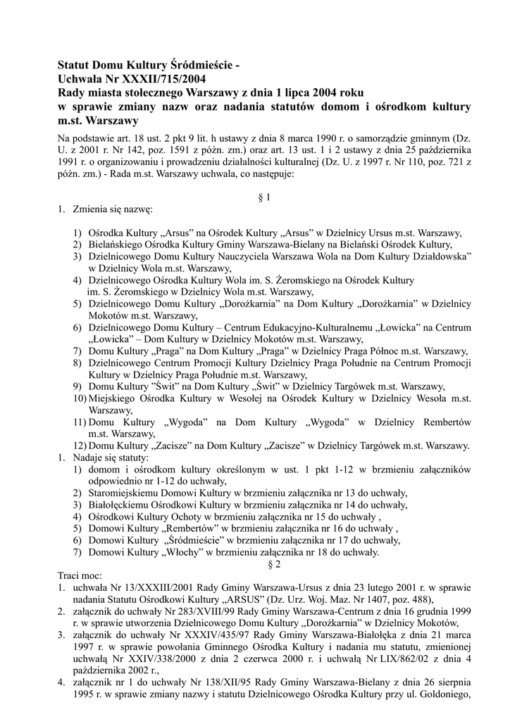 Statut Domu Kultury Śródmieście Uchwała Nr XXXII/715/2004 Rady miasta stołecznego Warszawy z dnia 1 lipca 2004 roku w sprawie zmiany nazw oraz nadania statutów domom i ośrodkom kultury m.st. Warszawy Na podstawie art. 18 ust. 2 pkt 9 lit. h ustawy z dnia 8 marca 1990 r. o samorządzie gminnym (Dz. U. z 2001 r. Nr 142, poz. 1591 z późn. zm.) oraz art. 13 ust. 1 i 2 ustawy z dnia 25 października 1991 r. o organizowaniu i prowadzeniu działalności kulturalnej (Dz. U. z 1997 r. Nr 110, poz. 721 z późn. zm.) - Rada m.st. Warszawy uchwala, co następuje: §1 1. Zmienia się nazwę: 1) Ośrodka Kultury „Arsus” na Ośrodek Kultury „Arsus” w Dzielnicy Ursus m.st. Warszawy, 2) Bielańskiego Ośrodka Kultury Gminy Warszawa-Bielany na Bielański Ośrodek Kultury, 3) Dzielnicowego Domu Kultury Nauczyciela Warszawa Wola na Dom Kultury Działdowska” w Dzielnicy Wola m.st. Warszawy, 4) Dzielnicowego Ośrodka Kultury Wola im. S. Żeromskiego na Ośrodek Kultury im. S. Żeromskiego w Dzielnicy Wola m.st. Warszawy, 5) Dzielnicowego Domu Kultury „Dorożkarnia” na Dom Kultury „Dorożkarnia” w Dzielnicy Mokotów m.st. Warszawy, 6) Dzielnicowego Domu Kultury – Centrum Edukacyjno-Kulturalnemu „Łowicka” na Centrum „Łowicka” – Dom Kultury w Dzielnicy Mokotów m.st. Warszawy, 7) Domu Kultury „Praga” na Dom Kultury „Praga” w Dzielnicy Praga Północ m.st. Warszawy, 8) Dzielnicowego Centrum Promocji Kultury Dzielnicy Praga Południe na Centrum Promocji Kultury w Dzielnicy Praga Południe m.st. Warszawy, 9) Domu Kultury ”Świt” na Dom Kultury „Świt” w Dzielnicy Targówek m.st. Warszawy, 10) Miejskiego Ośrodka Kultury w Wesołej na Ośrodek Kultury w Dzielnicy Wesoła m.st. Warszawy, 11) Domu Kultury „Wygoda” na Dom Kultury „Wygoda” w Dzielnicy Rembertów m.st. Warszawy, 12) Domu Kultury „Zacisze” na Dom Kultury „Zacisze” w Dzielnicy Targówek m.st. Warszawy. 1. Nadaje się statuty: 1) domom i ośrodkom kultury określonym w ust. 1 pkt 1-12 w brzmieniu załączników odpowiednio nr 1-12 do uchwały, 2) Staromiejskiemu Domowi Kultury w brzmieniu załącznika nr 13 do uchwały, 3) Białołęckiemu Ośrodkowi Kultury w brzmieniu załącznika nr 14 do uchwały, 4) Ośrodkowi Kultury Ochoty w brzmieniu załącznika nr 15 do uchwały , 5) Domowi Kultury „Rembertów” w brzmieniu załącznika nr 16 do uchwały , 6) Domowi Kultury „Śródmieście” w brzmieniu załącznika nr 17 do uchwały, 7) Domowi Kultury „Włochy” w brzmieniu załącznika nr 18 do uchwały. §2 Traci moc: 1. uchwała Nr 13/XXXIII/2001 Rady Gminy Warszawa-Ursus z dnia 23 lutego 2001 r. w sprawie nadania Statutu Ośrodkowi Kultury „ARSUS” (Dz. Urz. Woj. Maz. Nr 1407, poz. 488), 2. załącznik do uchwały Nr 283/XVIII/99 Rady Gminy Warszawa-Centrum z dnia 16 grudnia 1999 r. w sprawie utworzenia Dzielnicowego Domu Kultury „Dorożkarnia” w Dzielnicy Mokotów, 3. załącznik do uchwały Nr XXXIV/435/97 Rady Gminy Warszawa-Białołęka z dnia 21 marca 1997 r. w sprawie powołania Gminnego Ośrodka Kultury i nadania mu statutu, zmienionej uchwałą Nr XXIV/338/2000 z dnia 2 czerwca 2000 r. i uchwałą Nr LIX/862/02 z dnia 4 października 2002 r., 4. załącznik nr 1 do uchwały Nr 138/XII/95 Rady Gminy Warszawa-Bielany z dnia 26 sierpnia 1995 r. w sprawie zmiany nazwy i statutu Dzielnicowego Ośrodka Kultury przy ul. Goldoniego, zmienionej uchwałą Nr 314/IX/00 z dnia 16 czerwca 2000 r. i uchwałą Nr 775/XXXVI/02 z dnia 9 października 2002 r., 5. uchwała Nr 661/LVIII/2000 Rady Gminy Warszawa-Centrum z dnia 21 grudnia 2000 r. w sprawie nadania statutów domom i ośrodkom kultury w Gminie Warszawa-Centrum, 6. załącznik do uchwały Nr 701/LXI/2001 Rady Gminy Warszawa-Centrum z dnia 22 marca 2001 r. w sprawie utworzenia Domu Kultury „Praga”, 7. uchwała Nr XXVIII/267/00 Rady Gminy Warszawa-Targówek z dnia 5 października 2000 r. w sprawie Statutu Domu Kultury „Świt” 8. uchwała Nr 252/XXXIII/2001 Rady Miasta Wesoła z dnia 23 lutego 2001 r. w sprawie przyjęcia statutu Miejskiego Ośrodka Kultury w Wesołej (Dz. Urz. Woj. Maz. Nr 61, poz. 593) 9. uchwała Nr 88 Rady Dzielnicy Ochota z dnia 11 maja 1994 r. w sprawie nadania statutu Domowi Kultury „Włochy” zmieniona uchwałą Nr 70/VIII/94 Rady Gminy Warszawa-Włochy z dnia 1 grudnia 1994 r. i uchwałą Nr 304/XXXIV/2001 Rady Gminy Warszawa-Włochy z dnia 31 sierpnia 2001 r. w sprawie zmiany statutu Domu Kultury „Włochy” (Dz. Urz. Woj. Maz. 197, poz. 3372), 10. uchwała Nr 265/XXXII/2000 Rady Gminy Warszawa-Rembertów z dnia 20 grudnia 2000 r. w sprawie zmiany statutu Domu Kultury „Rembertów, 1) uchwała Nr XXVIII/268/00 Rady Gminy Warszawa-Targówek z dnia 5 października 2000 r. w sprawie nadania statutu Domowi Kultury „Zacisze”, 2) uchwała Nr XXI/175/2000 Rady Powiatu Warszawskiego z dnia 19 kwietnia 2000 r. w sprawie zmiany statutu Staromiejskiego Domu Kultury w Warszawie. 3) uchwała Nr 266/XXXII/2000 Rady Gminy Warszawa-Rembertów z dnia 20 grudnia 2000 r. w sprawie zmiany statutu Domu Kultury „Wygoda”, 4) załącznik do uchwały Nr 824/LXVII/2001 Rady Gminy Warszawa-Centrum w sprawie utworzenia Domu Kultury „Śródmieście” z dnia 15 listopada 2001 r. (Dz. Urz. Woj. Maz. Nr 195, poz. 3333), zmienionej uchwałą Nr 1709/LXXI/2001 z dnia 15 listopada 2001 r. (Dz. Urz. Woj. Maz. Nr 262 , poz. 6107). §3 Wykonanie uchwały powierza się Prezydentowi m.st. Warszawy §4 1. Uchwała podlega podaniu do wiadomości przez ogłoszenie w Dzienniku Urzędowym Województwa Mazowieckiego oraz na tablicy ogłoszeń Urzędu m.st. Warszawy. 2. Uchwała wchodzi w życie po upływie 14 dni od dnia ogłoszenia w Dzienniku Urzędowym Województwa Mazowieckiego. Przewodniczący Rady m.st. Warszawy Jan Maria Jackowski Załącznik nr 17 do uchwały Nr XXXII/715/2004 Rady m.st. Warszawy z dnia 1 lipca 2004 S TAT UT Domu Kultury „Śródmieście” Rozdział I Postanowienia ogólne §1 Dom Kultury 