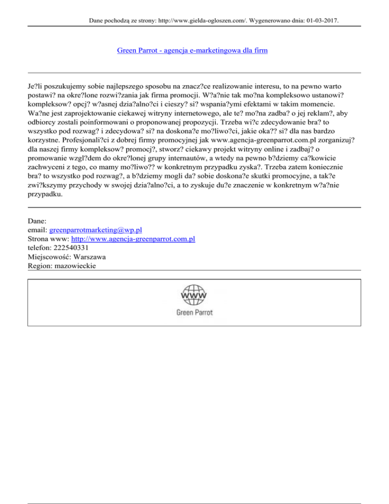 Dane pochodzą ze strony: http://www.gielda-ogloszen.com/. Wygenerowano dnia: 01-03-2017. Green Parrot - agencja e-marketingowa dla firm Je?li poszukujemy sobie najlepszego sposobu na znacz?ce realizowanie interesu, to na pewno warto postawi? na okre?lone rozwi?zania jak firma promocji. W?a?nie tak mo?na kompleksowo ustanowi? kompleksow? opcj? w?asnej dzia?alno?ci i cieszy? si? wspania?ymi efektami w takim momencie. Wa?ne jest zaprojektowanie ciekawej witryny internetowego, ale te? mo?na zadba? o jej reklam?, aby odbiorcy zostali poinformowani o proponowanej propozycji. Trzeba wi?c zdecydowanie bra? to wszystko pod rozwag? i zdecydowa? si? na doskona?e mo?liwo?ci, jakie oka?? si? dla nas bardzo korzystne. Profesjonali?ci z dobrej firmy promocyjnej jak www.agencja-greenparrot.com.pl zorganizuj? dla naszej firmy kompleksow? promocj?, stworz? ciekawy projekt witryny online i zadbaj? o promowanie wzgl?dem do okre?lonej grupy internautów, a wtedy na pewno b?dziemy ca?kowicie zachwyceni z tego, co mamy mo?liwo?? w konkretnym przypadku zyska?. Trzeba zatem koniecznie bra? to wszystko pod rozwag?, a b?dziemy mogli da? sobie doskona?e skutki promocyjne, a tak?e zwi?kszymy przychody w swojej dzia?alno?ci, a to zyskuje du?e znaczenie w konkretnym w?a?nie przypadku. Dane: email: [email protected] Strona www: http://www.agencja-greenparrot.com.pl telefon: 222540331 Miejscowość: Warszawa Region: mazowieckie