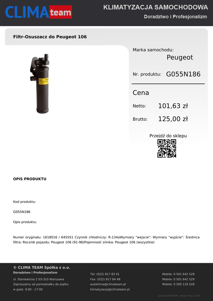 Filtr-Osuszacz do Peugeot 106 Marka samochodu: Peugeot Nr. produktu: G055N186 Cena Netto: 101,63 zł Brutto: 125,00 zł Przejdź do sklepu OPIS PRODUKTU Kod produktu: G055N186 Opis produktu: Numer oryginału: 1618016 / 6455S1 Czynnik chłodniczy: R-134aWymiary "wejscie": Wymiary "wyjście": Średnica filtra: Rocznik pojazdu: Peugeot 106 (91-96)Pojemność silnika: Peugeot 106 (wszystkie) © CLIMA TEAM Spółka z o.o. Doradztwo i Profesjonalizm Tel: (022) 817 83 01 Mobile: 0 501 642 528 ul. Staniewicka 2 03-310 Warszawa Fax: (022) 817 84 49 Mobile: 0 501 642 529 Zapraszamy od poniedziałku do piątku [email protected] Mobile: 0 500 119 528 w godz. 9:00 - 17:00 [email protected] projekt GRAFCOM | Netler Shop 1.020