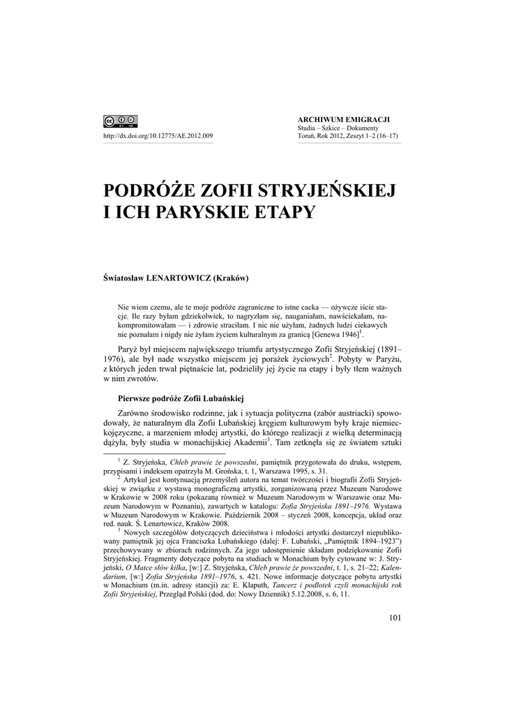 ARCHIWUM EMIGRACJI http://dx.doi.org/10.12775/AE.2012.009 Studia – Szkice – Dokumenty Toruń, Rok 2012, Zeszyt 1–2 (16–17) _________________________________________________________________ _____________________________________________________________ PODRÓŻE ZOFII STRYJEŃSKIEJ I ICH PARYSKIE ETAPY Światosław LENARTOWICZ (Kraków) Nie wiem czemu, ale te moje podróże zagraniczne to istne cacka — ożywcze iście stacje. Ile razy byłam gdziekolwiek, to nagryzłam się, nauganiałam, nawściekałam, nakompromitowałam — i zdrowie straciłam. I nic nie użyłam, żadnych ludzi ciekawych nie poznałam i nigdy nie żyłam życiem kulturalnym za granicą [Genewa 1946]1. Paryż był miejscem największego triumfu artystycznego Zofii Stryjeńskiej (1891– 1976), ale był nade wszystko miejscem jej porażek życiowych2. Pobyty w Paryżu, z których jeden trwał piętnaście lat, podzieliły jej życie na etapy i były tłem ważnych w nim zwrotów. Pierwsze podróże Zofii Lubańskiej Zarówno środowisko rodzinne, jak i sytuacja polityczna (zabór austriacki) spowodowały, że naturalnym dla Zofii Lubańskiej kręgiem kulturowym były kraje niemieckojęzyczne, a marzeniem młodej artystki, do którego realizacji z wielką determinacją dążyła, były studia w monachijskiej Akademii3. Tam zetknęła się ze światem sztuki 1 Z. Stryjeńska, Chleb prawie że powszedni, pamiętnik przygotowała do druku, wstępem, przypisami i indeksem opatrzyła M. Grońska, t. 1, Warszawa 1995, s. 31. 2 Artykuł jest kontynuacją przemyśleń autora na temat twórczości i biografii Zofii Stryjeńskiej w związku z wystawą monograficzną artystki, zorganizowaną przez Muzeum Narodowe w Krakowie w 2008 roku (pokazaną również w Muzeum Narodowym w Warszawie oraz Muzeum Narodowym w Poznaniu), zawartych w katalogu: Zofia Stryjeńska 1891–1976. Wystawa w Muzeum Narodowym w Krakowie. Październik 2008 – styczeń 2008, koncepcja, układ oraz red. nauk. Ś. Lenartowicz, Kraków 2008. 3 Nowych szczegółów dotyczących dzieciństwa i młodości artystki dostarczył niepublikowany pamiętnik jej ojca Franciszka Lubańskiego (dalej: F. Lubański, „Pamiętnik 1894–1923”) przechowywany w zbiorach rodzinnych. Za jego udostępnienie składam podziękowanie Zofii Stryjeńskiej. Fragmenty dotyczące pobytu na studiach w Monachium były cytowane w: J. Stryjeński, O Matce słów kilka, [w:] Z. Stryjeńska, Chleb prawie że powszedni, t. 1, s. 21–22; Kalendarium, [w:] Zofia Stryjeńska 1891–1976, s. 421. Nowe informacje dotyczące pobytu artystki w Monachium (m.in. adresy stancji) za: E. Klaputh, Tancerz i podlotek czyli monachijski rok Zofii Stryjeńskiej, Przegląd Polski (dod. do: Nowy Dziennik) 5.12.2008, s. 6, 11. 101 europejskiej również w jej awangardowym wydaniu, tam też ugruntowała swoją koncepcję własnej drogi artystycznej, której była wierna do końca życia. Koncepcja ta oparta była w skrócie na dwóch założeniach: technicznym — użycie farb wodnych i papieru jako podstawowych materiałów malarskich oraz ikonograficznym — zainteresowanie światem baśni, folkloru, legend, wierzeń z terenów Polski. Wyartykułowanie tych założeń w czasie krótkich studiów w Monachium (październik 1911 – wrzesień 1912) dowodzi świadomości możliwości artystycznych i wiary we własne siły młodej artystki. Akademia nie wpłynęła jednak w żaden widoczny sposób na technikę jej pracy i tematykę zainteresowań. Osiągnąwszy wymarzony cel, artystka po powrocie z Monachium postanowiła świadomie zrobić krok wstecz, pomijając akademickie nauki i bazując na tym, czego nauczyła się wcześniej w krakowskiej Szkole Sztuk Pięknych Marii Niedzielskiej. Wystawienie „dziecinnych”, ale profesjonalnie i z ogromnym wysiłkiem opracowanych Bajd w Pałacu Sztuki w Krakowie, w grudniu 1912 roku, zapewniło jej pierwszy sukces artystyczny i finansowy4. Drugim miastem przyciągającym Zofię był Wiedeń, gdzie mieszkali krewni ze strony matki, których Anna ze Skrzyńskich czasem odwiedzała. Dziadek artystki jako oficer austrowęgierski dłuższy czas mieszkał w Wiedniu5. Wiedeń i Praga były miejscami podróży ojca Zofii, Franciszka Lubańskiego, w celach handlowych. Tam też Zofia podróżowała często, nawet według współczesnych nam kryteriów. Wyjazdy opisane przez ojca artystki w jego pamiętniku przedstawiały się następująco: wycieczka z ojcem i bratem Tadeuszem do Wiednia (1909); „podróż epokowa w naszym życiu” na południe Europy (Wiedeń, Triest, Wenecja) — po raz pierwszy zobaczyli wtedy morze (1910); studia w Monachium (październik 1911 – wrzesień 1912), przerwane przyjazdem do domu na Wielkanoc; kilkudniowy pobyt z matką w Wiedniu w czasie powrotu ze studiów (1912); ucieczka z domu do Wiednia i Monachium (1 kwietnia – 3 sierpnia 1913); pobyt w Dreźnie (początek czerwca – koniec lipca 1914); wyjazd z siostrą Jancią na dziesięć dni do Wiednia, gdzie przebywała ich matka (czerwiec 1915). W roku 1916 poza domem spędziła sześć miesięcy: 28 stycznia „Zosia znów wyjechała w świat, rzekomo do Wiednia”. 23 lipca ojciec otrzymał list z Pragi donoszący o „nowem przykrem położeniu Zosi”. Pojechał tam po nią i razem wrócili przez Wiedeń do Krakowa 31 lipca6. Kiedy 4 listopada 1916 roku Zofia Lubańska poślubiła Karola Stryjeńskiego, zmienił się, pod wpływem męża, kierunek zagranicznych zainteresowań artystki. Chcąc podsumować i zamknąć „monachijski” okres swego życia, namalowała w tym samym roku niezwykle osobisty i oryginalny formalnie cykl akwarel Romans z życia nieznanego artysty, który jakby na znak zerwania z dawnymi czasami, zniszczyła sama kilka lat później7. Karol Stryjeński wychowany został w umiłowaniu kultury romańskiej. Rodzina Stryjeńskich, dzięki zasługom dziadka Karola, Aleksandra Stryjeńskiego (1804–1875), posiadała obywatelstwo szwajcarskie8. Ojciec Karola, archite