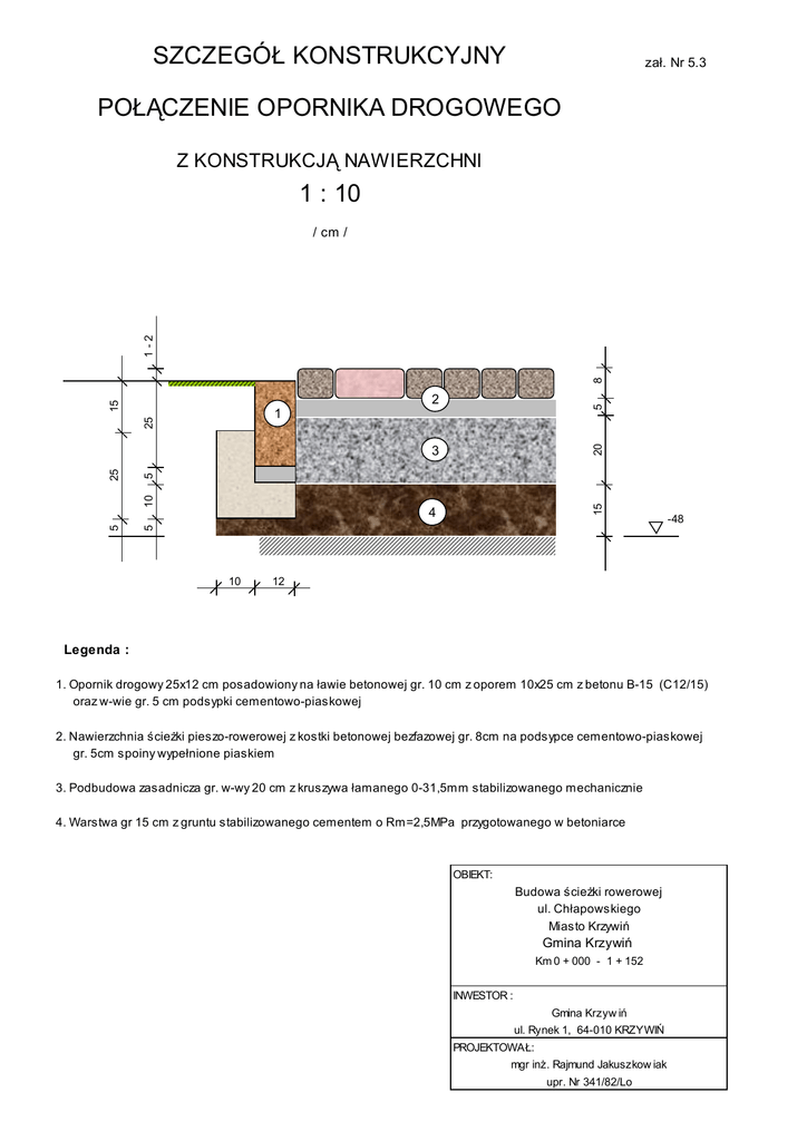 SZCZEGÓŁ KONSTRUKCYJNY zał. Nr 5.3 POŁĄCZENIE OPORNIKA DROGOWEGO Z KONSTRUKCJĄ NAWIERZCHNI 1 : 10 4 5 3 20 5 2 5 5 10 25 25 1 15 15 8 1-2 / cm / 10 -48 12 Legenda : 1. Opornik drogowy 25x12 cm posadowiony na ławie betonowej gr. 10 cm z oporem 10x25 cm z betonu B-15 (C12/15) oraz w-wie gr. 5 cm podsypki cementowo-piaskowej 2. Nawierzchnia ścieżki pieszo-rowerowej z kostki betonowej bezfazowej gr. 8cm na podsypce cementowo-piaskowej gr. 5cm spoiny wypełnione piaskiem 3. Podbudowa zasadnicza gr. w-wy 20 cm z kruszywa łamanego 0-31,5mm stabilizowanego mechanicznie 4. Warstwa gr 15 cm z gruntu stabilizowanego cementem o Rm=2,5MPa przygotowanego w betoniarce OBIEKT: Budowa ścieżki rowerowej ul. Chłapowskiego Miasto Krzywiń Gmina Krzywiń Km 0 + 000 - 1 + 152 INWESTOR : Gmina Krzyw iń ul. Rynek 1, 64-010 KRZYWIŃ PROJEKTOWAŁ: mgr inż. Rajmund Jakuszkow iak upr. Nr 341/82/Lo
