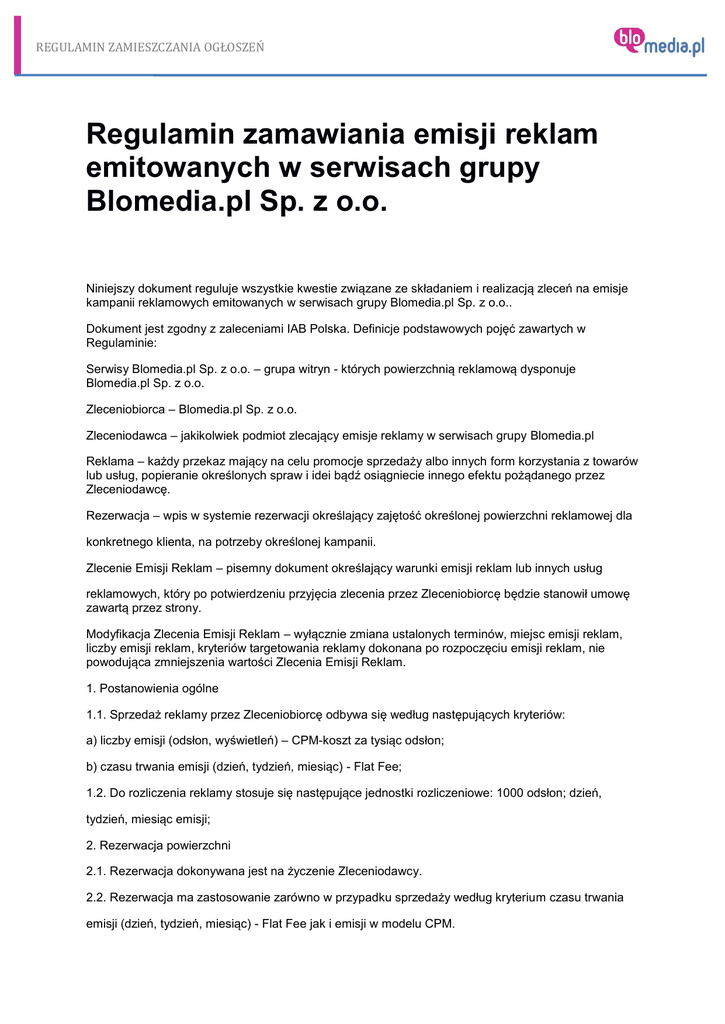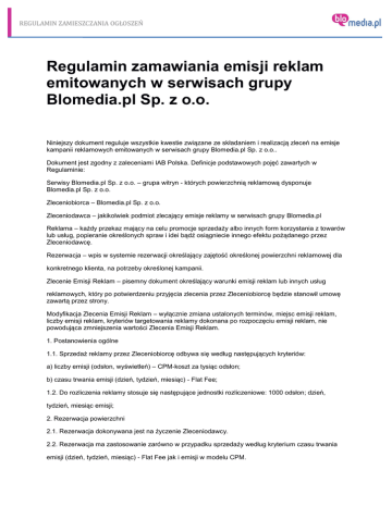 REGULAMIN ZAMIESZCZANIA OGŁOSZEŃ Regulamin zamawiania emisji reklam emitowanych w serwisach grupy Blomedia.pl Sp. z o.o. Niniejszy dokument reguluje wszystkie kwestie związane ze składaniem i realizacją zleceń na emisje kampanii reklamowych emitowanych w serwisach grupy Blomedia.pl Sp. z o.o.. Dokument jest zgodny z zaleceniami IAB Polska. Definicje podstawowych pojęć zawartych w Regulaminie: Serwisy Blomedia.pl Sp. z o.o. – grupa witryn - których powierzchnią reklamową dysponuje Blomedia.pl Sp. z o.o. Zleceniobiorca – Blomedia.pl Sp. z o.o. Zleceniodawca – jakikolwiek podmiot zlecający emisje reklamy w serwisach grupy Blomedia.pl Reklama – każdy przekaz mający na celu promocje sprzedaży albo innych form korzystania z towarów lub usług, popieranie określonych spraw i idei bądź osiągniecie innego efektu pożądanego przez Zleceniodawcę. Rezerwacja – wpis w systemie rezerwacji określający zajętość określonej powierzchni reklamowej dla konkretnego klienta, na potrzeby określonej kampanii. Zlecenie Emisji Reklam – pisemny dokument określający warunki emisji reklam lub innych usług reklamowych, który po potwierdzeniu przyjęcia zlecenia przez Zleceniobiorcę będzie stanowił umowę zawartą przez strony. Modyfikacja Zlecenia Emisji Reklam – wyłącznie zmiana ustalonych terminów, miejsc emisji reklam, liczby emisji reklam, kryteriów targetowania reklamy dokonana po rozpoczęciu emisji reklam, nie powodująca zmniejszenia wartości Zlecenia Emisji Reklam. 1. Postanowienia ogólne 1.1. Sprzedaż reklamy przez Zleceniobiorcę odbywa się według następujących kryteriów: a) liczby emisji (odsłon, wyświetleń) – CPM-koszt za tysiąc odsłon; b) czasu trwania emisji (dzień, tydzień, miesiąc) - Flat Fee; 1.2. Do rozliczenia reklamy stosuje się następujące jednostki rozliczeniowe: 1000 odsłon; dzień, tydzień, miesiąc emisji; 2. Rezerwacja powierzchni 2.1. Rezerwacja dokonywana jest na życzenie Zleceniodawcy. 2.2. Rezerwacja ma zastosowanie zarówno w przypadku sprzedaży według kryterium czasu trwania emisji (dzień, tydzień, miesiąc) - Flat Fee jak i emisji w modelu CPM. REGULAMIN ZAMIESZCZANIA OGŁOSZEŃ 2.3. Rezerwacja dokonywana jest dla konkretnego Zleceniodawcy i na potrzeby określonej kampanii. Ważność rezerwacji wynosi 30 dni. Przedłużenie ważności rezerwacji musi być potwierdzane zleceniem. 2.4. Rezerwacje dokonywane są na terminy nie późniejsze niż cztery miesiące od czasu dokonywania rezerwacji. 2.5. Dokonanie rezerwacji jest potwierdzane przez Zleceniobiorcę w formie e-maila. 2.6. Rezerwacje dokonywane w terminie krótszym niż 14 dni roboczych od daty emisji muszą być potwierdzane zleceniem w ciągu jednego dnia roboczego od czasu otrzymania e-maila potwierdzającego dokonanie rezerwacji. 3. Zlecenie Emisji Reklam i warunki płatności 3.1. Zlecenia Emisji Reklam dokonuje się pisemnie (w formie listu lub faksu przesyłanego przez Zleceniodawcę do Zleceniobiorcy) na odpowiednim formularzu przygotowanym przez Zleceniobiorcę. Zlecenie Emisji Reklam oraz potwierdzenie jego przyjęcia mogą być dokonywane w formie elektronicznej z uwzględnieniem wymogów narzuconych przez Ustawę o podpisie elektronicznym. 3.1. Zlecenie Emisji Reklam powinno zawierać: a) listę zamawianych powierzchni reklamowych (serwisów) oraz miejsc w ich obrębie (strona główna, podstrony, góra, dół itp.); b) jednostkę rozliczeniową (odsłony, czas); c) liczbę zamawianych jednostek rozliczeniowych na poszczególnych serwisach; d) wartość jednostki rozliczeniowej na poszczególnych serwisach, ewentualne rabaty, wartości po udzielonych rabatach; e) czas trwania Emisji Reklamy na poszczególnych serwisach; f) ewentualne dodatkowe założenia dotyczące emisji reklamy (targetowanie, ograniczanie liczby kontaktów jednego użytkownika z reklamą itp.); g) nazwę kampanii; h) dane identyfikujące Zleceniodawcę: imię i nazwisko osoby zlecającej; dane firmy zamawiającej: adres, telefon, faks, NIP; i) dane Zleceniobiorcy: imię i nazwisko osoby przyjmującej zlecenie, adres, telefon, faks, NIP; j) termin wystawienia FV, termin płatności FV, nazwę banku i numer konta, na które powinny zostać przelane pieniądze przez Zleceniodawcę; k) podpis i pieczęć Zleceniodawcy. 3.2. Podpisując Zlecenie Emisji Reklam, przygotowane przez Zleceniobiorcę, Zleceniodawca oświadcza, że: a) posiada odpowiednie umocowanie do składania zamówienia oraz podpisania umowy o REGULAMIN ZAMIESZCZANIA OGŁOSZEŃ emisje reklam; b) jest uprawniony do posługiwania się - użytymi w zleconych do emisji materiałach reklamowych informacjami, danymi, fragmentami utworów, wizerunkami, znakami towarowymi lub wzorcami zdobniczymi albo innymi elementami stanowiącymi przedmiot ochrony prawnej na podstawie prawa autorskiego i praw pokrewnych, prawa własności przemysłowej, prawa do znaków towarowych lub wzorów zdobniczych, prawa do tajemnicy przedsiębiorstwa lub innych praw wymaganych w prowadzeniu kampanii; c) zlecana emisja reklam jest zgodna z obowiązującymi przepisami prawa i nie narusza praw autorskich oraz innych praw osób trzecich. 3.4. W przypadku opóźnienia w dostarczeniu materiałów reklamowych lub przekazania ich w formie niezgodnej z ustaleniami Stron przez Zleceniodawcę, Zleceniobiorca ma prawo odstąpić od umowy lub żądać zapłaty przez Zleceniodawcę za każdy dzień opóźnienia kary umownej w wysokości 5 % ustalonego wynagrodzenia, a gdy opóźnienia przekroczy okres 3 dni, Zleceniobiorca może żądać zapłaty dodatkowej kary umownej w wysokości 15 % ustalonego wynagrodzenia. 3.5. Emisja reklam może zostać odwołana przez Zleceniodawcę w całości lub części, jednakże Zleceniodawca będzie zobowiązany do zapłaty kar umownych. 3.6. Anulowanie Zlecenia Emisji Reklam przez Zleceniodawcę nie później niż 15 dni roboczych przed datą pierwszej emisji nie rodzi zobowiązań finansowych wobec Zleceniobiorcy.