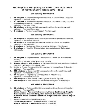 NAJWIĘKSZE OSIĄGNIĘCIA SPORTOWE MZS NR 4 W GORLICACH w latach 1999 - 2012 rok szkolny 1999/2000 1. 2. 3. 4. IV miejsce w Wojewódzkiej Gimnazjadzie w Koszykówce Chłopców opiekun – Tomasz Mika VI miejsce w Wojewódzkiej Gimnazjadzie Lekkoatletycznej (Szkolna Liga Lekkoatletyczna Chłopców) opiekun – Tomasz Mika II miejsce w Rejonowej Gimnazjadzie w Koszykówce Dziewcząt opiekun – Tomasz Mianowski I miejsce w Powiatowych Biegach Przełajowych rok szkolny 2000/2001 1. 2. 3. 4. II miejsce w Wojewódzkiej Gimnazjadzie w Koszykówce Dziewcząt opiekun – Tomasz Mianowski II miejsce w Rejonowej Gimnazjadzie w Koszykówce Chłopców opiekun – Tomasz Mika I miejsce w Powiatowej Gimnazjadzie w Halowej Piłce Nożnej I miejsce w Miejskiej Gimnazjadzie Lekkoatletycznej Dziewcząt i Chłopców rok szkolny 2001/2002 1. 2. 3. 5. 4. 5. 6. IV miejsce w Wojewódzkim Turnieju Coca Cola Cup 2002 w Piłce Nożnej opiekun – Tomasz Mika, Bartosz Czamara Dusza Miłosz – XII miejsce w Wojewódzkiej Gimnazjadzie w Szachach opiekun – Aleksander Kumorkiewicz Udział w Finale Wojewódzkiej Gimnazjady w Koszykówce Chłopców opiekun – Tomasz Mika III miejsce w Rejonowej Gimnazjadzie w Koszykówce Dziewcząt opiekun – Tomasz Mianowski IV miejsce w Rejonowej Gimnazjadzie w Piłce Nożnej opiekun – Tomasz Mianowski III miejsce w Powiatowej Gimnazjadzie w Piłce Ręcznej III miejsce w Powiatowych Sztafetowych Biegach Przełajowych rok szkolny 2002/2003 1. 2. II miejsce w Wojewódzkiej Gimnazjadzie w Koszykówce Chłopców opiekun – Tomasz Mika Skład drużyny: Adamczyk Krzysztof, Semla Bartłomiej, Gogola Przemysław, Brudnik Filip, Rak Damian, Lewiński Krzysztof, Kiełtyka Artur, Ślusarz Sebastian, Wojciechowski Jakub, Tapek Michał Wojewódzka Gimnazjada w Pływaniu Tybor Magdalena – X miejsce (styl dowolny) Bugno Ewelina – VIII miejsce (styl dowolny) 3. 4. 5. 6. 7. 8. 9. Bugno Ewelina – VI miejsce (styl grzbietowy) Bugno Katarzyna – VIII miejsce (styl grzbietowy) Roicki Krzysztof – VII miejsce (styl grzbietowy) Roicki Krzysztof – VI miejsce (styl dowolny) Dzik Mateusz – XIV miejsce (styl dowolny) opiekun – Tomasz Mika Dusza Miłosz – XII miejsce w Wojewódzkiej Gimnazjadzie w Szachach opiekun – Aleksander Kumorkiewicz Tamara Maryńczak – udział w Wojewódzkich Indywidualnych Biegach Przełajowych Półfinał Mistrzostw Polski w Jeździe Szybkiej na Wrotkach Karolina Kurek – II miejsce Ewelina Kamyk – III miejsce Sarnecka Katarzyna – udział opiekun – Piotr Jędrych Dwóch finalistów w Wojewódzkiej Gimnazjadzie w Narciarstwie Alpejskim opiekun – Piotr Jędrych III miejsce w Rejonowej Gimnazjadzie w Koszykówce Dziewcząt opiekun – Barbara Trybus II miejsce w Powiatowych Sztafetowych Biegach Sztafetowych V miejsce w Powiatowej Gimnazjadzie w Piłce Siatkowej Dziewcząt opiekun – Barbara Trybus rok szkolny 2003/2004 1. 2. 3. 4. Wojewódzka Gimnazjada w Pływaniu Cztery finały dziewcząt i dwa finały chłopców IV miejsce w sztafecie dziewcząt Skład drużyny: Ewelina Bugno, Magdalena Tybor, Małgorzata Fejklowicz, Magdalena Lenartowicz, Natalia Orlecka, Aleksandra Koczyrkiewicz, Magdalena Pacuła, Magdalena Rak, Piotrowicz Agnieszka, Fejklowicz Katarzyna, Kaszycka Katarzyna V miejsce w sztafecie chłopców Skład drużyny: Niedziela Marcin, Wojciechowski Jakub, Knapik Adrian, Lewiński Kamil, Pastuszak Daniel, Sidor Damian, Stępień Piotr, Hycnar Grzegorz, Oleszkowicz Maciej, Lewiński Adrian, Brzeziański Konrad opiekun – Tomasz Mika Udział Wojewódzkiej Gimnazjadzie w Badmintonie Drużynowym Chłopców opiekun – Aleksander Kumorkiewicz III miejsce w Rejonowej Gimnazjadzie w Koszykówce Dziewcząt opiekun – Tomasz Mianowski Bąk Rafał – VI miejsce w Powiatowej Gimnazjadzie w Szachach opiekun – Aleksander Kumorkiewicz rok szkolny 2004/2005 1. III miejsce w Wojewódzkich Igrzyskach Młodzieży Szkolnej w Czwórboju Lekkoatletycznym (Kraków) Skład drużyny: Trojanowicz Magdalena, Tarsa Sandra, Wójcik Magdalena, Urbanik Katarzyna, Wyspiańska Anna, Pabis Edyta opiekun – Magdalena Mika 2. Dusza Łukasz – udział w finale Wojewódzkiej Gimnazjady w Szachach opiekun – Aleksander Kumorkiewicz Zimowski Mateusz, Nowacki Mariusz – III miejsce w Wojewódzkiej Gimnazjadzie w Badmintonie Drużynowym opiekun – Aleksander Kumorkiewicz Trajdos Arkadiusz, Janiszewski Krzysztof – udział w finale Rejonowej Gimnazjady w Tenisie Stołowym opiekun – Tomasz Mika Wojewódzka Gimnazjada w Pływaniu Tybor Magdalena – X miejsce (stylu klasyczny) Knapik Adrian – VII miejsce (styl grzbietowy) Bugno Ewelina – VI miejsce (styl dowolny) Lewiński Adrian – VII miejsce (stylu klasyczny) III miejsce w sztafecie dziewcząt Skład drużyny: Bugno Ewelina, Tabor Magdalena, Koczyrkiewicz Aleksandra, Piotrowicz Joanna, Rak Magdalena, Chrząścik Kinga, Orlecka Natalia, Pacuła Magdalena, Lenartowicz Magdalena, Bugno Katarzyna opiekun – Tomasz Mika Stępień Piotr, Piotrowicz Joanna – udział w finale Wojewódzkiej Gimnazjady w Narciarstwie Alpejskim opiekun – Tomasz Mianowski 3. 4. 5. 6. rok szkolny 2005/2006 1. Pietraszek Alicja – XII miejsce w Wojewódzkich Igrzysk Młodzieży Szkolnej w Pływaniu (styl dowolny) opiekun – Magdalena Mika 2. Zimowski Mateusz, Nowacki Mariusz – III miejsce w Wojewódzkiej Gimnazjadzie w Badmintonie Drużynowym opiekun – Aleksander Kumorkiewicz IX miejsce w Wojewódzkiej Gimnazjadzie w Halowej Piłce Nożnej (FUTSAL) Skład drużyny: Mroczka Paweł, Sendecki Konrad, Lewicki Maksym, Brzeziański Dominik, Mazurkiewicz Łukasz, Połeć Przemysław, Stokłosa Sebastian, Stec Kamil, Zakrzewski Marcin opiekun – Aleksander Kumorkiewicz Trajdos Arkadiusz – udział w finale Wojewódzkiej Gimnazjady w Tenisie Stołowym opiekun – Tomasz Mika 3. 4. 5. 6. XI miejsce sztafety dziewcząt w Wojewódzkiej Gimnazjadzie w Pływaniu Skład drużyny: Pawlus Katarzyna, Woźniak Natalia, Pabis Edyta, Kaszycka Katarzyna
