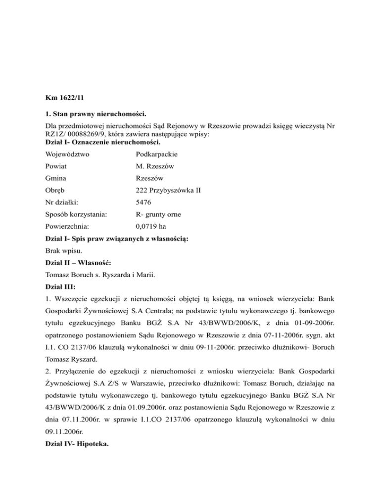 Km 1622/11 1. Stan prawny nieruchomości. Dla przedmiotowej