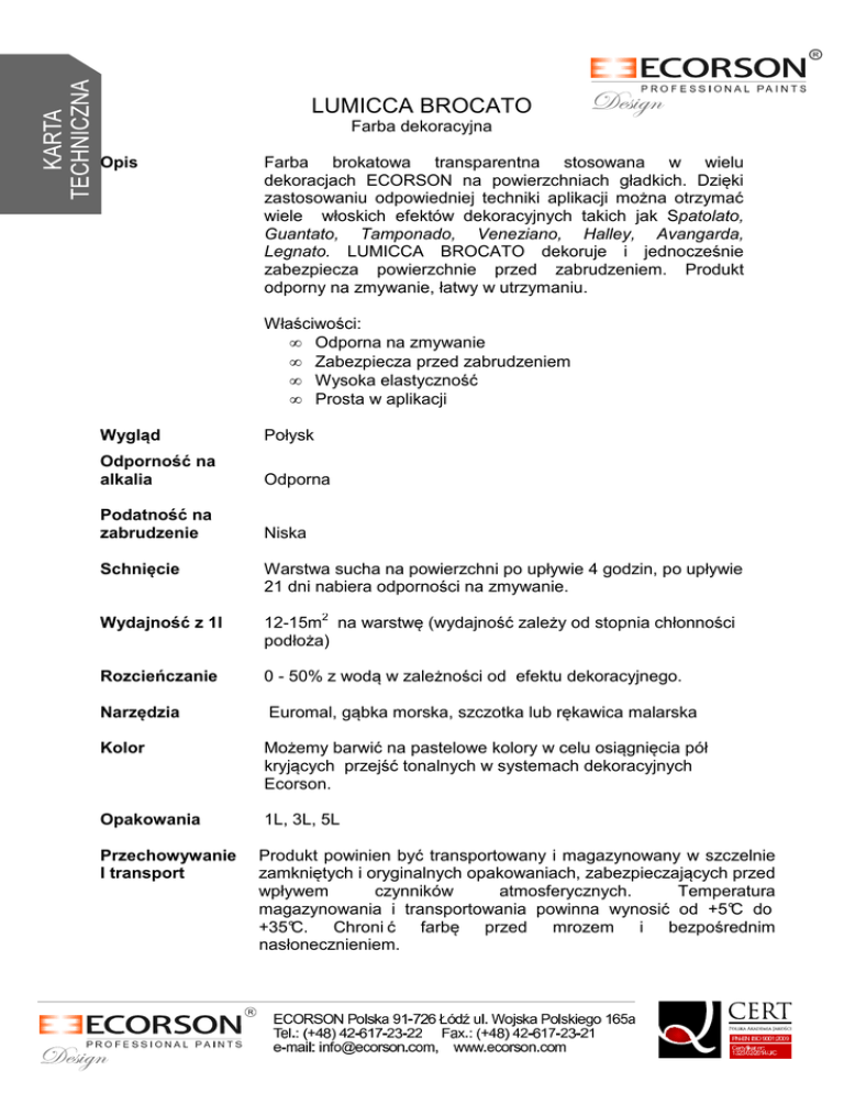 LUMICCA BROCATO Farba dekoracyjna Opis Farba brokatowa transparentna stosowana w wielu dekoracjach ECORSON na powierzchniach gładkich. Dzięki zastosowaniu odpowiedniej techniki aplikacji można otrzymać wiele włoskich efektów dekoracyjnych takich jak Spatolato, Guantato, Tamponado, Veneziano, Halley, Avangarda, Legnato. LUMICCA BROCATO dekoruje i jednocześnie zabezpiecza powierzchnie przed zabrudzeniem. Produkt odporny na zmywanie, łatwy w utrzymaniu. Właściwości: • Odporna na zmywanie • Zabezpiecza przed zabrudzeniem • Wysoka elastyczność • Prosta w aplikacji Wygląd Połysk Odporność na alkalia Odporna Podatność na zabrudzenie Niska Schnięcie Warstwa sucha na powierzchni po upływie 4 godzin, po upływie 21 dni nabiera odporności na zmywanie. Wydajność z 1l 12-15m2 na warstwę (wydajność zależy od stopnia chłonności podłoża) Rozcieńczanie 0 - 50% z wodą w zależności od efektu dekoracyjnego. Narzędzia Euromal, gąbka morska, szczotka lub rękawica malarska Kolor Możemy barwić na pastelowe kolory w celu osiągnięcia pół kryjących przejść tonalnych w systemach dekoracyjnych Ecorson. Opakowania 1L, 3L, 5L Przechowywanie I transport Produkt powinien być transportowany i magazynowany w szczelnie zamkniętych i oryginalnych opakowaniach, zabezpieczających przed wpływem czynników atmosferycznych. Temperatura magazynowania i transportowania powinna wynosić od +5°C do +35°C. Chroni ć farbę przed mrozem i bezpośrednim nasłonecznieniem. LUMICCA BROCATO Farba dekoracyjna Ekologia Farba nie zawiera ołowiu, chromu, rtęci Niska zawartość LZO PRODUKT POSIADA POLSKI ATEST PZH I JEST ZGODNY Z POLSKIMI NORMAMI: PN EN 13300 2002 Przygotowanie podłoża: W procesie malowania bardzo ważna jest ocena stanu podłoża przeznaczonego na pokrycia, przez pracownika prowadzącego prace malarskie. Jeśli prowadzimy prace malarskie należy upewnić się, że stare warstwy farby są dobrze związane z podłożem i wytrzymają nanoszenie i przyleganie nowego wykończenia. Jeśli okaże się, że podłoże nie spełnia wymaganych warunków, przed nałożeniem farby należy mechanicznie usunąć wszystkie warstwy starej farby słabo związanej z podłożem. Jeżeli natomiast malujemy podłoża mineralne nigdy wcześniej nie malowane, należy się upewnić, że są czyste, jeżeli nie to konieczne należy usunąć zapylenie występujące na powierzchni oraz tworzące się z czasem zabrudzenia i zatłuszczenia. Uwagi: Należy dostosować panujące warunki do zalecanych parametrów nanoszenia. Dane i informacje techniczne zostały opracowane w temp. +23oC przy średniej wilgotności otoczenia ok. 65%. W innych warunkach dane i czasy między poszczególnymi czynnościami mogą ulec zmianie. Informacje dotyczące stosowania produktu, oparte są na dokładnej obserwacji i badaniach przeprowadzonych przez producenta. Wzięto również pod uwagę, doświadczenia zdobyte w praktyce. Jednak ze względu na ogromną różnorodność podłoży i warunków stosowania, koniecznie należy sprawdzić przydatność produktu i jego skuteczności poprzez testy. Należy przestrzegać zaleceń z kart: technicznej, nakładania i bezpieczeństwa. Narzędzia po użyciu należy natychmiast umyć wodą.