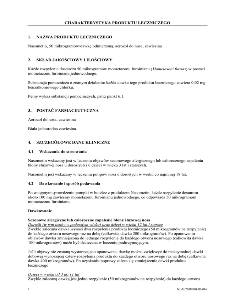 CHARAKTERYSTYKA PRODUKTU LECZNICZEGO 1. NAZWA PRODUKTU LECZNICZEGO Nasometin, 50 mikrogramów/dawkę odmierzoną, aerozol do nosa, zawiesina 2. SKŁAD JAKOŚCIOWY I ILOŚCIOWY Każde rozpylenie dostarcza 50 mikrogramów mometazonu furoinianu (Mometasoni furoas) w postaci mometazonu furoinianu jednowodnego. Substancja pomocnicza o znanym działaniu: każda dawka tego produktu leczniczego zawiera 0,02 mg benzalkoniowego chlorku. Pełny wykaz substancji pomocniczych, patrz punkt 6.1. 3. POSTAĆ FARMACEUTYCZNA Aerozol do nosa, zawiesina Biała jednorodna zawiesina. 4. 4.1 SZCZEGÓŁOWE DANE KLINICZNE Wskazania do stosowania Nasometin wskazany jest w leczeniu objawów sezonowego alergicznego lub całorocznego zapalenia błony śluzowej nosa u dorosłych i u dzieci w wieku 3 lat i starszych. Nasometin jest wskazany w leczeniu polipów nosa u dorosłych w wieku co najmniej 18 lat. 4.2 Dawkowanie i sposób podawania Po wstępnym sprawdzeniu pompki w butelce z produktem Nasometin, każde rozpylenie dostarcza około 100 mg zawiesiny mometazonu furoinianu jednowodnego, co odpowiada 50 mikrogramom mometazonu furoinianu. Dawkowanie Sezonowe alergiczne lub całoroczne zapalenie błony śluzowej nosa Dorośli (w tym osoby w podeszłym wieku) oraz dzieci w wieku 12 lat i starsze Zwykle zalecana dawka wynosi dwa rozpylenia produktu leczniczego (50 mikrogramów na rozpylenie) do każdego otworu nosowego raz na dobę (całkowita dawka 200 mikrogramów). Po opanowaniu objawów dawka zmniejszona do jednego rozpylenia do każdego otworu nosowego (całkowita dawka 100 mikrogramów) może być skuteczna w leczeniu podtrzymującym. Jeśli objawy nie zostaną wystarczająco opanowane, dawkę można zwiększyć do maksymalnej dawki dobowej wynoszącej cztery rozpylenia produktu do każdego otworu nosowego raz na dobę (całkowita dawka 400 mikrogramów). Po uzyskaniu poprawy zaleca się zmniejszenie dawki produktu leczniczego. Dzieci w wieku od 3 do 11 lat Zwykle zalecaną dawką jest jedno rozpylenie (50 mikrogramów na rozpylenie) do każdego otworu 1 NL/H/2038/001/IB/016 nosowego raz na dobę (całkowita dawka 100 mikrogramów). U niektórych pacjentów z sezonowym alergicznym zapaleniem błony śluzowej nosa początek klinicznie znaczącego działania produktu Nasometin obserwowano w ciągu 12 godzin od podania pierwszej dawki, ale pełnego działania produktu leczniczego można nie uzyskać w ciągu pierwszych 48 godzin. Dlatego pacjent powinien regularnie stosować produkt w celu uzyskania jego pełnego działania. U pacjentów z umiarkowanymi do ciężkich objawami sezonowego alergicznego zapalenia błony śluzowej nosa w wywiadzie może być konieczne rozpoczęcie stosowania produktu Nasometin na kilka dni przed przewidywanym początkiem okresu pylenia. Polipy nosa Zwykle zalecaną początkową dawką są dwa rozpylenia (50 mikrogramów na rozpylenie) do każdego otworu nosowego raz na dobę (całkowita dawka 200 mikrogramów). Jeśli po 5 do 6 tygodni leczenia objawy nie zmniejszą się wystarczająco, dawkę dobową można zwiększyć do dwóch rozpyleń do każdego otworu nosowego dwa razy na dobę (całkowita dawka 400 mikrogramów). Po uzyskaniu skutecznej kontroli objawów dawkę należy zmniejszyć do najmniejszej skutecznej dawki podtrzymującej. Jeśli po upływie 5-6 tygodni stosowania produktu dwa razy na dobę nie obserwuje się poprawy, należy ponownie ocenić stan pacjenta i zweryfikować strategię leczenia. Badania oceniające skuteczność i bezpieczeństwo stosowania mometazonu furoinianu w leczeniu polipów nosa trwały cztery miesiące. Dzieci i młodzież Sezonowe alergiczne i całoroczne zapalenie błony śluzowej nosa Nie ustalono bezpieczeństwa stosowania i skuteczności produktu Nasometin u dzieci i młodzieży w wieku poniżej 3 lat. Polipy nosa Nie ustalono bezpieczeństwa stosowania i skuteczności mometazonu furoinianu u dzieci i młodzieży w wieku poniżej 18 lat. Sposób stosowania Przed podaniem pierwszej dawki należy dokładnie wstrząsnąć butelką i 10-krotnie rozpylić produkt (aż do uzyskania jednorodnego aerozolu) w celu wstępnego sprawdzenia pompki. Jeśli pompka nie była używana przez co najmniej 14 dni, przed kolejnym użyciem należy ją najpierw sprawdzić przez dwukrotne rozpylenie produktu, do uzyskania jednorodnego aerozolu. Przed każdym użyciem należy wstrząsnąć butelką. Butelkę należy wyrzucić po wykorzystaniu wszystkich dawek lub w ciągu 2 miesięcy od pierwszego użycia. 4.3 Przeciwwskazania Nadwrażliwość na substancję czynną (mometazonu furoinian) lub na którąkolwiek substancję pomocniczą wymienioną w punkcie 6.1. Produktu leczniczego nie należy stosować u pacjentów z nieleczonym miejscowym zakażeniem błony śluzowej nosa, takim jak opryszczka. Donosowych kortykosteroidów nie należy stosować u pacjentów po niedawno przebytym zabiegu chirurgicznym nosa lub urazie nosa (do czasu pełnego wyleczenia) ze względu na hamujące gojenie się ran działanie kortykosteroidów. 4.4 Specjalne ostrzeżenia i środki ostrożności dotyczące stosowania Zahamowanie układu odpornościowego 2 NL/H/2038/001/IB/016 Produkt Nasometin należy stosować ostrożnie (jeśli w ogóle) u pacjentów z czynną gruźlicą lub nieaktywnymi gruźliczymi zakażeniami dróg oddechowych, z nieleczonymi zakażeniami grzybiczymi, bakteryjnymi lub ogólnymi zakażeniami wirusowymi. Pacjentów otrzymujących kortykosteroidy, u których możliwe jest zahamowanie układu odpornościowego, należy poinformować o ryzyku narażenia na niektóre zakażenia (tj. ospa wietrzna, odra) i o konieczności zasięgnięcia porady lekarza w razie kontaktu z nimi. Miejscowe działanie na nos W badaniu, w którym pacjentom z całorocznym zapaleniem błony śluzowej nosa podawano mometazonu furoinian, po 12 miesiącach leczenia nie obserwowano zaniku błony śluzowej nosa i stwierdzono tendencję do przywracania przez mometazonu furoinian obrazu błony śluzowej nosa do 