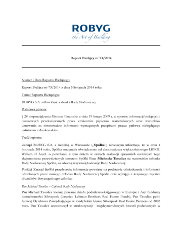 Raport Bieżący nr 73/2014 Numer i Data Raportu Bieżącego: Raport Bieżący nr 73/2014 z dnia 5 listopada 2014 roku Temat Raportu Bieżącego: ROBYG S.A. –Powołanie członka Rady Nadzorczej Podstawa prawna: § 28 rozporządzenia Ministra Finansów z dnia 19 lutego 2009 r. w sprawie informacji bieżących i okresowych przekazywanych przez emitentów papierów wartościowych oraz warunków uznawania za równoważne informacji wymaganych przepisami prawa państwa niebędącego państwem członkowskim. Treść raportu: Zarząd ROBYG S.A. z siedzibą w Warszawie („Spółka”) niniejszym informuje, że w dniu 4 listopada 2014 roku, Spółka otrzymała oświadczenie od akcjonariusza większościowego LBPOL William II S.á.r.l. o powołaniu z tym dniem w ramach realizacji uprawnień osobistych tego akcjonariusza przewidzianych statutem Spółki Pana Michaela Tsoulies na stanowisko członka Rady Nadzorczej Spółki, na obecną trzyletnią kadencję Rady Nadzorczej. Poniżej Zarząd Spółki przedstawia informacje powzięte na podstawie oświadczenia i informacji udzielonych przez nowego członka Rady Nadzorczej Spółki oraz wyciągu z krajowego rejestru dłużników dotyczącej tego członka: Pan Michael Tsoulies – Członek Rady Nadzorczej Pan Michael Tsoulies kieruje pracami działu podatkowo-księgowego w Europie i Azji funduszy nieruchomości Silverpeak (dawniej: Lehman Brothers Real Estate Funds). Pan Tsoulies pełni funkcję Dyrektora Zarządzającego w londyńskim biurze Silverpeak Real Estate Partners od 2005 roku. Pan Tsoulies uczestniczył w strukturyzacji międzynarodowych kwestii podatkowych w ponad 75 inwestycjach zrealizowanych na rynkach nieruchomości w 19 krajach Europy i Azji. Łączna wartość transakcji przekroczyła 7 mld USD. Pan Michael Tsoulies założył oddziały Silverpeak w Luksemburgu i na Mauritiusie, za pośrednictwem których zarządza kwestiami zgodności z przepisami finansowymi i podatkowymi ponad 1000 podmiotów położonych w ponad 20 krajach. Opracował i wprowadził polityki i procedury podatkowe i rachunkowe dla funduszy Silverpeak w Europie i Azji. Pan Michael Tsoulies rozpoczął pracę w Lehman Brothers w grudniu 2003 r. w oddziale w Atlancie w Georgii w USA jako Dyrektor działu podatkowo-księgowego funduszy nieruchomości Lehman Brothers na Amerykę Północną. Wcześniej Pan Tsoulies był zatrudniony jako Menedżer w oddziale Morgan Stanley w Atlancie w ramach zespołu ds. działalności funduszy nieruchomości w USA oraz pełnił stanowisko Menedżera ds. Podatkowych w firmie Ernst & Young na Florydzie. Pan Tsoulies posiada ponad 20-letnie doświadczenie w kwestiach podatkowych i księgowych dotyczących nieruchomości. Ukończył z wyróżnieniem studia licencjackie w zakresie księgowości i finansów na Uniwersytecie Stanu Floryda (Florida State University) oraz studia MBA na Uniwersytecie Stanu Georgia (Georgia State University). Pan Tsoulies posiada również uprawnienia biegłego rewidenta (CPA) w USA (aktualnie nie prowadzi praktyki w tym zakresie). Obecnie Pan Tsoulies nie prowadzi żadnej działalności konkurencyjnej poza Spółką ani też nie jest udziałowcem w żadnej spółce prowadzącej działalność konkurencyjną wobec Spółki ani też nie wykonuje żadnej funkcji w żadnym organie jakiejkolwiek osoby prawnej prowadzącej działalność konkurencyjną wobec Spółki. Pan Michael Tsoulies nie jest wpisany do rejestru dłużników niewypłacalnych prowadzonym na podstawie ustawa o KRS Podpisy osób zarządzających: Zbigniew Okoński – Prezes Zarządu ROBYG S.A. Artur Ceglarz – Wiceprezes Zarządu ROBYG S.A.