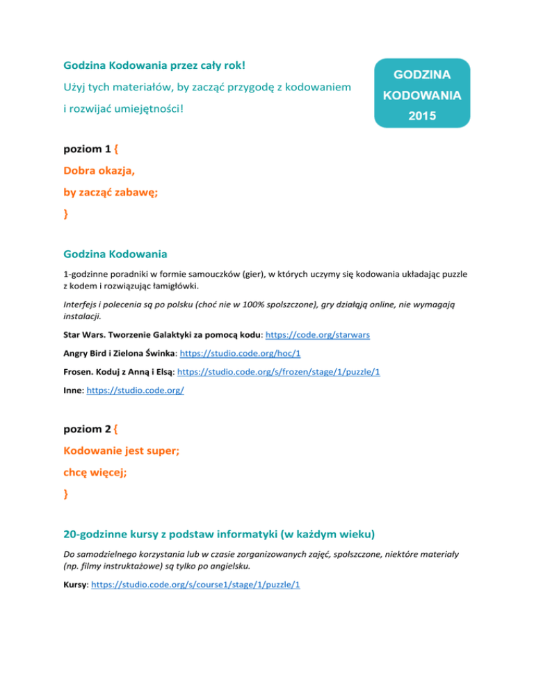 1-godzinne poradniki w formie samouczków (gier), w których uczymy się kodowania układając puzzle