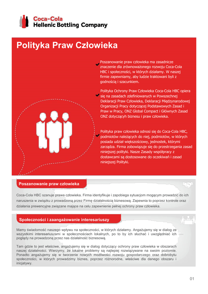 Polityka Praw Człowieka Poszanowanie praw człowieka ma zasadnicze znaczenie dla zrównoważonego rozwoju Coca-Cola HBC i społeczności, w których działamy. W naszej firmie zapewniamy, aby ludzie traktowani byli z godnością i szacunkiem. Polityka Ochrony Praw Człowieka Coca-Cola HBC opiera się na zasadach zdefiniowanych w Powszechnej Deklaracji Praw Człowieka, Deklaracji Międzynarodowej Organizacji Pracy dotyczącej Podstawowych Zasad i Praw w Pracy, ONZ Global Compact i Głównych Zasad ONZ dotyczącyh biznesu i praw człowieka. Polityka praw człowieka odnosi się do Coca-Cola HBC, podmiotów należących do niej, podmiotów, w których posiada udział większościowy, jednostek, którymi zarządza. Firma zobowiązuje się do przestrzegania zasad niniejszej polityki. Nasze Zasady współpracy z dostawcami są dostosowane do oczekiwań i zasad niniejszej Polityki. Poszanowanie praw człowieka Coca-Cola HBC szanuje prawa człowieka. Firma identyfikuje i zapobiega sytuacjom mogącym prowadzić do ich naruszenia w związku z prowadzoną przez Firmę działalnością biznesową. Zapewnia to poprzez kontrole oraz działania prewencyjne związane mające na celu zapewnienie pełnej ochrony praw człowieka. Społeczności i zaangażowanie interesariuszy Mamy świadomość naszego wpływu na społeczności, w których działamy. Angażujemy się w dialog ze wszystkimi interesariuszami w społecznościach lokalnych, po to by ich słuchać i uwzględniać ich poglądy na prowadzoną przez nas działalność biznesową. Tam gdzie to jest właściwe, angażujemy się w dialog dotyczący ochrony praw człowieka w obszarach naszej działalności. Wierzymy, że lokalne problemy są najlepiej rozwiązywane na swoim poziomie. Ponadto angażujemy się w tworzenie nowych możliwości rozwoju gospodarczego oraz dobrobytu społeczności, w których prowadzimy biznes, poprzez różnorodne, właściwe dla danego obszaru i inicjatywy. 01 Polityka Ochrony Praw Człowieka Promowanie różnorodności Cenimy różnorodność naszych pracowników i wkład, który wnoszą do naszej organizacji. Od wielu lat jesteśmy zaangażowani w tworzenie warunków wszystkim naszym pracowników do pełnego wykorzystania swojego potencjału, w których nie ma miejsca i przyzwolenia na dyskryminację i szykanowanie. Naszym celem jest środowisko pracy, wolne od dyskryminacji, czy nękania na tle rasowym, płci, koloru skóry, narodowości, pochodzenia społecznego, wyznania, wieku, niepełnosprawności, orientacji seksualnej, poglądów politycznych lub wszelkich innych form zdefiniowanych przez obowiązujące prawo. We wszystkich aspektach rekrutacji, zatrudnienia, wypłacania wynagrodzeń i świadczeń, zapewnienia szkoleń, awansów i przeniesień opieramy się o kwalifikacje, umiejętnościach, doświadczenie, spełnienie wymagań i standardów związanych z zajmowanym stanowiskiem oraz osiągnięte wyniki. Niezależnie od cech osobistych lub statusu pracownika, firma nie toleruje obraźliwego lub niewłaściwego zachowania, niesprawiedliwego traktowania lub wszelkiego rodzaju odwetu. Nie akceptujemy szykanowania w każdych okolicznościach związanych z pracą, zarówno w miejscu pracy jak i poza nim. Zasady te dotyczą nie tylko pracowników firmy, ale także partnerów biznesowych, z którymi pracujemy. Swoboda zrzeszania się i układy zbiorowe Szanujemy prawo naszych pracowników do tworzenia lub wstępowania (lub też nie) do związków zawodowych bez obawy represji, zastraszania lub nękania. Prowadzimy konstruktywny dialog w dobrej wierze z przedstawicielami prawnie ukonstytuowanych partnerów społecznych. Tworzenie bezpiecznego środowiska pracy Naszym nadrzędnym priorytetem jest bezpieczeństwo, zdrowie i dobro naszych pracowników. Zapewniamy bezpieczne i zdrowe miejsce pracy zgodnie z obowiązującymi przepisami bezpieczeństwa i ochrony zdrowia, wewnętrznymi regulacjami i wymaganiami w tym zakresie, minimalizując ryzyko wypadków, urazów i zagrożeń dla zdrowia. Wspólnie z naszymi pracownikami stale ulepszamy nasze środowisko pracy w obszarze zdrowia i bezpieczeństwa, identyfikujemy potencjalne zagrożenia i udoskonalamy wszystkie kwestie dotyczące zdrowia i bezpieczeństwa. Tworzenie przyjaznego środowiska pracy Tworzymy przyjazne środowisko pracy, wolne od przemocy, szykanowania, zastraszania oraz innych zakłócających, uciążliwych czynników wewnętrznych i zewnętrznych. Adekwatnie do potrzeb zapewniamy bezpieczeństwo i ochronę naszym pracownikom z poszanowaniem ich prywatności i godności. Niewolnictwo, praca przymusowa, handel ludźmi Nie akceptujemy i nie zgadzamy się na żadną formę korzystania z przymusowej siły roboczej oraz handlu ludźmi w ramach jakichkolwiek działań. 02 Polityka Ochrony Praw Człowieka Zatrudnianie dzieci Nie zatrudniamy osób nieletnich, które w świetle lokalnego prawa nie osiągnęły wieku umożliwiającego podjęcie pracy zgodnie z Konwencją Międzynarodowej Organizacji Pracy, Numer 138 oraz osób poniżej osiemnastego roku życia na stanowiskach, gdzie wykonywane są prace niebezpieczne zgodnie z Konwencją Międzynarodowej Organizacji Pracy, Numer 182. Czas pracy, wynagrodzenia, dodatkowe świadczenia Wynagradzamy pracowników zachowując konkurencyjność w porównaniu z warunkami w branży i lokalnym rynkiem pracy. Działamy w pełnej zgodności z prawem w zakresie wynagrodzeń, godzin pracy, nadgodzin i innych świadczeń pracowniczych. Zgłaszanie i wyjaśnianie nieprawidłowości Tworzymy otoczenie, w którym cenimy i szanujemy otwartą i szczerą komunikację wewnątrz naszej organizacji. Niniejsza Polityka służy przestrzeganiu obowiązujących praw pracy we wszystkich obszarach prowadzonej działalności. W firmie wdrożone są procedury zapewniające pełną poufności w przypadku zgłaszania naruszenia zasad, wątpliwości dotyczących zgodności polityki z prawem, zwyczajami i praktykami w miejscu pracy. Pytania lub zgłoszenie 