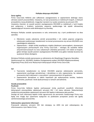 Polityka dotycząca HIV/AIDS Zarys ogólny Firma Coca-Cola Hellenic jest całkowicie zaangażowana w zapewnienie dobrego stanu zdrowia swoich pracowników. Uważamy, że nasi pracownicy w niektórych krajach, w których prowadzimy naszą działalność, mogą być narażeni na ryzyko zarażenia się wirusem HIV. Uważamy również, że wysoki poziom występowania HIV/AIDS w niektórych z tych krajów jest połączony z brakiem systemów wsparcia społecznego lub opieki zdrowotnej zapewniających leczenie osób dotkniętych tą chorobą. Niniejsza Polityka została opracowana w celu zmierzenia się z tymi problemami na dwa sposoby: • • Obniżenie ryzyka zakażenia wśród pracowników i ich rodzin poprzez programy edukacyjne podnoszące świadomość na temat przenoszenia się wirusa HIV/AIDS oraz zapobiegania zakażeniu. Zapewnienie – dzięki ścisłej współpracy między lokalnymi samorządami, stosownymi organizacjami pomocowymi oraz Firmą Coca-Cola – dostępu do zasobów leków antyretrowirusowych na rzecz zakażonych członków personelu i ich rodzin w krajach, gdzie istnieje wysoki poziom występowania HIV/AIDS oraz gdzie metody leczenia nie są jeszcze łatwo dostępne. Niniejsza Polityka została opracowana w odniesieniu do Wspólnego Programu Narodów Zjednoczonych ds. HIV/AIDS, Kodeksu Postępowania wobec HIV/AIDS Międzynarodowej Organizacji Pracy (ILO) oraz Wytycznych dotyczących Afryki Firmy Coca-Cola. Cel • • Tworzenie świadomości na temat HIV/AIDS poprzez edukowanie personelu, zapewnianie poufnego poradnictwa i doradztwa w celu zapewnienia, by zakażeni pracownicy byli traktowani z szacunkiem i poszanowaniem ich godności. Zapewnienie doradztwa w takich kwestiach jak wykonywanie testów, badania kontrolne, poufność i brak dyskryminacji w ramach zatrudnienia. Zasady przewodnie Poufność Firma Coca-Cola Hellenic będzie zachowywać ścisłą poufność wszelkich informacji dotyczących pracowników zakażonych wirusem HIV i ich stanu zdrowia. Dokumentacja medyczna pracowników zakażonych wirusem HIV będzie traktowana jako poufna. Dostęp do tych informacji będzie ściśle ograniczony do personelu medycznego Firmy oraz będą one mogły być ujawnione wyłącznie na podstawie przepisów prawa lub zgody zainteresowanego pracownika. Dobrowolne ujawnienie informacji Pracownik zakażony wirusem HIV lub cierpiący na AIDS nie jest zobowiązany do informowania o tym fakcie Firmy. Jeśli pracownik ujawni swemu przełożonemu lub przedstawicielowi działu kadr informacje na temat swego stanu zdrowia, takie jak zakażenie HIV/AIDS, przełożony zobowiązuje się do okazania wsparcia i wysłuchania pracownika, zwracając uwagę na jego główne obawy. Jeśli przedstawiciel działu kadr nie będzie posiadać informacji na temat tej sytuacji, przełożony skontaktuje się z nim w celu uzyskania porady i zasobów umożliwiających zaspokojenie potrzeb takiego pracownika, jednak wyłącznie za jego zgodą. Każdy przypadek będzie traktowany indywidualnie w celu zrównoważenia potrzeb pracownika z potrzebami firmy. Badania medyczne Firma nie będzie wymagać od osób ubiegających się o pracę lub swych obecnych pracowników ujawnienia informacji personalnych dotyczących statusu HIV/AIDS, chyba że wynikać to będzie z obowiązujących w danym kraju przepisów prawa. Pracownicy, chcący określić swój status HIV/AIDS, mogą poddać się dobrowolnemu badaniu, pod warunkiem wypełnienia formularza świadomej zgody i skorzystania z poradnictwa przed i po badaniu. Poradnictwo W przypadku braku możliwości skorzystania z poradnictwa, firma udostępni wszystkim pracownikom dodatkowe informacje i programy edukacyjne. W miarę możliwości i w stosownych przypadkach, tą obsługą i tymi programami zostaną również objęci członkowie rodzin pracowników. Firma będzie również starać się o zapewnienie wsparcia ze strony istniejących społecznych grup wsparcia i doradztwa. Informacje w tym zakresie można uzyskać w sposób poufny od Kierownictwa Działu Kadr lub przedstawiciela działu kadr. Ustalenia dostosowujące i zapewnienie zatrudnienia Firma Coca-Cola Hellenic podejmie wszelkie możliwe kroki w celu poszerzenia zakresu ustaleń dostosowujących do potrzeb pracowników cierpiących na choroby związane z HIV/AIDS. Zakres tych działań może obejmować ponowne ustalenie czasu pracy, zapewnienie specjalnego wyposażenia, możliwości korzystania z dodatkowych przerw wypoczynkowych, czasu wolnego na wizyty lekarskie, elastycznych zwolnień chorobowych, świadczenie pracy w niepełnym wymiarze godzin i powrót do pracy. Pracownicy zarażeni wirusem HIV mogą kontynuować świadczenie pracy i będą traktowani na równi z innymi pracownikami w zakresie szkoleń, awansów, przeniesień, dyscypliny i innych świadczeń. Postanowienia istniejących Polityk i Procedur firmy dotyczące urlopów chorobowych i niepełnosprawności będą mieć zastosowanie tak, jak w przypadku chorób przewlekłych. Firma nie zwolni pracownika wyłącznie z przyczyn związanych z jego/jej statusem HIV/AIDS. Jeśli stan zdrowia pracownika chorego na AIDS będzie uniemożliwiał kontynuowanie świadczenia pracy i w przypadku wyczerpania się alternatywnych możliwości dotyczących zatrudnienia, włączając wydłużony okres chorobowy, stosunek zatrudnienia może zostać rozwiązany zgodnie z przepisami dotyczącymi zakazu dyskryminacji, prawa pracy oraz politykami i procedurami firmy. Ograniczenie i zarządzanie ryzykiem Firma Coca-Cola Hellenic podejmie starania w celu zapewnienia bezpiecznego i zdrowego środowiska pracy, włączając stosowanie zabezpieczeń i dostarczanie oraz utrzymywanie sprzętu zabezpieczającego i pierwszej pomocy. Procedury składania zażaleń i procedury dyscyplinarne dotyczące zakazu dyskryminacji Jeśli pracownik uzna, że jest traktowany w sposób dyskryminujący z powodu swojego stanu zdrowia, zwłaszcza HIV/AIDS, będzie mógł skorzystać z wewnęt