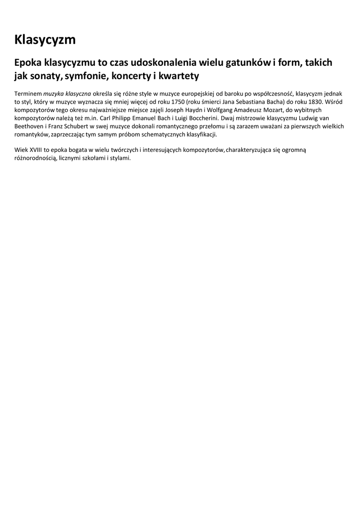 Klasycyzm Epoka klasycyzmu to czas udoskonalenia wielu gatunków i form, takich jak sonaty, symfonie, koncerty i kwartety Terminem muzyka klasyczna określa się różne style w muzyce europejskiej od baroku po współczesność, klasycyzm jednak to styl, który w muzyce wyznacza się mniej więcej od roku 1750 (roku śmierci Jana Sebastiana Bacha) do roku 1830. Wśród kompozytorów tego okresu najważniejsze miejsce zajęli Joseph Haydn i Wolfgang Amadeusz Mozart, do wybitnych kompozytorów należą też m.in. Carl Philipp Emanuel Bach i Luigi Boccherini. Dwaj mistrzowie klasycyzmu Ludwig van Beethoven i Franz Schubert w swej muzyce dokonali romantycznego przełomu i są zarazem uważani za pierwszych wielkich romantyków, zaprzeczając tym samym próbom schematycznych klasyfikacji. Wiek XVIII to epoka bogata w wielu twórczych i interesujących kompozytorów, charakteryzująca się ogromną różnorodnością, licznymi szkołami i stylami. Dawid grający na harfie, 1881, Ludwik Wiesiołowski, Muzeum Narodowe w Warszawie Mapa myśli Hafciarka, 1817, Georg Friedrich Kersting, Muzeum Narodowe w Warszawie Portret pianistki Marii Szymanowskiej, 1816, Zofia Woyno, Muzeum Narodowe w Warszawie Ptasi koncert, 1778, Richard Earlom, Muzeum Narodowe w Warszawie Początek epoki klasycznej wyznacza styl galant, który czasowo obejmuje lata 1720-1780. Jednym z pierwszych wyrazicieli klasycyzmu był Johann Mattheson, którego zdaniem prąd ten miał uosabiać nowy racjonalny styl, stojący w opozycji do tradycji, przede wszystkim do muzyki barokowej nasyconej kontrapunktem, skomplikowanej, coraz trudniejszej i nudniejszej w odbiorze (Das neu-eröffnete Orchestre, 1713 r.). Warto pamiętać, że w tym okresie twórczość Jana Sebastiana Bacha wydawała się współczesnym zbyt uczona i monotonna, chociaż doceniano mistrzostwo warsztatu lipskiego mistrza i jego umiejętności wykonawcze. Muzyka w nowym stylu miała być zatem wesoła, przyjemna, prosta, ale też elegancka. Jej głównym celem miało być wprawianie słuchaczy w dobry nastrój. Jak mawiał Voltaire, „być galant, to poszukiwać przyjemności”. W tym celu twórcy komponujący w stylu galant wybrali fakturę homofoniczną (rezygnując z barokowej polifonii), gdzie śpiewną, uroczą, pełną wdzięku i łatwą do zapamiętania melodię miał wspierać lekki akompaniament. Z muzyki operowej styl galant szybko przewędrował do muzyki instrumentalnej, szczególnie do muzyki klawiszowej, nieobciążanej nadmierną wirtuozerią. Nowe ideały zaadaptowali też twórcy wczesnej symfoniki, przyczyniając się do powstania nowego gatunku orkiestrowego. Do najważniejszych kompozytorów stylu galant należą Johann Christian Bach, którego styl odcisnął silne piętno na melodyce Mozarta oraz takich kompzytorów jak Giovanni Battista Sammartini, Giovanni Battista Pergolesi, Nicolà Porpora, Johann Adolf Hasse, Baldassare Galuppi, Luigi Boccherini, Johann Schobert, Georg Christoph Wagenseil i wielu innych. W połowie XVIII wieku rozwijał się styl wzmożonej uczuciowości (niem. Empfindsamerstil), utożsamiany głównie z Berlinem i szkołą północno-niemiecką. Był to styl osobisty, subiektywny, pełen niespodzianek, ekspresyjny, momentami nawet ekscentryczny. Pożądany efekt osiągano za pomocą dość nieregularnych melodii przerywanych pauzami, zbudowanych ze skoków,bogatych w nieoczekiwane rozwiązania harmoniczne i dalekie modulacje. Styl ten preferował tonacje molowe, nie unikał też polifonii, co zbliżało go do stylu barokowego, a także inspirował się muzyką wokalną (obecność instrumentalnych recytatywów w sonatach, symfoniach itp.). Idealnym medium okazał się klawikord — instrument określany jako „samotny, melancholijny, o niewysłowionej słodyczy”. Najbardziej oryginalnym twórcą stylu wzmożonej uczuciowości był Carl Philipp Emanuel Bach, który w połowie XVIII wieku postulował, że muzyka instrumentalna na równi z wokalną potrafi oddawać emocje i przemawiać do słuchaczy, pod warunkiem jednak, że wykonawca będzie rozumiał prezentowaną przez siebie muzykę i będzie nią w najwyższym stopniu przejęty. Swoimi sonatami, fantazjami, rondami, koncertami na instrumenty klawiszowe Bach wpłynął m.in. na twórczość Józefa Haydna. Inni ciekawi kompozytorzy to bracia Franz i Georg Benda, a także Carl Heinrich i Johann Gottlieb Graun i Wilhelm Friedemann Bach. W połowie lat 60. kompozytorzy przejęli wykształcone na gruncie niemieckiej sztuki ideały stylu burzy i naporu (z niem. Sturm und Drang), który w przeciwieństwie do racjonalizmu i obiektywizmu właściwego dla oświecenia i klasycyzmu, był wyrazem skrajnych emocji i subiektywizmu. Przykładem jest twórczość symfoniczna Haydna z lat 1860–70 i takie jej cechy, jak molowe tonacje, melodie pełne skoków,synkopowane rytmy, tremola skrzypiec i pełen dramatyzmu wyraz. Do wspomnianych stylów należałoby jeszcze dodać osiągnięcia szkół lokalnych, jak choćby szkoły mannheimskiej i starowiedeńskiej, z których zdobyczy czerpali zarówno Józef Haydn, jak i Wolfgang Amadeusz Mozart. Wszystkie te style określone zbiorczym terminem preklasycyzmu przyczyniły się do rozwoju klasycyzmu wiedeńskiego, utożsamianego z twórczością Haydna, Mozarta i Beethovena. Muzykę dojrzałego klasycyzmu najdoskonalej ilustruje twórczość Wolfganga Amadeusza Mozarta — prostota i naturalność przy jednoczesnej głębi ekspresji, klarowność formy, doskonała instrumentacja, zgodne połączenie śpiewności i blasku melodii à la galant z pogłębioną ekspresją Empifindsamerstil i Sturm und Drang, a także przywrócenie znaczenia polifonii. Ta synteza, polegająca na równowadze wszystkich elementów muzyki, symbolizuje dziś najdoskonalsze osiągnięcie w historii muzyki, niedoścignione piękno, boski pierwiastek w twórczej działalności człowieka. Spośród klasyków wiedeńskich zdecydowanie wyróżnia się jednak postać Ludw
