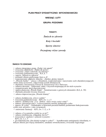 PLAN PRACY DYDAKTYCZNO- WYCHOWAWCZEJ MIESIĄC: LUTY GRUPA: POZIOMKI TEMATY: Śmiech to zdrowie Koty i kociaki Sporty zimowe Poznajemy różne zawody ŚMIECH TO ZDROWIE • zabawa integrująca grupę „Podaj i nie upuść” • ćwiczenia oddechowe „Statek do portu” • ćwiczenie „Gdzie schowały się imiona?” • ćwiczenia grafomotoryczne – KA, k. 7 • zajęcia „Śmiech to zdrowie” • poznanie obrazu graficznego litery c, C • rozpoznawanie odgłosów śmiechu – chichot, głośny śmiech • „Wesoła buźka” – praca z obrazkiem, rozpoznawanie i nazywanie cech charakteryzujących różne stany uczuciowe, odgrywanie scenek dramowych • słuchanie i inscenizacja wiersza H. Szayerowej Ulica Śmieszna • zabawa słowami – budowanie zdań z użyciem niepasujących do nich wyrazów • zorganizowanie akcji charytatywnej • zajęcia plastyczne „Wesoły klaun” – konstruowanie z gotowych elementów (KA, k. 30) • słuchanie piosenki Zostanę klaunem • zabawa improwizacyjna „Wesołe klauny” • zabawa dydaktyczna „Gra w sylaby” • ćwiczenia grafomotoryczne – KP3, ćw. 1, s. 5 • zabawa dydaktyczna „Czy dobrze znasz swoje części ciała?” • zabawa inscenizacyjna z wykorzystaniem metody pedagogiki cyrku • zajęcia „W cyrku” – rozbudzanie w dzieciach poczucia humoru, poznawanie funkcjonowania cyrku oraz artystów z nim związanych • omówienie ilustracji – KP3, ćw. 1 i 2, s. 8– • zabawa „Czy potrafisz zrobić to, co ja?” • zabawa ortofoniczna „Odgadnij, kto to?” • ćwiczenia w analizie i syntezie wyrazów – KP3, ćw. 2, s. 5 • gra matematyczna „Kto dzisiaj wystąpi w cyrku?” – kształtowanie umiejętności określania, w którym zbiorze jest więcej elementów, ustalanie równoliczności, ćwiczenie logicznego myślenia, doskonalenie umiejętności współpracy w zespole • zabawa dydaktyczna „Złap piłkę i dokończ słowo” • dokończenie rysowania śmiesznej postaci – KP3, ćw. 1, s. 12 • zabawa dydaktyczna „Powtórz to, co ja” • zajęcia matematyczne „Dyrektor zamyka cyrk” – kształtowanie umiejętności liczenia i rozróżnianie błędnego liczenia od poprawnego, ustalanie liczebności zbiorów, doskonalenie umiejętności stosowania liczebników porządkowych, kształtowanie umiejętności uważnego słuchania poleceń • zabawa dydaktyczna „Kolekcja” – rozwija- nie zdolności intelektualnych, ćwiczenie w analizie i syntezie głoskowej wyrazów • ćwiczenia grafomotoryczne – projektowa- nie stroju dla klauna (odbijanie wzorów stemplami) • ćwiczenia oddechowe – dmuchanie na zawieszone na nitce kulki waty • zabawy kreatywne „Dzień cudaka” – rozbudzanie w dzieciach poczucia humoru, budzenie radości ze wspólnych zabaw w grupie, pobudzanie wyobraźni i twórczego myślenia, rozwijanie spontanicznej improwizacji, kształtowanie sprawności fizycznej, budowanie poczucia własnej wartości, ćwiczenia w analizie i syntezie wyrazów • „Kim jestem?” – prezentacja cudaków • zorganizowanie „Parady cudaków” • zajęcia plastyczne z wykorzystaniem techniki rysunku ołówkiem „Czy to ja?” – poznanie pojęcia karykatura, ćwiczenie spostrzegawczości w dostrzeganiu szczegółów wyglądu człowieka, budowanie poczucia własnej wartości, nauka wypowiadania się w sposób kulturalny na temat prac plastycznych innych autorów, doskonalenie techniki rysunku ołówkiem • konkurs na najlepszy rysunek wykonany z zawiązanymi oczami • oglądanie dowolnej karykatury • wykonanie ćwiczenia „Kogo przedstawia fotografia, a kto jest narysowany obok?” – KP3, ćw. 1, s. 9 • zabawy z lusterkiem – oglądanie twarzy, dostrzeganie elementów wyglądu, które można wyolbrzymić na rysunku • aktywność plastyczna „Czy potrafisz narysować swoją karykaturę?” – KP3, ćw. 2, s. 13 • zorganizowanie wystawy prac KOTY I KOCIAKI • zabawa integrująca grupę „Podaj pałeczkę” • ćwiczenia grafomotoryczne – KP3, ćw. 1, s. 15 • zabawa dydaktyczna „Niezwykły sklep” – wzbogacanie słownictwa, ćwiczenia w wybrzmiewaniu głoski w nagłosie, utrwalenie obrazu graficznego poznanych liter • rozmowa z dziećmi na temat zwierząt żyjących w ogrodach zoologicznych • „Zwiedzamy zoo” – zaplanowanie wycieczki autokarowej do zoo lub wirtualne zwiedzanie ogrodu zoologicznego • „Zwierzęta egzotyczne” – układanie puzzli • wyszukiwanie w albumach przyrodniczych informacji o zwierzęciu znajdującym się na ułożonej ilustracji • praca z mapą świata • rozwiązywanie zagadek o zwierzętach egzotycznych • omówienie ilustracji – KP3, ćw. 1, s. 14 • „Czy drapieżne koty żyją w Polsce?” – oglądanie krótkich filmów o rysiach • zabawa dydaktyczna „Tropem kota” • zabawa ruchowa przy fragmencie utworu Ch. C. Saint-Saënsa z cyklu Karnawał zwierząt • zajęcia plastyczne „Minizoo” techniką lepienia z gliny • zabawa dramowa „Rzeźby zwierząt” • wspólne sprzątanie po skończonej pracy • układanie rytmów z mozaiki geometrycznej zgodnie z podawanymi sygnałami dźwiękowymi • ćwiczenie graficzne „Wzorki w kwadracie” • zabawa „Sylabowe pudełka” – ćwiczenia w analizie sylabowej wyrazów • zajęcia badawcze „Dlaczego koty mają wąsy?”– rozwijanie zainteresowań przyrodniczych, dostrzeganie szczegółów w wyglądzie kota, nabywanie wiedzy na temat związku budowy zwierzęcia z jego trybem życia • • • • • • poznanie obrazu graficznego litery k, K – KP3, s. 16 ćwiczenia w analizie i syntezie wyrazów zajęcia badawcze „Poznajemy kota” „Dlaczego koty mają wąsy?” – próba odpowiedzi na pytanie zabawa dydaktyczna „Co je kot?” zabawa relaksacyjna „Kocie mruczanki” • słuchanie fragmentu opowiadania S. Grabowskiego, M. Nejmana „Przygody kota Filemona” • zabawa ortofoniczna ,,O czym mruczą koty?”– ćwiczen