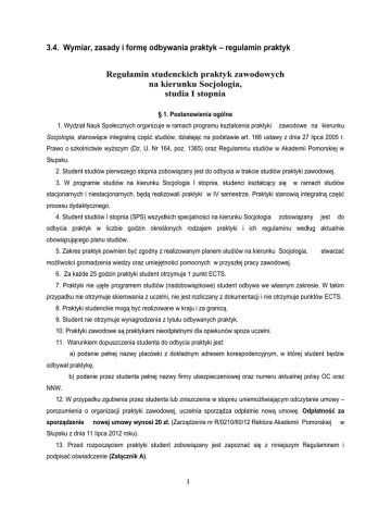 3.4. Wymiar, zasady i formę odbywania praktyk – regulamin praktyk Regulamin studenckich praktyk zawodowych na kierunku Socjologia, studia I stopnia § 1. Postanowienia ogólne 1. Wydział Nauk Społecznych organizuje w ramach programu kształcenia praktyki zawodowe na kierunku Socjologia, stanowiące integralną część studiów, działając na podstawie art. 166 ustawy z dnia 27 lipca 2005 r. Prawo o szkolnictwie wyższym (Dz. U. Nr 164, poz. 1365) oraz Regulaminu studiów w Akademii Pomorskiej w Słupsku. 2. Student studiów pierwszego stopnia zobowiązany jest do odbycia w trakcie studiów praktyki zawodowej. 3. W programie studiów na kierunku Socjologia I stopnia, studenci kształcący się w ramach studiów stacjonarnych i niestacjonarnych, będą realizowali praktyki w IV semestrze. Praktyki stanowią integralną część procesu dydaktycznego. 4. Student studiów I stopnia (SPS) wszystkich specjalności na kierunku Socjologia zobowiązany jest do odbycia praktyk w liczbie godzin określonych rodzajem praktyki i ich regulaminu według aktualnie obowiązującego planu studiów. 5. Zakres praktyk powinien być zgodny z realizowanym planem studiów na kierunku Socjologia, stwarzać możliwości gromadzenia wiedzy oraz umiejętności pomocnych w przyszłej pracy zawodowej. 6. Za każde 25 godzin praktyki student otrzymuje 1 punkt ECTS. 7. Praktyki nie ujęte programem studiów (nadobowiązkowe) student odbywa we własnym zakresie. W takim przypadku nie otrzymuje skierowania z uczelni, nie jest rozliczany z dokumentacji i nie otrzymuje punktów ECTS. 8. Praktyki studenckie mogą być realizowane w kraju i za granicą. 9. Student nie otrzymuje wynagrodzenia z tytułu odbywanych praktyk. 10. Praktyki zawodowe są praktykami nieodpłatnymi dla opiekunów spoza uczelni. 11. Warunkiem dopuszczenia studenta do odbycia praktyki jest: a) podanie pełnej nazwy placówki z dokładnym adresem korespodencyjnym, w której student będzie odbywał praktykę, b) podanie przez studenta pełnej nazwy firmy ubezpieczeniowej oraz numeru aktualnej polisy OC oraz NNW. 12. W przypadku zgubienia przez studenta lub zniszczenia w stopniu uniemożliwiającym odczytanie umowy – porozumienia o organizacji praktyki zawodowej, uczelnia sporządza odpłatnie nową umowę. Odpłatność za sporządzenie nowej umowy wynosi 20 zł. (Zarządzenie nr R/0210/60/12 Rektora Akademii Pomorskiej w Słupsku z dnia 11 lipca 2012 roku). 13. Przed rozpoczęciem praktyki student zobowiązany jest zapoznać się z niniejszym Regulaminem i podpisać oświadczenie (Załącznik A). 1 § 2. Organizacja praktyk Praktykant winien przebywać na terenie placówki 5 godzin dziennie. Podczas praktyki studenci korzystają z opieki zakładowego opiekuna praktyk. Praktyka zawodowa realizowana jest w formie zorganizowanej pracy. § 3. Termin praktyk Studenci studiów stacjonarnych i niestacjonarnych odbywają praktyki w następującym trybie: 100 godzin (4 tygodnie) praktyk zawodowych w IV semestrze. § 4. Cele praktyki Głównym celem praktyk zawodowych jest praktyczne sprawdzenie i wykorzystanie przez studentów wiedzy oraz zdobytych i posiadanych umiejętności (w tym społecznych) i kompetencji. Celami szczegółowymi są: - poznanie zadań, cech, form, organizacji, metod i wyników pracy instytucji, organizacji bądź firmy; - poznanie środowiskowych uwarunkowań funkcjonowania danej organizacji, zastosowanie wiedzy i umiejętności zdobytych na studiach w praktyce, w szczególności z zakresu przeprowadzenia badań empirycznych. § 5. Studenci podczas odbywania praktyk powinni: a) poznać organizację pracy w instytucji/firmy (przepisy, zasady współpracy z innymi instytucjami i przedsiębiorstwami, pomieszczenia, wyposażenie, zasady finansowania); b) poznać formy i metody pracy stosowane w przedsiębiorstwie, instytucji lub organizacji, w której student odbywa praktykę; c) nabyć umiejętności planowania własnej pracy w zakresie samodzielnej realizacji powierzonych zadań; d) uczestniczyć w działaniach przewidzianych w planie pracy instytucji, organizacji lub firmy; e) wykazywać inicjatywę i wykonywać samodzielną pracę na jej rzecz w granicach określonych przez kierownictwo; f) prowadzić obserwację w celu zebrania wniosków przydatnych w późniejszej działalności zawodowej. § 6. Miejsce odbywania praktyk 1. Praktyka może się odbywać w jednostkach gospodarczych, jednostkach administracji państwowej, administracji samorządowej, instytucjach społecznych, placówkach służby zdrowia, kultury, instytucjach naukowo-badawczych, lub innych jednostkach organizacyjnych, jeżeli charakter odbywanych przez studenta praktyk będzie zgodny z profilem kierunku studiów. 2. Praktyka może się odbywać w ramach realizowanych programów Unii Europejskiej, wymian zagranicznych skierowanych do studentów. 2 3. Studenci mogą odbywać praktykę zawodową w samodzielnie wybranych przez siebie instytucjach (placówek) zgodnie z profilem kierunku studiów i w ramach liczby godzin dydaktycznych przewidzianych planem studiów. 4. Zalecane placówki: - specjalność kryminologia i socjologia penitencjarna : instytucje administracji państwowej i samorządowej, ośrodki badań społecznych, ośrodki prognozowania społecznego, instytucje profilaktyczne, prewencyjne, wychowawcze i korekcyjne. Są to m.in.: policja, zakłady karne, zakłady wychowawcze i poprawcze, zespoły kuratorskiej służby sądowej, straż graniczna, straż miejska, itp., a także w organizacje pozarządowe i inne organizacji społeczne; - specjalność zarzadzanie zasobami ludzkimi: przedsiębiorstwa, instytucje administracji państwowej i samorządowej, ośrodki badań społecznych, jednostki organizacyjne sektora publicznego i inne organizacji społeczne. Są to m.in.: agencje pośrednictwa pracy, przedsiębiorstwa handlowe, usługowe i produkcyjne (dział kadr lub dział szkoleń), placówki edukacyjne (biuro karier), urzędy pracy, agencje konsultingowe, 