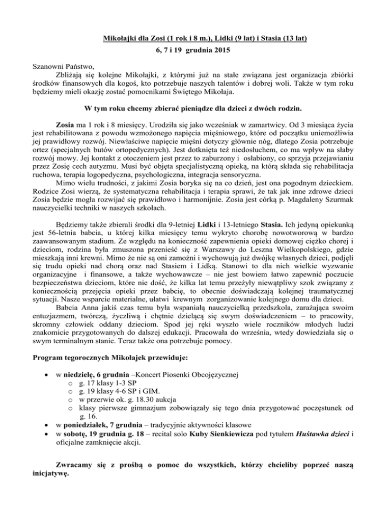 Mikołajki dla Zosi (1 rok i 8 m.), Lidki (9 lat) i Stasia (13 lat) 6, 7 i 19 grudnia 2015 Szanowni Państwo, Zbliżają się kolejne Mikołajki, z którymi już na stałe związana jest organizacja zbiórki środków finansowych dla kogoś, kto potrzebuje naszych talentów i dobrej woli. Także w tym roku będziemy mieli okazję zostać pomocnikami Świętego Mikołaja. W tym roku chcemy zbierać pieniądze dla dzieci z dwóch rodzin. Zosia ma 1 rok i 8 miesięcy. Urodziła się jako wcześniak w zamartwicy. Od 3 miesiąca życia jest rehabilitowana z powodu wzmożonego napięcia mięśniowego, które od początku uniemożliwia jej prawidłowy rozwój. Niewłaściwe napięcie mięśni dotyczy głównie nóg, dlatego Zosia potrzebuje ortez (specjalnych butów ortopedycznych). Jest dotknięta też niedosłuchem, co ma wpływ na słaby rozwój mowy. Jej kontakt z otoczeniem jest przez to zaburzony i osłabiony, co sprzyja przejawianiu przez Zosię cech autyzmu. Musi być objęta specjalistyczną opieką, na którą składa się rehabilitacja ruchowa, terapia logopedyczna, psychologiczna, integracja sensoryczna. Mimo wielu trudności, z jakimi Zosia boryka się na co dzień, jest ona pogodnym dzieckiem. Rodzice Zosi wierzą, że systematyczna rehabilitacja i terapia sprawi, że tak jak inne zdrowe dzieci Zosia będzie mogła rozwijać się prawidłowo i harmonijnie. Zosia jest córką p. Magdaleny Szurmak nauczycielki techniki w naszych szkołach. Będziemy także zbierali środki dla 9-letniej Lidki i 13-letniego Stasia. Ich jedyną opiekunką jest 56-letnia babcia, u której kilka miesięcy temu wykryto chorobę nowotworową w bardzo zaawansowanym stadium. Ze względu na konieczność zapewnienia opieki domowej ciężko chorej i dzieciom, rodzina była zmuszona przenieść się z Warszawy do Leszna Wielkopolskiego, gdzie mieszkają inni krewni. Mimo że nie są oni zamożni i wychowują już dwójkę własnych dzieci, podjęli się trudu opieki nad chorą oraz nad Stasiem i Lidką. Stanowi to dla nich wielkie wyzwanie organizacyjne i finansowe, a także wychowawcze – nie jest bowiem łatwo zapewnić poczucie bezpieczeństwa dzieciom, które nie dość, że kilka lat temu przeżyły niewątpliwy szok związany z koniecznością przejęcia opieki przez babcię, to obecnie doświadczają kolejnej traumatycznej sytuacji. Nasze wsparcie materialne, ułatwi krewnym zorganizowanie kolejnego domu dla dzieci. Babcia Anna jakiś czas temu była wspaniałą nauczycielką przedszkola, zarażająca swoim entuzjazmem, twórczą, życzliwą i chętnie dzielącą się swym doświadczeniem – to pracowity, skromny człowiek oddany dzieciom. Spod jej ręki wyszło wiele roczników młodych ludzi znakomicie przygotowanych do dalszej edukacji. Pracowała do września, wtedy dowiedziała się o swym terminalnym stanie. Teraz także ona potrzebuje pomocy. Program tegorocznych Mikołajek przewiduje: w niedzielę, 6 grudnia –Koncert Piosenki Obcojęzycznej o g. 17 klasy 1-3 SP o g. 19 klasy 4-6 SP i GIM. o w przerwie ok. g. 18.30 aukcja o klasy pierwsze gimnazjum zobowiązały się tego dnia przygotować poczęstunek od g. 16. w poniedziałek, 7 grudnia – tradycyjnie aktywności klasowe w sobotę, 19 grudnia g. 18 – recital solo Kuby Sienkiewicza pod tytułem Huśtawka dzieci i oficjalne zamknięcie akcji. Zwracamy się z prośbą o pomoc do wszystkich, którzy chcieliby poprzeć naszą inicjatywę. Jak co roku chcemy zorganizować loterię, a z niektórych fantów przygotowanych i przyniesionych przez dzieci /zgodnie z Państwa oczekiwaniami i życzeniami/ - aukcję. Dotychczas każdy los był losem wygranym, mamy nadzieję, że podobnie będzie w tym roku. Planujemy, że każdy będzie kosztował 5 złotych. Jeżeli macie Państwo możliwość dostarczenia nam fantów /np. gadżetów firmowych, ciekawych przedmiotów, przygotowanych smakołyków itp./prosimy o przyniesienie ich do sekretariatu lub zgłoszenie się do koordynatora akcji - Joli Dąbrowskiej. Aukcja wybranych przedmiotów odbędzie się w niedzielę 6 grudnia w przerwie Festiwalu Piosenki Obcojęzycznej. Już od 16.oo (przed koncertem) otwarte będą stoiska międzynarodowych smakołyków przygotowanych przez pierwsze klasy gimnazjalne pod kierunkiem Pań Wychowawczyń. Zachęcamy też do wykonania fantów własnoręcznie, razem z rodziną, do motywowania i wsparcia pomysłów, które będą chciały samodzielnie zrealizować dzieci. Czekamy także na zgłoszenia inicjatyw klasowych, które będą urozmaiceniem organizowanych w szkole imprez /na pewno pojawią się wśród nich kawiarenki, zdjęcia itp./ Oprócz loterii planujemy warsztaty i występy teatralne oraz popisy taneczne w czasie akcji szkolnej. Liczymy na Państwa zaangażowanie i aktywny udział w proponowanych działaniach. Jesteśmy przekonani, że dawanie i dzielenie się- to źródła prawdziwej radości, a prawdziwym zaszczytem jest możliwość służenia innym- bycie pomocnikiem Świętego Mikołaja. Wykorzystajmy tę szansę. Jolanta Dąbrowska kordynator akcji W ramach Mikołajek dla Zosi, Lidki i Stasia Kuba Sienkiewicz w naszej szkole - recital solo - Huśtawka dzieci 19 grudnia 2015 g. 18.oo Przyjdź koniecznie!!! Karty wstępu to cegiełki na rzecz akcji: 100 zł – bilet rodzinny (rodzice + dziecko/ dzieci) 50 zł – bilet dla osoby dorosłej i 10 zł – bilet dla ucznia