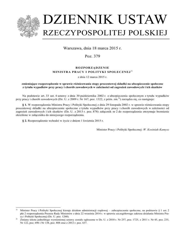 DZIENNIK USTAW RZECZYPOSPOLITEJ POLSKIEJ Warszawa, dnia 18 marca 2015 r. Poz. 379 RO ZPO R ZĄ D ZE N I E M INI S TR A P RA CY I P O L I TYK I SPO Ł E C ZN EJ 1) z dnia 12 marca 2015 r. zmieniające rozporządzenie w sprawie różnicowania stopy procentowej składki na ubezpieczenie społeczne z tytułu wypadków przy pracy i chorób zawodowych w zależności od zagrożeń zawodowych i ich skutków Na podstawie art. 33 ust. 4 ustawy z dnia 30 października 2002 r. o ubezpieczeniu społecznym z tytułu wypadków przy pracy i chorób zawodowych (Dz. U. z 2009 r. Nr 167, poz. 1322, z późn. zm.2)) zarządza się, co następuje: § 1. W rozporządzeniu Ministra Pracy i Polityki Społecznej z dnia 29 listopada 2002 r. w sprawie różnicowania stopy procentowej składki na ubezpieczenie społeczne z tytułu wypadków przy pracy i chorób zawodowych w zależności od zagrożeń zawodowych i ich skutków (Dz. U. z 2013 r. poz. 878) załącznik nr 2 do rozporządzenia otrzymuje brzmienie określone w załączniku do niniejszego rozporządzenia. § 2. Rozporządzenie wchodzi w życie z dniem 1 kwietnia 2015 r. Minister Pracy i Polityki Społecznej: W. Kosiniak-Kamysz 1) 2) Minister Pracy i Polityki Społecznej kieruje działem administracji rządowej – zabezpieczenie społeczne, na podstawie § 1 ust. 2 pkt 2 rozporządzenia Prezesa Rady Ministrów z dnia 22 września 2014 r. w sprawie szczegółowego zakresu działania Ministra Pracy i Polityki Społecznej (Dz. U. poz. 1260). Zmiany tekstu jednolitego wymienionej ustawy zostały ogłoszone w Dz. U. z 2010 r. Nr 257, poz. 1725, z 2011 r. Nr 45, poz. 235, Nr 122, poz. 696 i Nr 138, poz. 808 oraz z 2012 r. poz. 637. Dziennik Ustaw –2– Poz. 379 Załącznik do rozporządzenia Ministra Pracy i Polityki Społecznej z dnia 12 marca 2015 r. (poz. 379) GRUPY DZIAŁALNOŚCI, KATEGORIE RYZYKA I STOPY PROCENTOWE SKŁADKI NA UBEZPIECZENIE WYPADKOWE DLA GRUP DZIAŁALNOŚCI Lp. Grupy działalności Kod PKD* Kategorie ryzyka Stopy procentowe składki (%) 1 2 3 4 5 1 Uprawy rolne, chów i hodowla zwierząt, łowiectwo, włączając działalność usługową A-01 9 2,53 2 Leśnictwo i pozyskiwanie drewna A-02 11 3,06 3 Rybactwo A-03 7 2,00 4 Wydobywanie węgla kamiennego i węgla brunatnego (lignitu) B-05 12 3,33 5 Górnictwo ropy naftowej i gazu ziemnego B-06 13 3,60 6 Górnictwo rud metali B-07 12 3,33 7 Pozostałe górnictwo i wydobywanie B-08 8 2,26 8 Działalność usługowa wspomagająca górnictwo i wydobywanie B-09 9 2,53 9 Produkcja artykułów spożywczych C-10 6 1,73 10 Produkcja napojów C-11 6 1,73 11 Produkcja wyrobów tytoniowych C-12 4 1,20 12 Produkcja wyrobów tekstylnych C-13 5 1,47 13 Produkcja odzieży C-14 3 0,93 14 Produkcja skór i wyrobów ze skór wyprawionych C-15 3 0,93 15 Produkcja wyrobów z drewna oraz korka, z wyłączeniem mebli; produkcja wyrobów ze słomy i materiałów używanych do wyplatania C-16 8 2,26 16 Produkcja papieru i wyrobów z papieru C-17 6 1,73 Dziennik Ustaw –3– Poz. 379 1 2 3 4 5 17 Poligrafia i reprodukcja zapisanych nośników informacji C-18 4 1,20 18 Wytwarzanie i przetwarzanie koksu i produktów rafinacji ropy naftowej C-19 6 1,73 19 Produkcja chemikaliów i wyrobów chemicznych C-20 6 1,73 20 Produkcja podstawowych substancji farmaceutycznych oraz leków i pozostałych wyrobów farmaceutycznych C-21 4 1,20 21 Produkcja wyrobów z gumy i tworzyw sztucznych C-22 6 1,73 22 Produkcja wyrobów z pozostałych mineralnych surowców niemetalicznych C-23 8 2,26 23 Produkcja metali C-24 10 2,80 24 Produkcja metalowych wyrobów gotowych, z wyłączeniem maszyn i urządzeń C-25 7 2,00 25 Produkcja komputerów, wyrobów elektronicznych i optycznych C-26 4 1,20 26 Produkcja urządzeń elektrycznych C-27 5 1,47 27 Produkcja maszyn i urządzeń, gdzie indziej niesklasyfikowana C-28 7 2,00 28 Produkcja pojazdów samochodowych, przyczep i naczep, z wyłączeniem motocykli C-29 6 1,73 29 Produkcja pozostałego sprzętu transportowego C-30 7 2,00 30 Produkcja mebli C-31 6 1,73 31 Pozostała produkcja wyrobów C-32 4 1,20 32 Naprawa, konserwacja i instalowanie maszyn i urządzeń C-33 6 1,73 33 Wytwarzanie i zaopatrywanie w energię elektryczną, gaz, parę wodną, gorącą wodę i powietrze do układów klimatyzacyjnych D-35 5 1,47 34 Pobór, uzdatnianie i dostarczanie wody E-36 5 1,47 35 Odprowadzanie i oczyszczanie ścieków E-37 6 1,73 Dziennik Ustaw –4– Poz. 379 1 2 3 4 5 36 Działalność związana ze zbieraniem, przetwarzaniem i unieszkodliwianiem odpadów; odzysk surowców E-38 7 2,00 37 Działalność związana z rekultywacją i pozostała działalność usługowa związana z gospodarką odpadami E-39 4 1,20 38 Roboty budowlane związane ze wznoszeniem budynków F-41 5 1,47 39 Roboty związane z budową obiektów inżynierii lądowej i wodnej F-42 7 2,00 40 Roboty budowlane specjalistyczne F-43 5 1,47 41 Handel hurtowy i detaliczny pojazdami samochodowymi; naprawa pojazdów samochodowych G-45 3 0,93 42 Handel hurtowy, z wyłączeniem handlu pojazdami samochodowymi G-46 3 0,93 43 Handel detaliczny, z wyłączeniem handlu detalicznego pojazdami samochodowymi G-47 3 0,93 44 Transport lądowy oraz transport rurociągowy H-49 4 1,20 45 Transport wodny H-50 6 1,73 46 Transport lotniczy H-51 3 0,93 47 Magazynowanie i działalność usługowa wspomagająca transport H-52 5 1,47 48 Działalność pocztowa i kurierska H-53 5 1,47 49 Działalność związana z zakwaterowaniem i usługami gastronomicznymi I 2 0,67 50 Informacja i komunikacja J 2 0,67 51 Działalność finansowa i ubezpieczeniowa K 2 0,67 52 Działalność związana z obsługą rynku nieruchomości L 3 0,93 53 Działalność profesjonalna, naukowa i techniczna M 2 0,67 54 Wynajem i dzierżawa N-77 4 1,20 Dziennik Ustaw * –5– Poz. 379 1 2 3 4 5 55 Działalność związana z zatrudnieniem N-78 5 1,47 56 Działalność organizatorów turystyki, pośredników i agentów turystycznych oraz pozostała działalność usługowa w zakresie rezerwacji i 