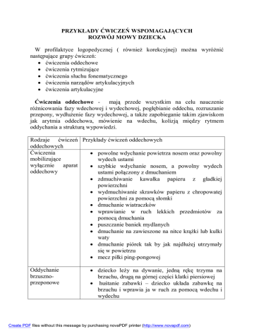 PRZYKŁADY ĆWICZEŃ WSPOMAGAJĄCYCH ROZWÓJ MOWY DZIECKA W profilaktyce logopedycznej ( również korekcyjnej) można wyróżnić następujące grupy ćwiczeń: ćwiczenia oddechowe ćwiczenia rytmizujące ćwiczenia słuchu fonematycznego ćwiczenia narządów artykulacyjnych ćwiczenia artykulacyjne Ćwiczenia oddechowe mają przede wszystkim na celu nauczenie różnicowania fazy wdechowej i wydechowej, pogłębianie oddechu, rozruszanie przepony, wydłużenie fazy wydechowej, a także zapobieganie takim zjawiskom jak arytmia oddechowa, mówienie na wdechu, kolizją między rytmem oddychania a strukturą wypowiedzi. Rodzaje ćwiczeń Przykłady ćwiczeń oddechowych oddechowych Ćwiczenia powolne wdychanie powietrza nosem oraz powolny mobilizujące wydech ustami wyłącznie aparat szybkie wdychanie nosem, a powolny wydech oddechowy ustami połączony z dmuchaniem zdmuchiwanie kawałka papieru z gładkiej powierzchni wydmuchiwanie skrawków papieru z chropowatej powierzchni za pomocą słomki dmuchanie wiatraczków wprawianie w ruch lekkich przedmiotów za pomocą dmuchania puszczanie baniek mydlanych dmuchanie na zawieszone na nitce krążki lub kulki waty dmuchanie piórek tak by jak najdłużej utrzymały się w powietrzu mecz piłki ping-pongowej Oddychanie brzusznoprzeponowe dziecko leży na dywanie, jedną rękę trzyma na brzuchu, drugą na górnej części klatki piersiowej huśtanie zabawki – dziecko układa zabawkę na brzuchu i wprawia ja w ruch za pomocą wdechu i wydechu Create PDF files without this message by purchasing novaPDF printer (http://www.novapdf.com) wprawianie w ruch przepony za pomocą śmiechu: staruszki – he he, kobiety – ha ha, mężczyzny – ho ho, dziewczynki – piskliwy hi hi, chłopca hałaśliwy hy hy Łączenie ćwiczeń oddechowych z ruchami rąk, nóg, tułowia wdech połączony z ruchem ramion – dłonie do przodu- wydech –odwrócenie dłoni – wdech dłonie do tyłu – wydech – odwrócenie dłoni wdech ręce ułożone na biodrach, w czasie wdechu łokcie odchylają się ku tyłowi, w czasie wydechu przesuwają się do przodu jednocześnie naciskając palcami brzuch ćwiczenia unoszenia rąk – wdech – unoszenie rąk do góry, wydech – powolne opuszczanie rak na dół ręce ułożone na karku, głowę odchylić daleko do tyłu jednocześnie mocno uwypuklić klatkę piersiową wykonując wdech, następnie pochylić górną część ciała do przodu wydmuchując powietrze z płuc Ćwiczenia oddechowe z jednoczesnym wypowiadaniem pojedynczych głosek naśladowanie syczenia gęsi z wymawianiem głoski „s” naśladowanie szumu wiatru z wypowiadaniem głoski „sz” wymawianie głosek ze zmiennym natężeniem głosu- raz ciszej, raz głośniej Ćwiczenia oddechowe związane mówieniem śpiewaniem unoszenie rąk do góry z jednoczesnym wypowiadaniem frazy: „słonko wschodzi coraz wyżej”, opuszczanie rąk z jednoczesnym wypowiadaniem frazy : „ a zachodzi coraz niżej” zabawa w orkiestrę „Jestem muzykantem konszalebantem” recytacja krótkich wierszyków np. „Papużko, papużko – powiedz mi cos na uszko. Nic ci nie powiem boś ty plotkarz, powtórzysz każdemu kogo spotkasz” z i Ćwiczenia rytmizujące – wyrabiają szybką orientację w czasie i przestrzeni, koncentrację uwagi, bezpośrednio wpływają na kształcenie makroruchów czyli Create PDF files without this message by purchasing novaPDF printer (http://www.novapdf.com) ruchów całego ciała jak również mikroruchów czyli ruchów narządów mownych. Ponadto wyrabiają wrażliwość na muzykę, kształcą słuch muzyczny oraz poczucie rytmu. Rodzaje ćwiczeń Przykłady ćwiczeń rytmizujących rytmizujących Ćwiczenia techniki walka z piłką- toczenie piłki w kierunku partnera i ruchu z powrotem żołnierski marsz z unoszeniem kolan do góry koń w cyrku – chodzenie z unoszeniem kolan oraz zmiana tempa chód na palcach Ćwiczenia metrorytmiczne marsz w umiarkowanym tempie marsz z akcentem rytmicznym piłka wędrowniczka – rzucanie piłki do partnera w określonym rytmie i tempie Łączenie tekstu z elementami ruchowymi i rytmicznymi stosowanie wyrazów dźwiękonaśladowczych zabawa „Na łące” – świerszcze – cyk cyk, żaby – kum kum rech rech, pszczoły – bzzz bzz Siała baba mak Uciekła mi przepióreczka Ćwiczenia słuchu fonematycznego – mają na celu doskonalenie różnicowanie fonemów, co ma znaczenie na proces komunikacji słownej, zarówno na jego odbiór jak i przekaz. Rodzaje ćwiczeń Przykłady ćwiczeń słuchu fonematycznego słuchu fonematycznego Rymy rozpoznawanie rymujących się par słów rozpoznawanie rymów – wybieranie rymującego się słowa rozpoznawanie rymów – szukanie słowa, które się nie rymuje tworzenie rymów tworzenie wielu rymów Rozróżnianie dobieranie par słów zaczynających się taką samą Create PDF files without this message by purchasing novaPDF printer (http://www.novapdf.com) głosek zaczynających i kończących słowa głoską dobieranie par słów kończących się taką samą głoską domino fonetyczne Analiza i synteza sylabowa i fonemowa synteza sylabowa słów analiza sylabowa słów synteza głoskowa słów analiza głoskowa słów Ćwiczenia narządów artykulacyjnych – mają one na celu usprawnienie narządów artykulacyjnych. Artykulacja to ruchy i układ narządów mowy przy wymawianiu określonej głoski. Rodzaje ćwiczeń Przykłady ćwiczeń narządów artykulacyjnych narządów artykulacyjnych Ćwiczenia żuchwy opuszczanie i podnoszenie żuchwy poziome ruchy żuchwy kręcenie kółek żuchwą „czesanie” warg „szufladka” „zimno” – drobne ruchy żuchwą przegryzanie żuchwy – napina się wszystkie mięśnie Ćwiczenia warg „karp” „zajączek” podnoszenie górnej wargi asymetryczne podnoszenie wargi górnej, raz lewej strony, raz prawej „cmoki” – głośne cmokanie cmokanie na boki – bez udziału żuchwy i kącików, tylko same w