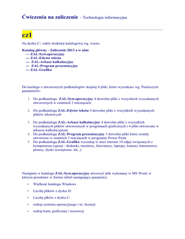 Ćwiczenia na zaliczenie - Technologia informacyjna cz1 Na dysku C:/ załóż strukturę katalogową wg. wzoru Katalog główny - Zaliczenie 2013 a w nim: --- ZAL-Syst.operacyjny --- ZAL-Edytor tekstu --- ZAL-Arkusz kalkulacyjny --- ZAL-Program prezentacyjny --- ZAL-Grafika Do każdego z utworzonych podkatalogów skopiuj 4 pliki, które wyszukasz wg. Poniższych parametrów: 1. Do podkatalogu ZAL-Syst.operacyjny 4 dowolne pliki z wszystkich wyszukanych utworzonych w ostatnich 2 miesiącach. 2. Do podkatalogu ZAL-Edytor tekstu 4 dowolne pliki z wszystkich wyszukanych plików tekstowych 3. Do podkatalogu ZAL-Arkusz kalkulacyjny 4 dowolne pliki z wszystkich wyszukanych plików utworzonych w programach graficznych i 4 pliki utworzone w arkuszu kalkulacyjnym. 4. Do podkatalogu ZAL-Program prezentacyjny 3 dowolne pliki które zostały utworzone w ostatnich 3 miesiącach w programie Power Point 5. Do podkatalogu ZAL-Grafika wyszukaj w sieci internet 10 zdjęć związanych z komputerem (sprzęt - drukarki, monitory, klawiatury, laptopy, kamery internetowe, plotery, dyski zewnętrzne, itd...) Następnie w katalogu ZAL-Syst.operacyjny utworzyć plik wykonany w MS Word, w którym przedstaw w formie tabeli następujące parametry: Wielkość katalogu Windows Liczbę plików z dysku D: Liczbę plków z dysku C: rodzaj systemu operacyjnego i nr. licencji rodzaj karty graficznej i sieciowej wielkość dysku twardego C:/ + obszar zajęty (w GB) ilość plików w Twoim komputerze z rozszerzeniem (.doc, .xls, .txt .ppt) – Gotowy plik ma mieć nazwę info-system.doc cz2 W podkatalogu ZAL-Edytor tekstu zapisz plik, który wykonasz w Ms Word. W tym pliku mają znaleźć się następujące informacje. nagłówek / stopka (w nagłówku wpisz swoje imię i nazwisko, w stopce rok, kierunek, grupa) całość w nagłówku i stopce wyśrodkuj. dodaj numerację stron wstaw tabelę (6 miesięcy) - styczeń - czerwiec. W każdym miesiącu ilość sprzedaży samochodów miesiąc ilość sprzedaży styczeń 682 luty 227 marzec 472 kwiecień 394 maj 512 czerwiec 407 na tej podstawie pod tabelą wstaw wykres - kolumnowy pod wykresem wstaw zdjęcie samochodu (marka dowolna z sieci internet). Dodaj do niego obramowanie - kolor zielony). pod zdjęciem wpisz 10 miesięcy wypunktowując je odpowiednim narzędziem z menu Format wg wzoru (I. Styczeń ......itd) zastosuj do tego czcionkę Arial 14 pkt z cieniem Pod wykresem ma znaleźć się 2 wzory (matematyczny i chemiczny) - czcionka Verdana 22 pkt - kolor zielony lub Gotowy plik zapisz w podkatalogu ZAL-Edytor tekstu pod nazwą info-word.doc z hasłem (hasło do odczytu zaliczenie) cz 3 W programie Ms Word wykonaj tabelę i wstaw następujące elementy (jak poniżej) - plik zapisz w podkatalogu ZAL-Edytor tekstu pod nazwą tabelka.doc cz 4 W tym ćwiczeniu zmieniamy odstępy pomiędzy liniami w tekście. Należy skopiować 10 zdań z sieci web (z dowolnej strony - np. ze strony Wikipedia.pl tekst dotyczący dysków twardych). Następnie zaznaczyć pierwsze zdanie i z narzędzi głównych wybrać opcję przedstawioną na poniższym rysunku (1,15). Po tych czynnościach dla każdego nowego zdania należy ustawić inny sposób ustawień odstępów pomiędzy liniami tekstu. -( 2,0, 2,5, 3,0, 1,0) - interlinia !!! cz 5 Do podkatalogu ZAL-Arkusz kalkulacyjny zapisz plik, który wykonasz w Ms Excel. Skopiuj wykonaną wcześniej tabelę z Ms Word (sprzedaż samochodów), wklej ją i wykonaj 3 różne wykresy (kołowy, kolumnowy i liniowy). Każdy z wykresów opisz wraz z opisaniem osi. W przypadku wykresu kołowego dodaj wartości procentowe z opcji wykresu. Każdy wykres musi być zamieszczony w oddzielnym arkuszu. Poza tabelą danych wykonaj zsumowania całości sprzedaży. Dodaj zapis walutowy (zł). Następnie w oddzielnej komórce dokonaj obliczenia średniej sprzedaży samochodów. W oddzielnym arkuszu (nowododanym) należy przedstawić formułę jeżeli na następującym przykładzie : Na przykładzie 6 prób biegu na 60 metrów przedstaw zasady kwalifikacji do turnieju głównego dla 5 uczestników, których czas będzie poniżej 9 sekund. Wynik (czas) powyżej 9 sekund wpisz komunikat „brak kwalifikacji” , natomiast uczestnicy, którzy ten czas będą mieli poniżej 9 sekun wpisz komunikat „kwalifikacja”. Następnie w osobnym arkuszu przedstaw 15 dowolnych liczb (powyżej 1000,00 zł), które należy przeliczyć na 3 różne waluty po aktualnym kursie. I tak 5 pierwszych liczb przedstaw w przeliczeniu na Euro, 5 następnych na Dolara i pięć ostatnich na Funta brytyjskiego. Gotowy plik zapisz w tym podkatalogu pod nazwą info-excel.xls. cz 6 Otwórz Arkusz kalkulacyjny Excel i na przykładzie 10 liczb przedstaw zasadę sumowania oraz w komórce poniżej oblicz średnią z tych 10-ciu liczb. Następnie scal 5 dowolnych komórek. Po scaleniu wpisz tam tekst ale w kierunku pionowym – Dodaj kolor np. żółty do tej scalonej komórki. W tym samym pliku, ale w arkuszu 2 przedstaw na przykładzie 3 przykładów możliwości wykorzystania formuły Jeżeli W arkuszu 3 w tym samym pliku wpisz 5 nazwisk i po 5 ocen a następnie oblicz średnią każdej z tych osób. Cały plik zapisz w katalogu ZAL-Arkusz kalkulacyjny, który wcześniej założyłaś(eś) pod nazwą obliczenia excel.xls. cz 7 W edytorze graficznym Paint narysuj 2 przykłady dotyczące obliczeń matematycznych np. a następnie po zaznaczeniu skopiuj go do MS Word i opisz w jaki sposób wykonać to działanie. nie kopiować tych !!! – to tylko przykłady Plik zapisz w katalogu ZAL-Edytor tekstu pod nazwą przykłady-Paint.doc cz 8 Korzystając z sieci web utworzyć prezentację w programie Power Point. Prezentacja powinna składać się z min 6 slajdów. Tematyka - Maszyny i urządzenia, Sport, Turystyka, Edukacja - do wyboru. Całość prezentacji musi uwzględniać dodanie tekstu, tabeli, wykresu, dźwięk (mp3, vaw), zdjęcia oraz animacji (np. gif) Na całą prezentację należy "nałożyć" animację