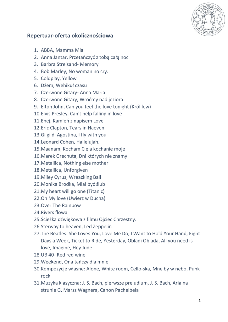 Repertuar-oferta okolicznościowa 1. ABBA, Mamma Mia 2. Anna Jantar, Przetańczyć z tobą całą noc 3. Barbra Streisand- Memory 4. Bob Marley, No woman no cry. 5. Coldplay, Yellow 6. Dżem, Wehikuł czasu 7. Czerwone Gitary- Anna Maria 8. Czerwone Gitary, Wróćmy nad jeziora 9. Elton John, Can you feel the love tonight (Król lew) 10.Elvis Presley, Can't help falling in love 11.Enej, Kamień z napisem Love 12.Eric Clapton, Tears in Haeven 13.Gi gi di Agostina, I fly with you 14.Leonard Cohen, Hallelujah. 15.Maanam, Kocham Cie a kochanie moje 16.Marek Grechuta, Dni których nie znamy 17.Metallica, Nothing else mother 18.Metallica, Unforgiven 19.Miley Cyrus, Wreacking Ball 20.Monika Brodka, Miał być ślub 21.My heart will go one (Titanic) 22.Oh My love (Uwierz w Ducha) 23.Over The Rainbow 24.Rivers flowa 25.Ścieżka dźwiękowa z filmu Ojciec Chrzestny. 26.Sterway to heaven, Led Zeppelin 27.The Beatles: She Loves You, Love Me Do, I Want to Hold Your Hand, Eight Days a Week, Ticket to Ride, Yesterday, Obladi Oblada, All you need is love, Imagine, Hey Jude 28.UB 40- Red red wine 29.Weekend, Ona tańczy dla mnie 30.Kompozycje własne: Alone, White room, Cello-ska, Mne by w nebo, Punk rock 31.Muzyka klasyczna: J. S. Bach, pierwsze preludium, J. S. Bach, Aria na strunie G, Marsz Wagnera, Canon Pachelbela 1 2