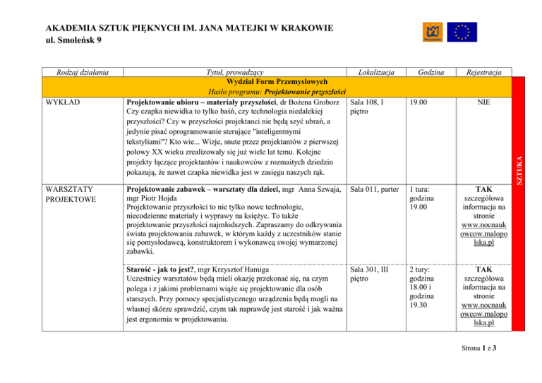 AKADEMIA SZTUK PIĘKNYCH IM. JANA MATEJKI W KRAKOWIE ul. Smoleńsk 9 WYKŁAD WARSZTATY PROJEKTOWE Tytuł, prowadzący Lokalizacja Wydział Form Przemysłowych Hasło programu: Projektowanie przyszłości Projektowanie ubioru – materiały przyszłości, dr Bożena Groborz Sala 108, I Czy czapka niewidka to tylko baśń, czy technologia niedalekiej piętro przyszłości? Czy w przyszłości projektanci nie będą szyć ubrań, a jedynie pisać oprogramowanie sterujące "inteligentnymi tekstyliami"? Kto wie... Wizje, snute przez projektantów z pierwszej połowy XX wieku zrealizowały się już wiele lat temu. Kolejne projekty łączące projektantów i naukowców z rozmaitych dziedzin pokazują, że nawet czapka niewidka jest w zasięgu naszych rąk. Projektowanie zabawek – warsztaty dla dzieci, mgr Anna Szwaja, mgr Piotr Hojda Projektowanie przyszłości to nie tylko nowe technologie, niecodzienne materiały i wyprawy na księżyc. To także projektowanie przyszłości najmłodszych. Zapraszamy do odkrywania świata projektowania zabawek, w którym każdy z uczestników stanie się pomysłodawcą, konstruktorem i wykonawcą swojej wymarzonej zabawki. Sala 011, parter Starość - jak to jest?, mgr Krzysztof Hamiga Sala 301, III Uczestnicy warsztatów będą mieli okazję przekonać się, na czym piętro polega i z jakimi problemami wiąże się projektowanie dla osób starszych. Przy pomocy specjalistycznego urządzenia będą mogli na własnej skórze sprawdzić, czym tak naprawdę jest starość i jak ważna jest ergonomia w projektowaniu. Godzina 19.00 Rejestracja NIE 1 tura: godzina 19.00 TAK szczegółowa informacja na stronie www.nocnauk owcow.malopo lska.pl 2 tury: godzina 18.00 i godzina 19.30 TAK szczegółowa informacja na stronie www.nocnauk owcow.malopo lska.pl Strona 1 z 3 SZTUKA Rodzaj działania AKADEMIA SZTUK PIĘKNYCH IM. JANA MATEJKI W KRAKOWIE ul. Smoleńsk 9 PREZENTACJE MULTIMEDIALNE Ażur kontra ruch w luksografii, dr Piotr Witosławski, tech. Marcin Limanowski Zajęcia w ciemni fotograficznej. Uczestnicy zapoznają się z możliwością rejestracji obrazu przy użyciu medium fotografii. Warsztaty poświęcone będą pracy w klasycznej ciemni z użyciem powiększalników i odczynników chemicznych. Studio i ciemnia fotograficzna, Budynek w oficynie, Sala 003 18.00 – 22.00 NIE Od pomysłu do projektu – komputerowe wspomaganie projektowania, mgr Jakub Gołębiewski, mgr Grzegorz Matusik Warsztaty pokażą wycinek pracy projektanta wzornictwa przemysłowego, narzędzia i techniki wspomagające projektowanie oraz prototypowanie. Sala 303, III piętro 18.00 – 22.00 NIE Szybkie prototypowanie – frezarka cyfrowa, spec. Maciej Syrzistie Sala 009, Parter W trakcie prezentacji uczestnicy będą mogli zapoznać się z obsługą frezarki cyfrowej umożliwiającej szybkie prototypowanie w trzech wymiarach. 18.00 – 22.00 NIE Warsztaty - magia koloru, dr Miłosz Pobiedziński, warsztaty dla dzieci 5-10 lat. Uczestnicy będą mieli możliwość zapoznania się z profesjonalnym warsztatem artysty malarza, wiedzą na temat barwy, nauczą się mieszać farby, aby uzyskać pożądany kolor Sala 315, III piętro 18.00 – 22.00 NIE Rysunek konstruowany w procesie projektowania produktu, dr Anna Liskiewicz Prezentacja dotyczy zagadnienia procesu szybkiej wizualizacji obiektów z wyobraźni przy pomocy odręcznego rysunku konstruowanego wg zasad perspektywy linearnej. Sala 104, I piętro 18.00, 20.00 NIE SZTUKA PREZENTACJE/ WARSZTATY NON STOP Strona 2 z 3 AKADEMIA SZTUK PIĘKNYCH IM. JANA MATEJKI W KRAKOWIE ul. Smoleńsk 9 Mapping 3D, mgr Dawid Kozłowski Dynamiczna prezentacja multimedialna, mapowana na zewnętrznych ścianach budynku Wydziału Form Przemysłowych. Malarstwo, rzeźba, grafika, intermedia jako ważny i twórczy element w warsztacie projektanta. Hol na III piętrze 18.00 – 22.00 NIE Strona 3 z 3