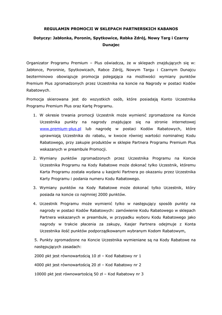 REGULAMIN PROMOCJI W SKLEPACH PARTNERSKICH KABANOS Dotyczy: Jabłonka, Poronin, Spytkowice, Rabka Zdrój, Nowy Targ i Czarny Dunajec Organizator Programu Premium – Plus oświadcza, że w sklepach znajdujących się w: Jabłonce, Poroninie, Spytkowicach, Rabce Zdrój, Nowym Targu i Czarnym Dunajcu bezterminowo obowiązuje promocja polegająca na możliwości wymiany punktów Premium Plus zgromadzonych przez Uczestnika na koncie na Nagrody w postaci Kodów Rabatowych. Promocja skierowana jest do wszystkich osób, które posiadają Konto Uczestnika Programu Premium Plus oraz Kartę Programu. 1. W okresie trwania promocji Uczestnik może wymienić zgromadzone na Koncie Uczestnika punkty na www.premium-plus.pl nagrody lub znajdujące nagrodę w się postaci na stronie Kodów internetowej Rabatowych, które uprawniają Uczestnika do rabatu, w kwocie równiej wartości nominalnej Kodu Rabatowego, przy zakupie produktów w sklepie Partnera Programu Premium Plus wskazanych w preambule Promocji. 2. Wymiany punktów zgromadzonych przez Uczestnika Programu na Koncie Uczestnika Programu na Kody Rabatowe może dokonać tylko Uczestnik, któremu Karta Programu została wydana u kasjerki Partnera po okazaniu przez Uczestnika Karty Programu i podania numeru Kodu Rabatowego. 3. Wymiany punktów na Kody Rabatowe może dokonać tylko Uczestnik, który posiada na koncie co najmniej 2000 punktów. 4. Uczestnik Programu może wymienić tylko w następujący sposób punkty na nagrody w postaci Kodów Rabatowych: zamówienie Kodu Rabatowego w sklepach Partnera wskazanych w preambule, w przypadku wyboru Kodu Rabatowego jako nagrody w trakcie płacenia za zakupy, Kasjer Partnera odejmuje z Konta Uczestnika ilość punktów podporządkowanym wybranym Kodom Rabatowym, 5. Punkty zgromadzone na Koncie Uczestnika wymieniane są na Kody Rabatowe na następujących zasadach: 2000 pkt jest równowartością 10 zł – Kod Rabatowy nr 1 4000 pkt jest równowartością 20 zł – Kod Rabatowy nr 2 10000 pkt jest równowartością 50 zł – Kod Rabatowy nr 3 6. Uczestnik Programu nie może w trakcie trwania promocji odebrać Kodów Rabatowych przekraczających równowartość 152000 punktów. Kody Rabatowe odebrane przez Uczestnika nie przekraczają wartości w określonej w art. 21 ust. pkt 68 ustawy o podatku dochodowym od osób fizycznych z dnia 26 lipca 1991r., dochód z tego tytułu nie podlega opodatkowaniu podatkiem dochodowym na podstawie powyższej regulacji. 7. Kody rabatowe posiadają swój nominał, który uprawnia do uzyskania rabatu w trakcie dokonywania zakupów u Partnera objętego promocją o kwotę nominału wskazanego w Kodzie Rabatowym. Kody Rabatowe nie podlegają wymianie na pieniądze. Kody Rabatowe nie mogą być przedmiotem sprzedaży, ani przekazania osobie trzeciej. 8. Z wymiany punktów na Kody Rabatowe Uczestnicy mogą skorzystać tylko w trakcie trwania promocji. 9. W pozostałym zakresie nie uregulowanym w niniejszym regulaminie promocji obowiązuje Regulamin znajdujący się na stronie organizatora www.premiumplus.pl.