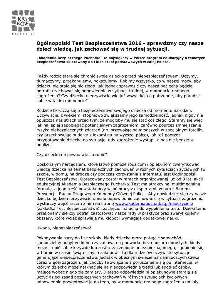 Ogólnopolski Test Bezpieczeństwa 2016 – sprawdźmy czy nasze dzieci wiedzą, jak zachować się w trudnej sytuacji. „Akademia Bezpiecznego Puchatka” to największy w Polsce program edukacyjny o tematyce bezpieczeństwa skierowany do I klas szkół podstawowych w całej Polsce. Każdy rodzic stara się chronić swoje dziecko przed niebezpieczeństwem. Uczymy, tłumaczymy, przekonujemy, pokazujemy. Robimy wszystko, co w naszej mocy, aby dziecku nie stało się nic złego. Jak jednak sprawdzić czy nasza pociecha będzie potrafiła zachować się odpowiednio w sytuacji trudnej, w momencie realnego zagrożenia? Czy dziecko rzeczywiście wie już wszystko, co potrzebne, aby poradzić sobie w takim momencie? Rodzice troszczą się o bezpieczeństwo swojego dziecka od momentu narodzin. Oczywiście, z wiekiem, stopniowo zwiększamy jego samodzielność, jednak nigdy nie opuszcza nas strach przed tym, że mogłoby mu się stać coś złego. Staramy się więc jak najlepiej zapobiegać potencjalnym zagrożeniom, zarówno poprzez zmniejszanie ryzyka niebezpiecznych zdarzeń (np. przewożąc najmłodszych w specjalnym foteliku czy przechowując pudełka z lekami na najwyższej półce), jak też poprzez przygotowanie dziecka na sytuacje, gdy zagrożenie wystąpi, a nas nie będzie w pobliżu. Czy dziecko na pewno wie co robić? Doskonałym narzędziem, które łatwo pomoże rodzicom i opiekunom zweryfikować wiedzę dziecka na temat bezpiecznych zachowań w różnych sytuacjach życiowych (w szkole, w domu, na drodze czy podczas korzystania z Internetu) jest Ogólnopolski Test Bezpieczeństwa. Opracowany został w ramach organizowanej już od 8 lat, akcji edukacyjnej Akademia Bezpiecznego Puchatka. Test ma atrakcyjną, multimedialną formułę, a jego treść powstała przy współpracy z ekspertami, w tym z Biurem Prewencji i Ruchu Drogowego Komendy Głównej Policji. Aby dowiedzieć się czy nasze dziecko będzie rzeczywiście umiało odpowiednio zachować się w sytuacji zagrożenia wystarczy wejść razem z nim na stronę www.akademiapuchatka.pl/nauczyciele (zakładka Test Bezpieczeństwa) i zachęcić malucha do wypełnienia testu. Dzięki temu przekonamy się czy potrafi zastosować nasze rady w praktyce oraz zweryfikujemy obszary, które wciąż sprawiają mu kłopot i wymagają dodatkowej nauki. Uwaga, niebezpieczeństwo! Pokonywanie trasy do i ze szkoły, kiedy dziecko może potrącić samochód, samodzielny pobyt w domu czy zabawa na podwórku bez nadzoru dorosłych, kiedy może zrobić sobie krzywdę lub zostać zaczepione przez nieznajomego, zgubienie się w tłumie w czasie świątecznych zakupów – to dla rodziców oczywiste sytuacje generujące niebezpieczeństwo. Jednak w obecnym świecie na najmłodszych czeka coraz więcej zagrożeń, jak choćby te związane z poruszaniem się po Internecie, w którym dziecko może natknąć się na nieodpowiednie treści lub spotkać osoby, mające wobec niego złe zamiary. Dlatego odpowiedzialni opiekunowie starają się uczyć dzieci zasad bezpiecznych zachowań w różnych sytuacjach życiowych i odpowiednio przygotować je do tego, by w momencie realnego zagrożenia umiały zminimalizować niebezpieczeństwo lub odpowiednio zareagować na jego skutki. Poświęcamy wiele czasu na rozmowy, ostrzeganie przed następstwami lekkomyślnych zachowań i dawanie dobrego przykładu, jednak często wciąż nie mamy pewności czy rzeczywiście nasza pociecha będzie umiała sobie poradzić w sytuacji, gdy niebezpieczeństwo przestanie być tylko teorią. Więcej informacji udziela: Michael Bridge Communication: Emilia Hahn e-mail: [email protected] tel. 516 168 873, 502 325 812 Anna Dziemidowicz e-mail: [email protected] tel. 516 168 873 Akademia Bezpiecznego Puchatka: Dorota Liszka, Manager ds. Komunikacji Korporacyjnej Grupy Maspex e-mail: [email protected] tel.: 33 870 82 04 Powered by TCPDF (www.tcpdf.org)
