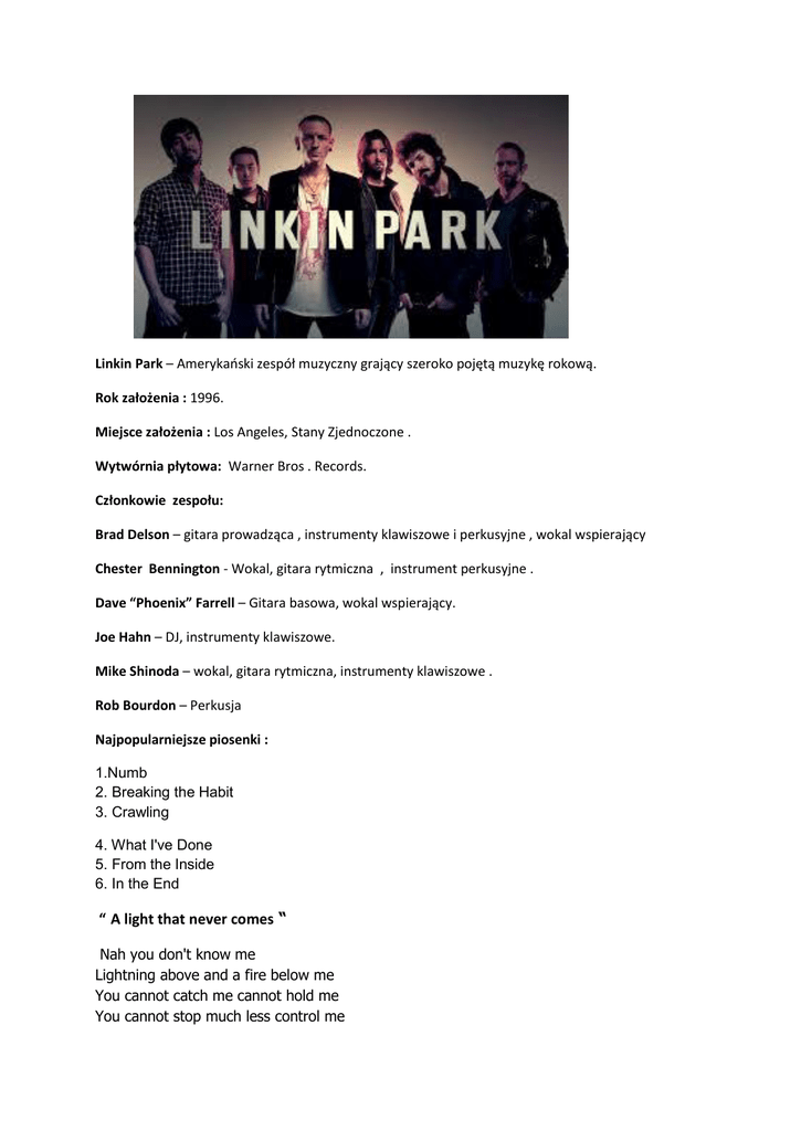 Linkin Park – Amerykaoski zespół muzyczny grający szeroko pojętą muzykę rokową. Rok założenia : 1996. Miejsce założenia : Los Angeles, Stany Zjednoczone . Wytwórnia płytowa: Warner Bros . Records. Członkowie zespołu: Brad Delson – gitara prowadząca , instrumenty klawiszowe i perkusyjne , wokal wspierający Chester Bennington - Wokal, gitara rytmiczna , instrument perkusyjne . Dave “Phoenix” Farrell – Gitara basowa, wokal wspierający. Joe Hahn – DJ, instrumenty klawiszowe. Mike Shinoda – wokal, gitara rytmiczna, instrumenty klawiszowe . Rob Bourdon – Perkusja Najpopularniejsze piosenki : 1.Numb 2. Breaking the Habit 3. Crawling 4. What I've Done 5. From the Inside 6. In the End “ A light that never comes “ Nah you don't know me Lightning above and a fire below me You cannot catch me cannot hold me You cannot stop much less control me When it rains it pours When the floodgates open, brace your shores That pressure don't care when it breaks your doors Say it's all you can take, better take some more 'Cause I know what it's like test fate Had my shoulders pressed with that weight Stood up strong in spite of that hate Night gets darkest right before dawn What don't kill you makes you more strong And I been waiting for it so long [Chorus] The nights go on Waiting for a light that never comes I chase the sun Waiting for a light that never comes Oh Oh Oh Waiting for a light that never comes…. Tłumaczenie: Nie, nie znacie mnie Nade mną błyskawice, a pode mną ogień Nie możecie mnie złapać, nie możecie mnie zatrzymać Nie możecie przestać o wiele mniej mną sterować Gdy pada, to zawsze ulewa Gdy śluzy otwierają się / przygotuj swe podpory Tego ciśnienia nie obchodzi, kiedy wyważy Twoje drzwi Mówisz, to wszystko co możesz znieść / lepiej znoś trochę więcej Ponieważ wiem, jak to jest sprawdzać los Ramiona miałem przytłoczone tym ciężarem Wstałem silniejszy, mimo tej nienawiści Noc staje się najciemniejsza, tuż przed świtem Co Cię nie zabije, uczyni silniejszym A ja czekałem na to tak długo Noce trwają Czekając na światło, które nigdy nie nadejdzie Gonię słońce Czekając na światło, które nigdy nie nadejdzie Oh Oh Oh Czekając na światło, które nigdy nie nadejdzie….. Myskaaa :3