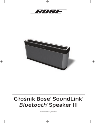 Głośnik Bose SoundLink Bluetooth Speaker III ® ® Podręcznik użytkownika ® Bezpieczeństwo Przeczytaj ten podręcznik Należy uważnie przeczytać zalecenia zamieszczone w tym podręczniku użytkownika. Ułatwią one prawidłowe konfigurowanie, obsługę i optymalne wykorzystanie systemu. Podręcznik należy zachować w celu ponownego wykorzystania. Symbol błyskawicy ze strzałką w trójkącie równobocznym ostrzega użytkownika o zagrożeniach związanych z obecnością w obudowie nieizolowanych podzespołów pod napięciem, którego wartość może być przyczyną porażenia prądem elektrycznym. Symbol wykrzyknika w trójkącie równobocznym, umieszczony na urządzeniu, wskazuje użytkownikowi ważne instrukcje dotyczące obsługi i konserwacji, zamieszczone w tym podręczniku. OSTRZEŻENIA: •Aby ograniczyć ryzyko pożaru i porażenia prądem elektrycznym, należy chronić urządzenie przed deszczem i wilgocią. •Nie należy narażać urządzenia na zachlapanie ani umieszczać w jego pobliżu naczyń wypełnionych płynami, takich jak wazony. Podobnie jak w przypadku innych urządzeń elektronicznych, należy zachować ostrożność, aby nie dopuścić do przedostania się rozlanych płynów do wnętrza urządzenia. Płyny mogą spowodować awarię i/lub zagrożenie pożarowe. •Na urządzeniu lub w jego pobliżu nie należy umieszczać źródeł otwartego ognia, np. zapalonych świec. •Nie należy używać innej ładowarki niż dostarczona specjalnie do użytku z tym urządzeniem. •Konieczne jest naładowanie akumulatora przed użyciem. Należy zawsze używać odpowiedniej ładowarki. Wskazówki dotyczące prawidłowego ładowania można znaleźć w instrukcji producenta. •Po dłuższych okresach przechowywania konieczne może być wielokrotne naładowanie i rozładowanie zestawu akumulatorów w celu uzyskania maksymalnej wydajności. •Zestaw akumulatorów uzyskuje najlepszą wydajność, pracując w normalnej temperaturze pokojowej (68°F ±23°F lub 20°C ±5°C). •Nie należy pozostawiać akumulatora w ładowarce przez dłuższy czas, gdy nie jest używany. •Nie należy wystawiać zestawu akumulatorów na działanie wysokich temperatur np. bezpośrednio padających promieni słonecznych, ognia itp. •Nie należy narażać zestawu akumulatorów na wstrząsy. •W przypadku wycieku z zestawu akumulatorów nie należy zezwolić na kontakt cieczy ze skórą lub oczami. W przypadku kontaktu należy przemyć zanieczyszczony obszar dużą ilością wody i zasięgnąć porady lekarskiej. •Nie należy używać zestawów akumulatorów, które nie zostały zaprojektowane do użytku z tym urządzeniem. •Zestaw akumulatorów należy przechowywać czystym i suchym miejscu. •Aby uzyskać akumulator zastępczy, należy skontaktować się z Działem Obsługi Klientów firmy Bose. Słowo Bluetooth® i logotypy są zastrzeżonymi znakami towarowymi firmy Bluetooth SIG, Inc., używanymi przez firmę Bose Corporation na mocy licencji. Wi-Fi jest zastrzeżonym znakiem towarowym organizacji Wi-Fi Alliance. ©2013 Bose Corporation. Żadnej części tej publikacji nie wolno powielać, modyfikować, rozpowszechniać ani wykorzystywać w inny sposób bez uprzedniego uzyskania pisemnego zezwolenia. 2 - Polski Bezpieczeństwo OSTRZEŻENIE: Produkt zawiera elementy magnetyczne. Wszelkie wątpliwości dotyczące wpływu tych elementów na funkcjonowanie implantów medycznych należy skonsultować z lekarzem. PRZESTROGA: Nie należy modyfikować systemu lub akcesoriów. Nieautoryzowane modyfikacje mogą niekorzystnie wpływać na bezpieczeństwo, zgodność z przepisami i wydajność systemu. UWAGI: •Etykieta jest umieszczona na dolnym panelu obudowy. •Jeżeli urządzenie jest wyłączane przez wyjęcie wtyczki przewodu zasilającego lub przedłużacza z gniazda sieciowego, należy zapewnić możliwość swobodnego korzystania z tego elementu wyposażenia. •Dołączony do urządzenia zasilacz sieciowy może być używany wyłącznie wewnątrz pomieszczeń. Nie zostało zaprojektowane z myślą o używaniu na zewnątrz, w pojazdach ani na łodziach, jak również nie zostało pod tym względem przetestowane. •Ten produkt jest przeznaczony do użytku jedynie z dostarczonym zasilaczem sieciowym lub też zasilaczem czy ładowarką firmy Bose® zaprojektowaną do użytku z tym produktem. Ważne zalecenia dotyczące bezpieczeństwa 1. Należy przeczytać podręcznik. 2. Należy zachować instrukcje. 3. Należy stosować się do wszystkich ostrzeżeń. 4. Należy postępować zgodnie z instrukcjami. 5. Nie należy korzystać z tego urządzenia w pobliżu wody. 6. Urządzenie należy czyścić wyłącznie przy użyciu suchej ściereczki. 7.Nie wolno blokować otworów wentylacyjnych. Urządzenie należy zainstalować zgodnie z zaleceniami producenta. 8.Nie wolno instalować urządzenia w pobliżu źródeł ciepła, takich jak kaloryfery, przewody kominowe, piece lub inne urządzenia (na przykład wzmacniacze) wydzielające ciepło. 9.Należy korzystać wyłącznie z dodatków/akcesoriów zalecanych przez producenta. 10.Urządzenie należy odłączyć od sieci zasilającej podczas burzy z wyładowaniami atmosferycznymi lub wówczas, gdy nie jest używane przez dłuższy czas. 11.Wykonanie wszystkich prac serwisowych należy zlecić wykwalifikowanemu personelowi. Naprawa w serwisie jest wymagana w przypadku jakiegokolwiek uszkodzenia urządzenia, np. uszkodzenia przewodu zasilającego lub wtyczki, dostania się do wnętrza urządzenia płynu lub przedmiotów, po narażeniu urządzenia na działanie deszczu lub wilgoci, gdy urządzenie nie działa normalnie lub jeśli zostało upuszczone. Informacje dotyczące urządzeń generujących zakłócenia elektryczne To urządzenie jest zgodne z normami FCC i Industry Canada dotyczącymi limitów narażenia na promieniowanie o częstotliwościach radiowych określonych ogólnie dla ludzi. Urządzenie nie może znajdować się w pobliżu ani