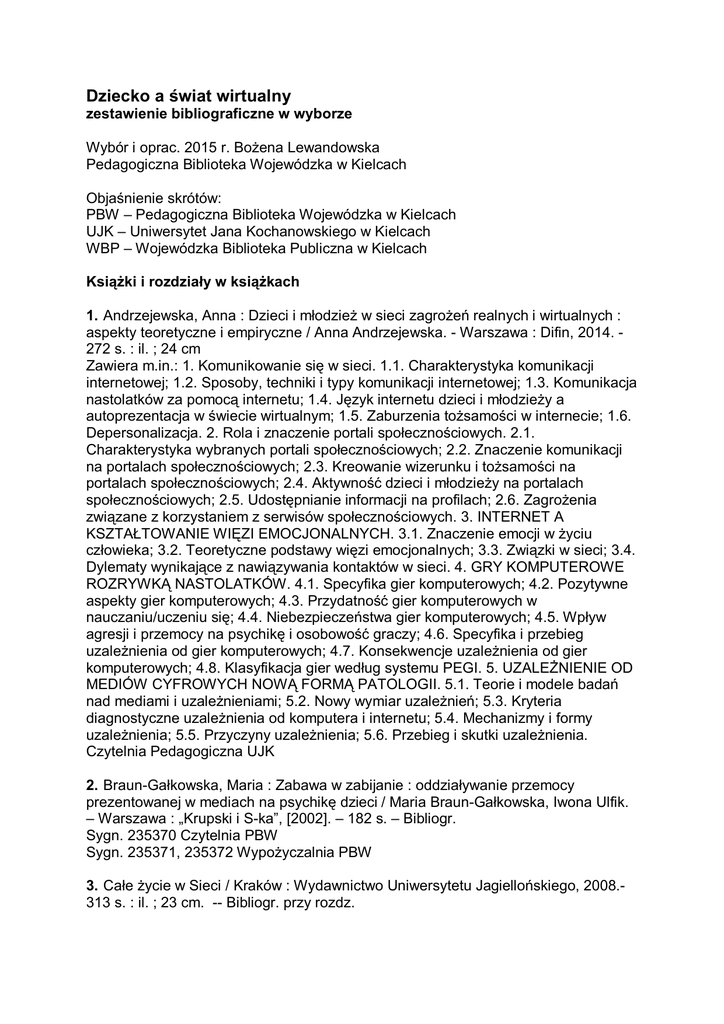 Dziecko a świat wirtualny zestawienie bibliograficzne w wyborze Wybór i oprac. 2015 r. Bożena Lewandowska Pedagogiczna Biblioteka Wojewódzka w Kielcach Objaśnienie skrótów: PBW – Pedagogiczna Biblioteka Wojewódzka w Kielcach UJK – Uniwersytet Jana Kochanowskiego w Kielcach WBP – Wojewódzka Biblioteka Publiczna w Kielcach Książki i rozdziały w książkach 1. Andrzejewska, Anna : Dzieci i młodzież w sieci zagrożeń realnych i wirtualnych : aspekty teoretyczne i empiryczne / Anna Andrzejewska. - Warszawa : Difin, 2014. 272 s. : il. ; 24 cm Zawiera m.in.: 1. Komunikowanie się w sieci. 1.1. Charakterystyka komunikacji internetowej; 1.2. Sposoby, techniki i typy komunikacji internetowej; 1.3. Komunikacja nastolatków za pomocą internetu; 1.4. Język internetu dzieci i młodzieży a autoprezentacja w świecie wirtualnym; 1.5. Zaburzenia tożsamości w internecie; 1.6. Depersonalizacja. 2. Rola i znaczenie portali społecznościowych. 2.1. Charakterystyka wybranych portali społecznościowych; 2.2. Znaczenie komunikacji na portalach społecznościowych; 2.3. Kreowanie wizerunku i tożsamości na portalach społecznościowych; 2.4. Aktywność dzieci i młodzieży na portalach społecznościowych; 2.5. Udostępnianie informacji na profilach; 2.6. Zagrożenia związane z korzystaniem z serwisów społecznościowych. 3. INTERNET A KSZTAŁTOWANIE WIĘZI EMOCJONALNYCH. 3.1. Znaczenie emocji w życiu człowieka; 3.2. Teoretyczne podstawy więzi emocjonalnych; 3.3. Związki w sieci; 3.4. Dylematy wynikające z nawiązywania kontaktów w sieci. 4. GRY KOMPUTEROWE ROZRYWKĄ NASTOLATKÓW. 4.1. Specyfika gier komputerowych; 4.2. Pozytywne aspekty gier komputerowych; 4.3. Przydatność gier komputerowych w nauczaniu/uczeniu się; 4.4. Niebezpieczeństwa gier komputerowych; 4.5. Wpływ agresji i przemocy na psychikę i osobowość graczy; 4.6. Specyfika i przebieg uzależnienia od gier komputerowych; 4.7. Konsekwencje uzależnienia od gier komputerowych; 4.8. Klasyfikacja gier według systemu PEGI. 5. UZALEŻNIENIE OD MEDIÓW CYFROWYCH NOWĄ FORMĄ PATOLOGII. 5.1. Teorie i modele badań nad mediami i uzależnieniami; 5.2. Nowy wymiar uzależnień; 5.3. Kryteria diagnostyczne uzależnienia od komputera i internetu; 5.4. Mechanizmy i formy uzależnienia; 5.5. Przyczyny uzależnienia; 5.6. Przebieg i skutki uzależnienia. Czytelnia Pedagogiczna UJK 2. Braun-Gałkowska, Maria : Zabawa w zabijanie : oddziaływanie przemocy prezentowanej w mediach na psychikę dzieci / Maria Braun-Gałkowska, Iwona Ulfik. – Warszawa : „Krupski i S-ka”, [2002]. – 182 s. – Bibliogr. Sygn. 235370 Czytelnia PBW Sygn. 235371, 235372 Wypożyczalnia PBW 3. Całe życie w Sieci / Kraków : Wydawnictwo Uniwersytetu Jagiellońskiego, 2008.313 s. : il. ; 23 cm. -- Bibliogr. przy rozdz. Zebrane w pracy artykuły (w większości oparte na badaniach własnych autorów) ilustrują rolę internetu w poszczególnych okresach życia ludzkiego, od dzieciństwa (Wiedza dziecka na temat komputera i internetu; Aktywność w internecie podejmowana przez dzieci w wieku przedszkolnym; Analiza stron internetowych dla najmłodszych z punktu widzenia ich rozwoju) poprzez młodość (Cyberedukacja seksualna i cyberseks młodzieży; Edukacja moralna w przestrzeni internetu; Rola internetu w podejmowaniu decyzji edukacyjno-zawodowych w ocenie maturzystów), dorosłość (Wirtualne wspólnoty kobiet na forach internetowych jako źródło wsparcia w przygotowaniu do macierzyństwa; Komunikacja polskich emigrantów z rodziną za pośrednictwem internetu; Wirtualny seks i zdrada w ocenie osób dorosłych) aż po starość (Internet z perspektywy rozwoju w wieku starczym; Ludzie starzy w świecie wirtualnym). WBP 4. Dzieci a mass media : materiały z ogólnopolskiego seminarium, Zielona Góra, 2223 października 1998 r. / [red. Jadwiga Chruścińska, Ewa Kubisz] ; Centrum Ustawicznego Kształcenia Bibliotekarzy. – Warszawa : Centrum Ustawicznego Kształcenia Bibliotekarzy, 1999. – 101s. Sygn. 235804 Czytelnia PBW 5. Dziecko i media elektroniczne : nowy wymiar dzieciństwa. T. 1, Telewizja i inne mass media w życiu dziecka – wyzwaniem dla edukacji medialnej / pod red. Jadwigi Izdebskiej i Tomasza Sosnowskiego. – Białystok : „Trans Humana”, 2005. – 346 s. Czytelnia Pedagogiczna UJK 6. Dziecko i media elektroniczne : nowy wymiar dzieciństwa. T. 2, Komputer i Internet w życiu dziecka i obraz jego dzieciństwa / pod red. Jadwigi Izdebskiej i Tomasza Sosnowskiego. – Białystok : „Trans Humana”, 2005. – 210, [1] s. Czytelnia Pedagogiczna UJK 7. Izdebska, Jadwiga : Multimedia zagrażające współczesnemu dziecku / Jadwiga Izdebska // W: Dziecko i media elektroniczne : nowy wymiar dzieciństwa. T. 2, Komputer i Internet w życiu dziecka i obraz jego dzieciństwa / pod red. Jadwigi Izdebskiej i Tomasza Sosnowskiego. - Białystok : „Trans Humana”, 2005. - S. 105113 Czytelnia Pedagogiczna UJK 8. Jędrzejko, Mariusz : Pułapki współczesności. Cyfrowi tubylcy : socjopedagogiczne aspekty nowych technologii cyfrowych. - Dąbrowa Górnicza : Wyższa Szkoła Biznesu ; Warszawa : Oficyna Wydawnicza Aspra-JR, 2013. - 319 s. : il. ;24 cm Spis treści: Wprowadzenie. Cz. I. Od Cro-Magnon do Facebooka. 1.1. Cybertechnologie w świecie wielkich zmian; 1.2. Fenomen przekazu informacyjnego; 1.3. Cyfrowe zmiany i dylematy; 1.4. Fenomen sieci i społeczeństwa informacyjnego. Cz. II. 21 faktów u progu XXI wieku. Cz. III. Człowiek i kultura wobec mediów cyfrowych. 3.1. Nowa kultur@ - konteksty i pułapki; 3.2. Wokół cyfrowych rewolucji szanse i dylematy; 3.3. Czy jest się czego bać? Cz. IV. Mózg (człowiek) a nowe technologie. 4.1. Kilka słów o mózgu; 4.2. Mózg i cybertechnologie; 4.3. Co mówią współczesne badania - obalamy mity. 100 za i 100 przeciw. Cz. V. W cyfrowej sieci. 5.1. Specyfika przekazu i treści w sieci; 5.2. Sieć jako część nowej epoki ekonomicznej; 5.3. Media cyfrowe jako źródło wzorów; 5.4