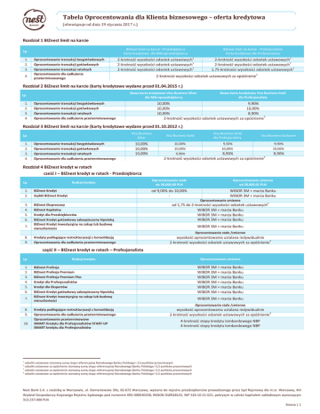 Tabela Oprocentowania dla Klienta biznesowego – oferta kredytowa (obowiązuje od dnia 19 stycznia 2017 r.) Rozdział 1 BIZnest limit na karcie Lp. 1. 2. 3. 4. Oprocentowanie transakcji bezgotówkowych Oprocentowanie transakcji gotówkowych Oprocentowanie transakcji ratalnych Oprocentowanie dla zadłużenia przeterminowanego BIZnest limit na karcie - Przedsiębiorca Karta kredytowa dla Mikroprzedsiębiorcy BIZnest limit na karcie - Profesjonalista Karta kredytowa dla Profesjonalisty 2-krotność wysokości odsetek ustawowych1 2-krotność wysokości odsetek ustawowych1 2-krotność wysokości odsetek ustawowych1 2-krotność wysokości odsetek ustawowych1 2-krotność wysokości odsetek ustawowych1 1,75-krotności wysokości odsetek ustawowych1 2-krotność wysokości odsetek ustawowych za opóźnienie2 Rozdział 2 BIZnest limit na karcie (karty kredytowe wydane przed 01.04.2015 r.) Nowa karta kredytowa Visa Business Silver dla Mikroprzedsiębiorcy Lp. 1. 2. 3. 4. Nowa karta kredytowa Visa Business Gold dla Profesjonalisty 10,00% 9,90% 10,00% 10,00% 10,00% 8,90% 2-krotność wysokości odsetek ustawowych za opóźnienie3 Oprocentowanie transakcji bezgotówkowych Oprocentowanie transakcji gotówkowych Oprocentowanie transakcji ratalnych Oprocentowanie dla zadłużenia przeterminowanego Rozdział 3 BIZnest limit na karcie (karty kredytowe wydane przed 01.10.2012 r.) Lp. 1. 2. 3. 4. Oprocentowanie transakcji bezgotówkowych Oprocentowanie transakcji gotówkowych Oprocentowanie transakcji ratalnych Oprocentowanie dla zadłużenia przeterminowanego Visa Business Silver Visa Business Gold 10,00% 10,00% 10,00% 10,00% 10,00% 9,90% Visa Business Gold dla Profesjonalisty Visa Business Exclusive 9,50% 10,00% 9,90% 10,00% 8,90% 2-krotność wysokości odsetek ustawowych za opóźnienie4 8,90% Rozdział 4 BIZnest kredyt w ratach cześć I – BIZnest kredyt w ratach - Przedsiębiorca Lp. Rodzaj kredytu Oprocentowanie stałe do 30.000,00 PLN Oprocentowanie zmienne od 30.000,01 PLN od 9,00% do 10,00% - WIBOR 3M + marża Banku WIBOR 3M + marża Banku 1. 2. BIZnest Kredyt Szybki BIZnest Kredyt 3. 4. 5. 6. BIZnest Ekspresowy BIZnest Kapitalny Kredyt dla Przedsiębiorców BIZnest Kredyt gotówkowy zabezpieczony hipoteką BIZnest Kredyt inwestycyjny na zakup lub budowę nieruchomości od 1,75 do 2-krotności wysokości odsetek ustawowych5 WIBOR 3M + marża Banku WIBOR 3M + marża Banku WIBOR 3M + marża Banku Kredyty podlegające restrukturyzacji z konsolidacją Oprocentowania dla zadłużenia przeterminowanego wysokość oprocentowania ustalana indywidualnie 2-krotność wysokości odsetek ustawowych za opóźnienie4 Oprocentowanie zmienne 7. WIBOR 3M + marża Banku Oprocentowanie stałe /zmienne 8. 9. część II – BIZnest kredyt w ratach – Profesjonalista Lp. 1. 2. 3. 4. 5. 6. 7. Rodzaj kredytu Oprocentowanie zmienne WIBOR 3M + marża Banku WIBOR 3M + marża Banku WIBOR 3M + marża Banku WIBOR 3M + marża Banku WIBOR 3M + marża Banku WIBOR 3M + marża Banku BIZnest Profesja BIZnest Profesja Premium BIZnest Profesja Premium Plus Kredyt dla Profesjonalistów Kredyt dla Ekspertów BIZnest Kredyt gotówkowy zabezpieczony hipoteką BIZnest Kredyt inwestycyjny na zakup lub budowę nieruchomości WIBOR 3M + marża Banku Oprocentowanie stałe /zmienne 8. 9. 10. Kredyty podlegające restrukturyzacji z konsolidacją Oprocentowania dla zadłużenia przeterminowanego Oprocentowanie przeterminowane SMART Kredytu dla Profesjonalistów START-UP SMART kredytu dla Profesjonalistów wysokość oprocentowania ustalana indywidualnie 2-krotność wysokości odsetek ustawowych za opóźnienie4 4-krotność stopy kredytu lombardowego NBP 4-krotność stopy kredytu lombardowego NBP 1 odsetki ustawowe stanowią sumę stopy referencyjnej Narodowego Banku Polskiego i 3,5 punktów procentowych odsetki ustawowe za opóźnienie stanowią sumę stopy referencyjnej Narodowego Banku Polskiego i 5,5 punktów procentowych odsetki ustawowe za opóźnienie stanowią sumę stopy referencyjnej Narodowego Banku Polskiego i 5,5 punktów procentowych 4 odsetki ustawowe za opóźnienie stanowią sumę stopy referencyjnej Narodowego Banku Polskiego i 5,5 punktów procentowych 2 3 Nest Bank S.A. z siedzibą w Warszawie, ul. Domaniewska 39a, 02-672 Warszawa, wpisana do rejestru przedsiębiorców prowadzonego przez Sąd Rejonowy dla m.st. Warszawy, XIII Wydział Gospodarczy Krajowego Rejestru Sądowego pod numerem KRS 000030330, REGON 010928125, NIP 526-10-21-021, pokrytym w całości kapitałem zakładowym wynoszącym 313.237.000 PLN Strona | 1 Rozdział 4 BIZnest limit w koncie część I – BIZnest limit w koncie – Przedsiębiorca Lp. Rodzaj kredytu 1. 2. 3. BIZnest Limit na Dobry Początek Współpracy BIZnest Limit dla Firm ze stażem BIZnest Limit w koncie dla Przedsiębiorców 4. Kredyty podlegające restrukturyzacji z konsolidacją Oprocentowania dla zadłużenia przeterminowanego 5. Oprocentowanie zmienne od 1,88 do 2-krotności wysokości odsetek ustawowych5 od 1,88 do 2-krotności wysokości odsetek ustawowych5 WIBOR 1M + marża Banku Oprocentowanie stałe /zmienne wysokość oprocentowania ustalana indywidualnie 2-krotność wysokości odsetek ustawowych za opóźnienie4 część II – BIZnest limit w koncie – Profesjonalista Lp. 1. BIZnest Limit dla Profesjonalistów 2. Kredyty podlegające restrukturyzacji z konsolidacją Oprocentowania dla zadłużenia przeterminowanego 3. 5 Rodzaj kredytu Oprocentowanie zmienne WIBOR 1M + marża Banku Oprocentowanie stałe /zmienne wysokość oprocentowania ustalana indywidualnie 2-krotność wysokości odsetek ustawowych za opóźnienie4 odsetki ustawowe stanowią sumę stopy referencyjnej Narodowego Banku Polskiego i 3,5 punktów procentowych Nest Bank S.A. z siedzibą w Warszawie, ul. Domaniewska 39a, 02-672 Warszawa, wpisana do rejestru przedsiębiorców prowadzonego przez Sąd Rejonowy dla m.st. Warszawy, XIII Wydział Gospodarczy Krajowego Rejestru Sądowego pod numerem KRS 000030330