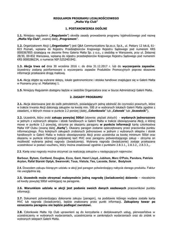 REGULAMIN PROGRAMU LOJALNOŚCIOWEGO „Malta Vip Club” 1. POSTANOWIENIA OGÓLNE 1.1. Niniejszy regulamin („Regulamin”) określa zasady prowadzenia programu lojalnościowego pod nazwą „Malta Vip Club”, zwanej dalej „Programem”. 1.2. Organizatorem Akcji („Organizator”) jest Q&A Communications Sp.zo.o. Sp.k., ul. Piekary 12 lok.6, 61823 Poznań, wpisana do Rejestru Przedsiębiorców Krajowego Rejestru Sądowego pod numerem KRS 0000367855 działającą na zlecenie firmy Galeria Malta Sp. z o.o., z siedzibą w Warszawie, przy ul. Żelaznej 28/30, 00-832 Warszawa, wpisaną do rejestru przedsiębiorców Krajowego Rejestru Sądowego pod numerem KRS 0000286234, o numerze NIP:5252401942. 1.3. Akcja trwa od dnia 30 września 2016 r. do dnia 31.12.2017 r. lub do wyczerpania zapasów. Uczestnicy zostaną poinformowani o wyczerpaniu zapasów Produktów Promocyjnych poprzez stosowne informacje przekazane drogą mailową. 1.4. Akcją objęte są wybrane sklepy, lokale gastronomiczne i stoiska handlowe znajdujące się w Galerii Malta w Poznaniu przy ul. Maltańskiej 1. 1.5. Niniejszy Regulamin dostępny będzie w siedzibie Organizatora oraz w biurze Administracji Galerii Malta. 2. ZASADY PROGRAMU 2.1. Akcja skierowana jest do osób pełnoletnich, posiadających pełną zdolność do czynności prawnych, które w trakcie trwania Akcji dokonają zakupów na kwotę min. 500 zł w wybranych lokalach Galerii Malta zgodnie z zasadami, o których mowa w punkcie 2.2 poniżej (dalej „Członkowie” lub „Członek” lub „Uczestnik”). 2.2. Uczestnik, który zrobi zakupy powyżej 500zł (słownie: pięćset złotych) - wydanych jednorazowo w jednym z wybranych sklepów i stoisk handlowych w Galerii Malta w trakcie obowiązywania Akcji, o której mowa w punkcie 1.3 powyżej, otrzyma po okazaniu paragonu w punkcie informacji kartę członkostwa Malta VIP Clubu (zwaną dalej „Kartą”). Okazany paragon zostanie opieczętowany przez pracownika punktu informacyjnego. Przy kolejnych zakupach zrobionych jednorazowo w jednym z wybranych sklepów i stoisk handlowych w Galerii Malta w trakcie obowiązywania Akcji przez uczestnika za kwotę minimum 500zł oraz okazaniu w punkcie informacji podpisanej kart MVC oraz paragonu potwierdzającego zakup – otrzyma on możliwość wybrania jednej nagrody (świadczenia). Wybrana nagroda (świadczenie) zostaje przekazana uczestnikowi w postaci voucheru, który można zrealizować zgodnie z punktami 2.8.3.1., 2.8.3.2., 2.8.3.3.,. 2.3. Kartę oraz nagrody można otrzymać za realizację zakupów u następujących najemców: Barbour, Bytom, Cortland, Douglas, Ecco, Gant, Henri Lloyd, Jubitom, Marc O'Polo, Pandora, Patrizia Aryton, Rafał Starski Optyk, Swarovski, Tous, Vistula, Yes, Lacoste, Solar, Bodylook 2.4. Dowodem zakupu biorącym udziału w akcji jest paragon potwierdzający nabycie danego produktu. Faktur nie uwzględnia się. 2.5. Uczestnik może otrzymać maksymalnie jedną nagrodę (świadczenie) dziennie – niezależnie od kwoty powyżej 500zł widniejącej na paragonie. 2.6. Warunkiem udziału w akcji jest podanie swoich danych osobowych pracownikowi punktu informacji. 2.7. Dokument potwierdzający dokonanie zakupu (paragon), na podstawie którego wydana została karta MVC lub nagroda (świadczenie), będzie znakowany przez punkt informacji. Zakupiony towar po oznaczeniu paragonu nie będzie podlegać zwrotowi. 2.8. Członkowie Malta Vip Club uprawnieni są do korzystania z dedykowanych usług, pierwszeństwa w uczestniczeniu w wybranych wydarzeniach, uczestniczenia w zamkniętych wydarzeniach oraz do zniżek w wybranych sklepach Galerii Malta. 2.8.1. Informacje oraz zaproszenia o zamkniętych wydarzeniach oraz wydarzeniach z pierwszeństwem udziału będą udostępniane Członkom Malta Vip Club drogą mailową, będą także dostępne na stronie galeriamalta.pl. 2.8.2. Zaproszenia na wydarzenia z pierwszeństwem udziału oraz wydarzenia zamknięte nie mogą być udostępniane osobom trzecim ani wymieniane na ekwiwalent pieniężny. 2.8.3. Członek Malta Vip Club (posiadający kartę), który dokona zakupów w lokalach należących do Programu określonych w punkcie 2.3. na określoną w punktach 2.8.3.1., 2.8.3.2., 2.8.3.3.,. kwotę, otrzyma możliwość wyboru Świadczenia („Świadczenie”) z Menu Premium (zwanych dalej „Menu”). 2.8.3.1. Za udokumentowane paragonem zakupy na kwotę min. 500 zł w wybranych lokalach należących do Programu, Członek Programu otrzymuje możliwość skorzystania z dwuosobowego biletu do Multikina znajdującego się w Galerii Malta. Bilety dotyczą wyłącznie seansów 2D. 2.8.3.2. Za udokumentowane paragonem zakupy na kwotę min. 500 zł w wybranych lokalach należących do Programu, Członek Programu otrzymuje możliwość skorzystania z usługi Mycia zewnętrznego samochodu z woskowaniem (mycie ręczne) w myjni Auto Aqua Park w Galerii Malta. Istnieje możliwość dopłaty uczestnika do usługi, aby skorzystać z innych usług najemcy. 2.8.3.3. Za udokumentowane paragonem zakupy na kwotę min. 500 zł w wybranych sklepach należących do Programu, Członek Programu otrzymuje możliwość skorzystania z podstawowego pakietu usług w Jean Louis David w Galerii Malta: mycie + strzyżenie. Istnieje możliwość dopłaty uczestnika do usługi, aby skorzystać z innych usług najemcy. 2.9. Warunkiem skorzystania z możliwości Menu jest okazanie w punkcie usługodawcy (wspomnianych w pkt. 2.8.3.1., 2.8.3.2., 2.8.3.3.,) karty członkostwa Malta Vip Club oraz oddanie usługodawcy voucheru (nagrody) wydanego przez punkt informacji. 2.10. Świadczenia będą wydawane Członkom w miejscach realizujących Świadczenia z Menu. Jeden Uczestnik może wykorzystać maksymalnie jedno Świadczenie jednego dnia czasu trwania Programu. 2.11. Karta ani Świadczenia nie podlegają wymianie na inny ekwiwalent pieniężny lub rzeczowy. 2.12. Z udziału w Programie są wykluczone osoby zatrudnione przez Organizatora, w tym prac