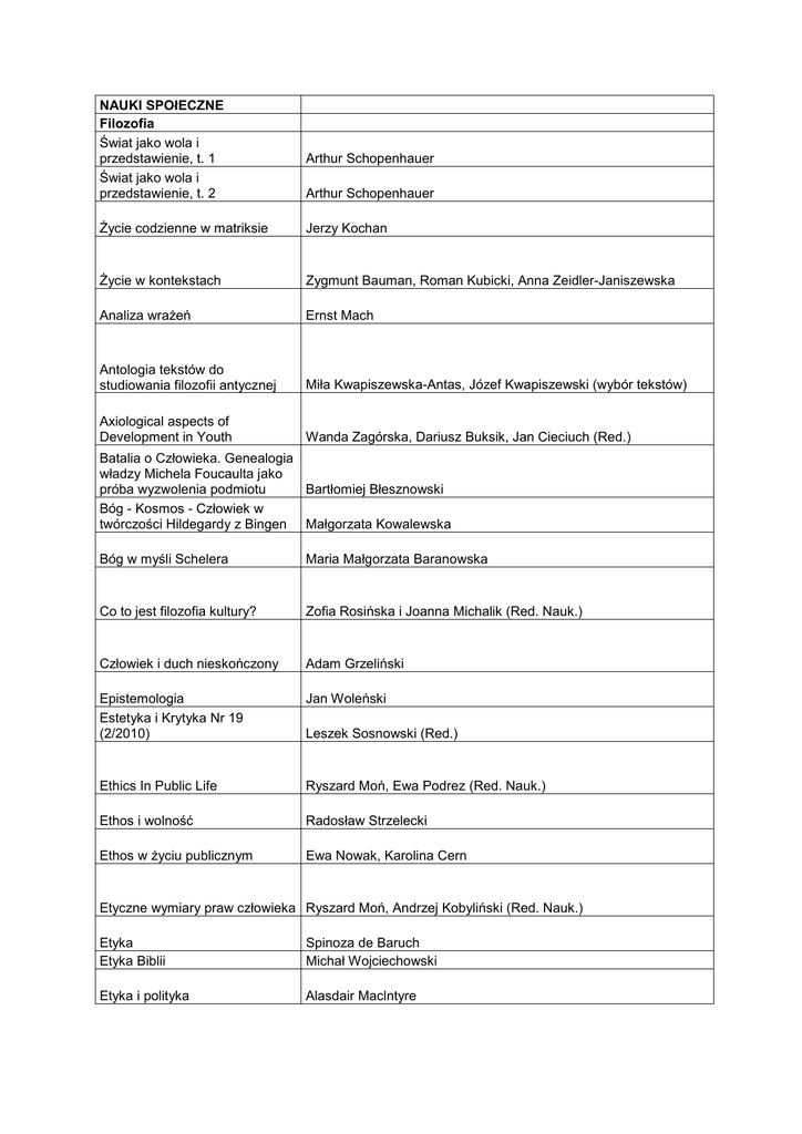 NAUKI SPOłECZNE Filozofia Świat jako wola i przedstawienie, t. 1 Świat jako wola i przedstawienie, t. 2 Arthur Schopenhauer Arthur Schopenhauer śycie codzienne w matriksie Jerzy Kochan śycie w kontekstach Zygmunt Bauman, Roman Kubicki, Anna Zeidler-Janiszewska Analiza wraŜeń Ernst Mach Antologia tekstów do studiowania filozofii antycznej Miła Kwapiszewska-Antas, Józef Kwapiszewski (wybór tekstów) Axiological aspects of Development in Youth Wanda Zagórska, Dariusz Buksik, Jan Cieciuch (Red.) Batalia o Człowieka. Genealogia władzy Michela Foucaulta jako próba wyzwolenia podmiotu Bartłomiej Błesznowski Bóg - Kosmos - Człowiek w twórczości Hildegardy z Bingen Małgorzata Kowalewska Bóg w myśli Schelera Maria Małgorzata Baranowska Co to jest filozofia kultury? Zofia Rosińska i Joanna Michalik (Red. Nauk.) Człowiek i duch nieskończony Adam Grzeliński Epistemologia Estetyka i Krytyka Nr 19 (2/2010) Jan Woleński Leszek Sosnowski (Red.) Ethics In Public Life Ryszard Moń, Ewa Podrez (Red. Nauk.) Ethos i wolność Radosław Strzelecki Ethos w Ŝyciu publicznym Ewa Nowak, Karolina Cern Etyczne wymiary praw człowieka Ryszard Moń, Andrzej Kobyliński (Red. Nauk.) Etyka Etyka Biblii Spinoza de Baruch Michał Wojciechowski Etyka i polityka Alasdair Maclntyre Etyka środowiskowa wobec biotechnologii Stefan Konstańczak Filozofia (w) fizyce Jarosław Kukowski Filozofia analityczna Filozofia Boga w XX wieku Adam Nowaczyk Tadeusz Gadacz Filozofia głupoty Jacek Dobrowolski Filozofia Oświecenia Zbigniew Drozdowicz Filozofia polityki Andrzej Szahaj, Marek N. Jakubowski Filozofia przedplatońska Janina Gajda-Krynicka Filozofia zen Agnieszka Kozyra Filozoficzne i naukowoprzyrodnicze elementy obrazu świata, t.8 Główne kontrowersje estetyki współczesnej Anna Lemańska (Red.) Bohdan Dziemidok Główne nurty marksizmu, t. 1 Leszek Kołakowski Główne nurty marksizmu, t. 2 Leszek Kołakowski Główne nurty marksizmu, t.3 Hegla teoria nowoczesnego państwa Leszek Kołakowski Shlomo Avineri Hermeneutyczny kontekst "wiedzy źródłowej". Studium wczesnej filozofii Heideggera (1916 1929) Norbert Leśniewski Historia estetyki, t.1 Władysław Tatarkiewicz Historia estetyki, t.2 Władysław Tatarkiewicz Historia estetyki, t.3 Władysław Tatarkiewicz Historia filozofii polskiej Jan Skoczyński, Jan Woleński Historia filozofii, t. 1-3 Władysław Tatarkiewicz Idea fenomenologii Edmund Husserl Ija Lazari-Pawłowska jako metaetyk i moralista Małgorzata Olech Intencjonalność i znaczenie językowe Marek Maciejczak Jednostka, państwo i prawo w filozofii Fryderyka Nietzschego. Mała vs wielka polityka Marta Baranowska Kant wobec problemów współczesnego świata Komentarz do "Księgi o przyczynach" Justyna Miklaszewska, Przemysław Spryszak (Red.) Tomasz z Akwinu Konstytucja wolności Księga o podróŜy nocnej do najbardziej szlachetnego miejsca Metafizyczne zasady wszechświata Friedrich August von Hayek Ibn Arabi Metafizyka Arystoteles Metafizyka i teologia Robert J. Woźniak (Red.) Metafizyka moralności Metafizyka śmierci Immanuel Kant Ireneusz Ziemiński Janusz Sytnik-Czetwertyński Męstwo jako sposób spełniania się osoby Moralność i religia. Poglądy filozoficzne Josepha Butlera Ireneusz Ziemiński Natura i struktura wszechświata w kosmologii św. Tomasza z Akwinu Marcin Karas Ryszard Kozłowski Niedokończona dyskusja Nowoczesność a polityka w ujęciu Ágnes Heller Leszek Augustyn, Marta Kwaśnicka (Red.) Waldemar Bulira O postępowaniu człowieka Michael Oakeshott O prawach człowieka nieco inaczej Ryszard Moń, Andrzej Kobyliński (Red. Nauk.) O religii Oblicza patriotyzmu Ocalenie od zła w filozofii Platona Benjamin Constant Praca zbiorowa Jadwiga Skrzypek-Faluszczak Oczyszczenie przez burzę Michał Bohun Philosophy of Nature Today Adam ŚwieŜyński (Red.) Podręcznik retoryki homiletycznej PodróŜ w świat etyki PodróŜ w świat filozofii Mirosław Korolko Jerzy Pilikowski Jerzy Pilikowski Pokochać mądrość Bała Maciej, Jeziorska Janina, Zalewska Sabina Polityczna władza sądzenia Jakub Szczepański Polityka Arystoteles Powinność w świecie cyfrowym Wojciech Jerzy Bober Poznając siebie, czyli konceptualne podstawy samowiedzy Anita Pacholik-śuromska Praktyka polityczna. Od "Państwa" do "Praw" Platona Dorota Zygmuntowicz PRINCIPIA. Zrozumieć Hegla Problem egoizmu w etyce Arystotelesa Olga Dryla Przewodnik po metafizyce Redakcja Sebastian Tomasz Kołodziejczyk PrzezwycięŜając dualizm. Zaślubiny myślenia i postrzeŜeń Pytania współczesnej filozofii polityki Retoryka. Retoryka dla Aleksandra. Poetyka Katarzyna Guczalska (Red.) Stephen Edelglass, Georg Maier, Hans Gebert, John Davy Dorota Pietrzyk-Reeves (Red.) Arystoteles Rozum w świecie praktyki. Poglądy filozoficzne Marthy C. Nussbaum Anna Głąb Ruch, przestrzeń, czas. Protofizyczne i metafizyczne aspekty podstaw fizyki relatywistycznej Jan Czerniawski Salwian z Marsylii - dzieła wszystkie Tadeusz Kołosowski (Red.) Sofiści i polityka Cyprian Mielczarski Spinoza i polityka Étienne Balibar Spinozjańska teoria afektów Spór o demokratyczne państwo prawa Jolanta śelazna Struktura zjawiska Nelson Goodman Rafał Wonicki Strukturalne przeobraŜenia sfery publicznej Jürgen Habermas Swoistość człowieka? Rozumność Sztuka jako wartość wobec kryzysu kultury europejskiej Teologia polityczna Świętego Pawła Teoria krytyczna szkoły frankfurckiej Grzegorz Bugajak, Jacek Tomczyk (Red. Nauk.) Bogna Choińska Jacob Taubes Andrzej Szahaj Teoria sprawiedliwości John Rawls The Need for Practicing for Classical Metaphysics Paweł Mazanka (Red. Nauk.) The philosophy of human death Adam ŚwieŜyński Tomasz z Akwinu - Opuscula tom 9, fasc. 1 Michał Zembrzuski, Artur Andrzejuk (Red.) Tomasz z Akwinu - Opuscula tom 9, fasc. 2 red. Michał Zembrzuski, Artur Andzrejuk Traktat o miłości Ibn Arabi Warto czy naleŜy? Ryszard Moń Wpływ francuskich estetyków naturalistycznych XVIII wieku na klas