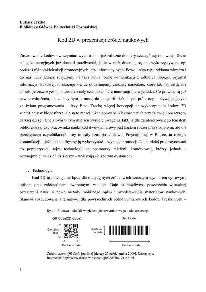 Łukasz Jeszke Biblioteka Główna Politechniki Poznańskiej Kod 2D w prezentacji źródeł naukowych Zastosowanie kodów dwuwymiarowych trudno już zaliczać do sfery szczególnej innowacji. Świat usług komercyjnych już docenił możliwości, jakie w nich drzemią, są one wykorzystywane np. podczas różnorakich akcji promocyjnych, czy informacyjnych. Powoli tego typu reklama wkracza i do nas. Gdy jednak spojrzymy na taką nową formę komunikacji z odbiorcą poprzez pryzmat informacji naukowej, to okazuje się, że otrzymujemy ciekawe narzędzie, które tak naprawdę nie zostało jeszcze wyeksploatowane i cały czas poza sferę innowacji nie wychodzi. Co prawda, są już pewne wdrożenia, ale zaliczyłbym je raczej do kategorii nieśmiałych prób, czy – używając języka ze świata programowania – fazy Beta. Trochę więcej koncepcji na wykorzystanie kodów 2D znajdziemy w blogosferze, ale są to raczej luźne pomysły. Niektóre z nich przedstawię i poszerzę w dalszej części. Chciałbym w tym miejscu zwrócić uwagę na fakt, iż dla zainteresowanego tematem bibliotekarza, czy pracownika nauki kod dwuwymiarowy jest hasłem raczej przyswojonym, ale dla przeciętnego czytelnika/odbiorcy to cały czas puste słowo. Przynajmniej w Polsce, ta metoda komunikacji – jeżeli chcielibyśmy ją wykorzystać – wymaga promocji. Najbardziej predestynowani do popularyzacji tejże technologii są operatorzy telefonii komórkowej, którzy jednak – przynajmniej na dzień dzisiejszy – wykazują się sporym dystansem. 1. Technologia Kod 2D to potencjalne łącze dla tradycyjnych źródeł z ich szerszym wymiarem cyfrowym, opisem oraz zależnościami tworzonymi w sieci. Daje to możliwość poszerzenia wirtualnej przestrzeni nauki o nowe metody mobilnego opisu i przedstawienia materiałów naukowych. Stanowi rozbudowaną alternatywę dla powszechnych jednowymiarowych kodów kreskowych – Rys. 1. Budowa kodu QR względem jednowymiarowego kodu kresowego. Źródło: About QR Code [on-line] [dostęp 27 października 2009]. Dostępny w Internecie: http://www.denso-wave.com/qrcode/aboutqr-e.html. 1 stosowanych szeroko np. w bibliotekach. Zasadniczą wartością kodów dwuwymiarowych jest zawartość informacji, znacznie większa niż w przypadku używania kodów kreskowych, a umieszczona na porównywalnej przestrzeni graficznej. Zysk informacyjny wynika z założeń nowych kodów – informacje umieszczane są zarówno poziomo, jak i pionowo (Rys. 1). Do tego możliwość zakodowania hiperłączy do informacji zawartych w sieci, wiadomości SMS, wizytówek kontaktowych – naturalnie oprócz zwykłego tekstu – rysuje możliwości zastosowania i ich potencjał semantyczny. Potencjał tym większy, że w ten sposób można połączyć obiekty materialne z ich wymiarem sieciowym. Technologia kodów 2D nie jest co prawda jednolita, ale wspomniane cechy są uniwersalne. Jeżeli do tego dodamy krótki czas odczytu, czy dobrą korekcję błędów1, to otrzymamy produkt naprawdę warty uwagi. Aktualnie rozważania dotyczące wprowadzania do obrotu naukowego kodów 2D obejmują właśnie kod otwartego standardu QR (ang. Quick-Response). Mobilność i uniwersalność to wielka zaleta kodów tego rodzaju, gdyż są interpretowane nawet przez oprogramowanie zainstalowane w telefonach komórkowych. Należy więc w tym miejscu wziąć pod uwagę zależność planowanej grupy odbiorców od posiadania telefonów komórkowych i to nieco nowszej generacji, gdyż kody te są odczytywane optycznie. Matryca 2 megapiksele stanowi tu rozsądne minimum, choć możliwość odczytu tak naprawdę zależy od gęstości (zawartości informacyjnej) kodu. Można przyjąć, że – biorąc pod uwagę ograniczenia telefonów i rozsądną wielkość kodu zarazem – umieszczamy ok. 40-80 znaków alfanumerycznych, choć teoretycznie może ich być nawet 42962. Generalnie kreacja kodów QR z pewnością powinna być przemyślana od strony technicznej – głównie pod względem optymalnego sposobu prezentacji3. Oprócz kosztów związanych z ewentualnym połączeniem internetowym – niewielkich w przypadku pobierania stron projektowanych dla urządzeń mobilnych, użytkownik końcowy nie powinien być narażony na inne opłaty, gdyż oprogramowanie jest dostarczane za darmo przez coraz liczniejszych deweloperów (m.in. Kaywa Reader, i-Nigma, Nokia Mobile, Upcode, Quickmark, iCandy, BeeTagg, ZXing), którzy równie często oferują darmowe generatory samych kodów QR4. Należy zaznaczyć, że sama technologia i standard kodu QR jest wolna od ograniczeń licencyjnych. Otwartość kodu, dostępność generatorów, niewielka powierzchnia kodu – to wszystko umożliwia ich szerokie prezentowanie zarówno w sieci, jak i w postaci wydruków, czy to na książkach, materiałach prezentacyjnych, czy w jakiejkolwiek innej przestrzeni. Niestety ilość modeli telefonów, czy dostępnych programów do odczytu kodu, wymaga pewnych kompromisów i testów przed wdrożeniem tego typu rozwiązania – również pod kątem nośnika, który mamy zamiar wykorzystać i planowanego sposobu prezentacji5. Stąd konieczne jest równoległe zaangażowanie użytkownika w przygotowanie telefonu, a przede wszystkim wyposażenia wybranej grupy 2 docelowej w samą świadomość istnienia takiej formy komunikacji. Będzie to poważny problem dla instytucji naukowych, które z natury rzeczy nie posiadają większych środków na takie „marketingowe” cele. 2. Istniejące wdrożenia Istniejące wdrożenia obejmują głównie katalogi komputerowe bibliotek, ze szczególnym uwzględnieniem powiązania kodu QR i sygnatury miejsca. Drugim popularnym – ale też dość oczywistym – łączem jest rekord katalogu bibliotecznego, zapisany w formacie kodu dwuwymiarowego. W związku tym, że technologia kodów QR przybyła z Japonii, wiele tamtejszych bibliotek wzbogaciło swoje katalogi komputerowe o to rozwiązanie. Oprócz bibliotek, także inne instytuc