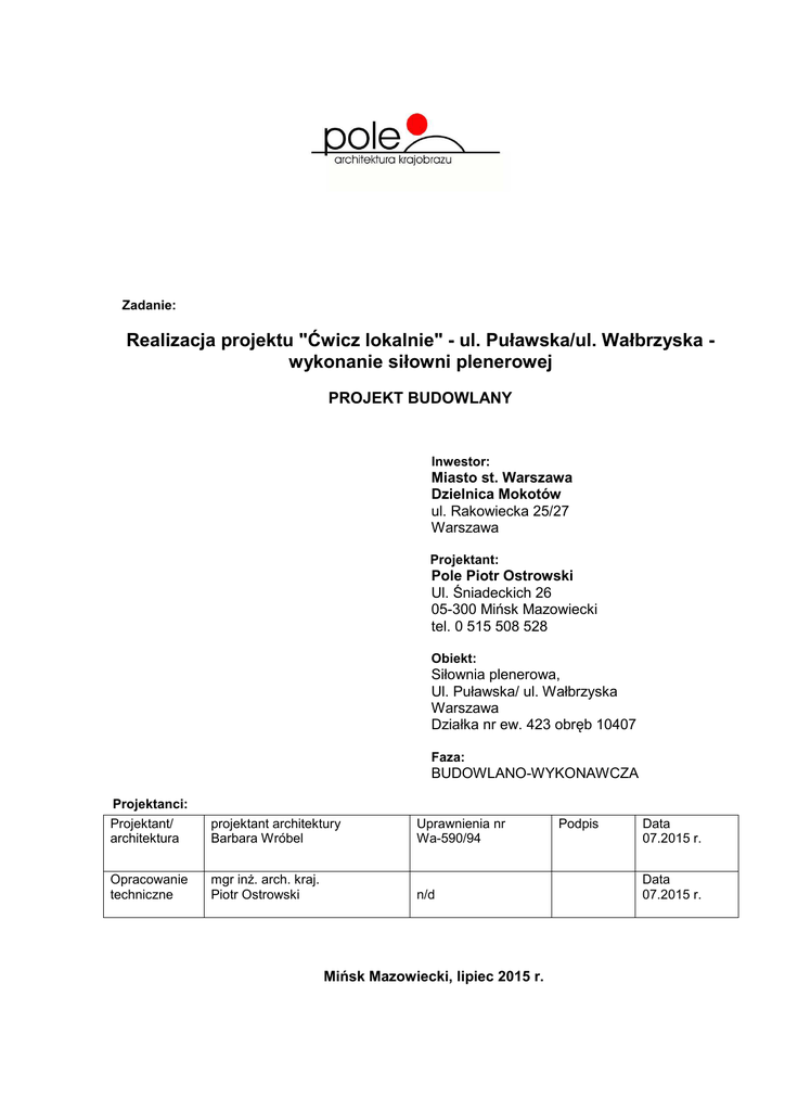 Zadanie: Realizacja projektu "Ćwicz lokalnie" - ul. Puławska/ul. Wałbrzyska wykonanie siłowni plenerowej PROJEKT BUDOWLANY Inwestor: Miasto st. Warszawa Dzielnica Mokotów ul. Rakowiecka 25/27 Warszawa Projektant: Pole Piotr Ostrowski Ul. Śniadeckich 26 05-300 Mińsk Mazowiecki tel. 0 515 508 528 Obiekt: Siłownia plenerowa, Ul. Puławska/ ul. Wałbrzyska Warszawa Działka nr ew. 423 obręb 10407 Faza: BUDOWLANO-WYKONAWCZA Projektanci: Projektant/ architektura projektant architektury Barbara Wróbel Uprawnienia nr Wa-590/94 Opracowanie techniczne mgr inż. arch. kraj. Piotr Ostrowski n/d Mińsk Mazowiecki, lipiec 2015 r. Podpis Data 07.2015 r. Data 07.2015 r. Realizacja projektu "Ćwicz lokalnie" - ul. Puławska/ul. Wałbrzyska - wykonanie siłowni plenerowej SPIS TREŚCI A. ZAŁĄCZNIKI • Oświadczenie projektanta o wykonaniu projektu zgodnie z obowiązującymi przepisami oraz zasadami wiedzy technicznej; • Uprawnienia projektantów i przynależność do izb; • Informacja BIOZ. B. OPIS TECHNICZNY DO PROJEKTU ZAGOSPODAROWANIA TERENU 1. DANE OGÓLNE................................................................................................................ 1.1. Przedmiot i zakres inwestycji..................................................................................... 1.2. Adres inwestycji - lokalizacja..................................................................................... 1.3. Podstawa opracowania............................................................................................. 2. ISTNIEJĄCY STAN ZAGOSPODAROWANIA TERENU Z OPISEM PROJEKTOWANYCH ZMIAN.......................................................................................... 2.1. Istniejący stan zagospodarowania terenu................................................................. 2.2. Rozbiórki i adaptacje................................................................................................. 2.3. Istniejąca rzeźba terenu i zakres projektowanych zmian.......................................... 2.4. Istniejące nawierzchnie utwardzone i zakres projektowanych zmian....................... 2.5. Istniejąca szata roślinna i zakres projektowanych zmian.......................................... 2.6. Istniejąca mała architektura i zakres projektowanych zmian..................................... 2.7. Istniejące budynki i zakres projektowanych zmian.................................................... 2.8. Istniejące ogrodzenia i zakres projektowanych zmian............................................... 2.9. Istniejące uzbrojenie terenu........................................................................................ 3. OPIS PROJEKTOWANEGO ZAGOSPODAROWANIA TERENU................................. 3.1. Elementy malej architektury - urządzenia siłowni i urządzenie gimnastyczne........... 3.2. Elementy małej architektury - regulamin siłowni......................................................... 3.3. Renowacja trawnika.................................................................................................... 4. OCHRONA KONSERWATORSKA.................................................................................... 5 WPŁYW EKSPLOATACJI GÓRNICZEJ............................................................................. 6. WPŁYW NA ŚRODOWISKO ORAZ HIGIENĘ I ZDROWIE.............................................. 7. WARUNKI OCHRONY PRZECIWPOŻAROWEJ.............................................................. 8. WYMAGANIA BHP DOTYCZĄCE URZĄDZEŃ................................................................ 9. UWAGI ............................................................................................................................... C. RYSUNKI Rys. 1. PLAN SYTUACYJNY Rys. 2. ROZMIESZCZENIE URZĄDZEŃ Rys. 3. FUNDAMENTOWANIE URZĄDZENIA 1:500 1:100 1:20 A. ZAŁĄCZNIKI INFORMACJA DOTYCZĄCA BEZPIECZEŃSTWA I OCHRONY ZDROWIA NA BUDOWIE INWESTYCJI "REALIZACJA PROJEKTU "ĆWICZ LOKALNIE" - UL. PUŁAWSKA/ UL. WAŁBRZYSKA - WYKONANIE SIŁOWNI PLENEROWEJ" DZIAŁKI NR EW. 423 OBRĘB 10407 Sporządziła: Projektant architektury Barbara Wróbel Nr upr. Wa-590/94 Warszawa, lipiec 2015 r. 1. DANE OGÓLNE 1.1. Przedmiot, adres i zakres inwestycji Przedmiotem inwestycji jest realizacja projektu "Ćwicz lokalnie" - ul. Puławska/ul. Wałbrzyska - wykonanie siłowni plenerowej. Teren opracowania znajduje się w Warszawie przy ulicach Puławskiej i Wałbrzyskiej i obejmuje działkę ew. nr 423, obręb 10407. Opracowanie obejmuje projekt w zakresie wykonania: • Montażu elementów malej architektury, • Prac porządkowych, • Renowacji trawnika. Charakter ww. prac stwarza ryzyko powstania zagrożenia dla bezpieczeństwa i zdrowia pracowników budowy. Zgodnie z Rozp. Ministra Infrastruktury z dnia 23 czerwca 2003r. (Dz.U. nr 120) dla ww. przedsięwzięcia konieczne jest opracowanie planu bezpieczeństwa i ochrony zdrowia. Opracowanie powyższego, zgodnie z art. 21a Ustawy Prawo Budowlane, znajduje się w kompetencjach i jest obowiązkiem kierownika budowy. Plan BIOZ powinien być opracowany przed rozpoczęciem budowy, z uwzględnieniem specyfiki obiektów i warunków prowadzenia robót budowlanych. 1.2. Inwestor Miasto st. Warszawa Dzielnica Mokotów ul. Rakowiecka 25/27 Warszawa 1.3. Projektant POLE Piotr Ostrowski ul. Śniadeckich 26 05-300 Mińsk Mazowiecki 2. ZAKRES ROBÓT DLA CAŁEGO ZAMIERZENIA I KOLEJNOŚĆ ICH WYKONANIA Podczas realizacji inwestycji wykonywane będą następujące prace, w proponowanej poniżej kolejności: • Przygotowanie terenu pod budowę, w tym ogrodzenie terenu i przygotowanie pod pracę ciężkiego sprzętu, wykonanie punktu poboru wody i przyłącza energetycznego dla potrzeb budowy, wyznaczenie miejsc składowania materiałów; • Montaż elementów małej architektury (wykopy, fundamentowanie, mocowanie urządzeń i obiektów w fundamentach). • Uprzątnięcie terenu; • Renowacja trawnika. Projektowany zakres pra