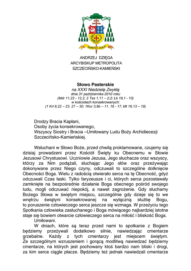 ANDRZEJ DZIĘGA ARCYBISKUP METROPOLITA SZCZECIŃSKO-KAMIEŃSKI Słowo Pasterskie na XXXI Niedzielę Zwykłą dnia 31 października 2010 roku (Mdr 11,22 - 12,2; 2 Tes 1,11 – 2,2; Łk 19,1 - 10) w kościołach konsekrowanych: (1 Krl 8,22 – 23. 27 – 30; 1Kor 3,9b – 11. 16 - 17; Mt 16,13 – 19) Drodzy Bracia Kapłani, Osoby życia konsekrowanego, Wszyscy Siostry i Bracia –Umiłowany Ludu Boży Archidiecezji Szczecińsko-Kamieńskiej. Wsłuchani w Słowo Boże, przed chwilą proklamowane, czujemy się dzisiaj prowadzeni przez Kościół Święty ku Obecnemu w Słowie Jezusowi Chrystusowi. Uczniowie Jezusa, Jego słuchacze oraz wszyscy, którzy za Nim podążali, słuchając Jego słów oraz przeżywając dokonywane przez Niego czyny, odczuwali to szczególne dotknięcie Obecności Boga. Wielu z radością otwierało serca na tę Obecność, gdyż odczuwali Czas łaski. Tylko faryzeusze i ci, których serca pozostawały zamknięte na bezpośrednie działanie Boga obecnego pośród swojego ludu, mogli odczuwać niepokój, a nawet zagrożenie. Gdy słuchamy Bożego Słowa w świętym miejscu, szczególnie gdy dzieje się to we wnętrzu świątyni konsekrowanej na wyłączną służbę Bogu, to poruszenie człowieczego serca jeszcze się wzmaga. W przeżyciu tego Spotkania człowieka zasłuchanego i Boga mówiącego najbardziej istotne staje się bowiem otwarcie człowieczego serca na miłość i bliskość Boga. Umiłowani. W dniach, które są teraz przed nami to spotkanie z Bogiem będziemy przeżywali dodatkowo silnie, nawiedzając cmentarze grzebalne. Każdy z tych cmentarzy jest miejscem świętym. Ze szczególnym wzruszeniem i gorącą modlitwą nawiedzać będziemy cmentarze, na których jest pochowany ktoś bardzo nam bliski i drogi, za kim serce ciągle płacze. Będziemy też jednak nawiedzali cmentarze 2 inne, może nawet mało nam znane, albo prawie zapomniane, na które wchodzimy na chwilę modlitwy za zmarłych dawno tam pochowanych lub dla symbolicznego uczczenia kogoś, kto swoją mogiłę ma daleko, lub nawet nie ma jej wcale. Przywołujemy poległych za Ojczyznę oraz ofiary zesłań i miejsc kaźni. Te cmentarne miejsca, te mogiły także stają się dla nas swoistym Słowem Boga, który poprzez te groby przypomina nam, że każdy z nas podąża drogą życia doczesnego, aby w momencie śmierci, przed którą nie uciekniemy, stanąć na granicy wieczności, i przed Bogiem rozpoznać, na jaką wieczność zasługujemy. Przy grobach tych, którzy przed nami odeszli do Pana, uświadamiamy sobie niezwykle silnie, że trwałą wartością człowieczego życia są przede wszystkim nasze dobre czyny, szczególnie gdy są podejmowane świadomie, z miłości do Boga i do człowieka. Także z miłości do Ojczyzny. Wspominając osoby nam bliskie staramy się zapalić na ich grobie światło, na znak naszej wiary w życie wieczne. Jeżeli ten grób jest daleko i nie jesteśmy w stanie tam się udać, to światło zapalamy w innym, symbolicznym miejscu, lub na jakimś grobie nieznanym, tzw. zapomnianym. Często też kładziemy na grobie kwiaty, na znak naszej miłości i wdzięczności. Odżywają w nas wtedy chwile wspólnie przeżywane z tymi, co już odeszli. Zamyślamy się też nad kruchością naszego doczesnego życia. Uświadamiamy sobie, że każdy z nas odejdzie z tego świata. Nabieramy w ten sposób nowej, pogłębionej mądrości życia. Uczymy się rozpoznawać, które sprawy i działania są rzeczywiście ważne, a które są jak ulotna mgła. To wszystko staje się tym okazjonalnym Słowem Boga do nas. Przede wszystkim jednak, stając na miejscu cmentarnym, czyli – po świątyni – drugim świętym miejscu dla chrześcijan, także wtedy, gdy na tym cmentarzu są pochowani nie tylko chrześcijanie, podejmujemy modlitwę za zmarłych. Jest to modlitwa wstawiennicza, kierowana do Boga w intencji tych, którzy żyją, jednak sami dla siebie już nie są w stanie nic uprosić. Ich czas zasługiwania dla siebie przeminął. Jednak my, żyjący, możemy prosić Boga w ich intencji, o dar miłosierdzia, przebaczenia i uwolnienia z kary doczesnej, jeżeli ona jeszcze trwa. Dusze czyśćcowe bardzo proszą o tę modlitwę. Jest to nasz dar miłości wobec zmarłych, który podejmujemy w tajemnicy świętych obcowania. Jest to także wyraz naszej wiary w Boże miłosierdzie. To największy nasz dar dla zmarłych. Pamiętajmy też, że modlitwy ofiarowywane konkretnym zmarłym nigdy nie są bezowocne. Jeżeli bowiem ten zmarły już jest uwolniony z kary doczesnej, czyli czyśćcowej, przyjmuje naszą modlitwę i ofiarowuje ja Bogu w intencji innej duszy, ciągle czekającej na to uwolnienie. Podobnie dzieje się z darem odpustu zupełnego, który możemy pozyskać codziennie od 1 do 8 listopada, gdy - spełniając zwykłe warunki przez Kościół święty określone - nawiedzamy dodatkowo cmentarz grzebalny 3 oraz modlimy się w intencji tej osoby. Do tych modlitw płynących z naszej wiary, nadziei i miłości szczerze zachęcam. Szczególny walor duchowy ma zawsze Msza Święta ofiarowywana w tych intencjach. Intencje mszalne za zmarłych oznaczają, że prosimy Ojca niebieskiego, aby okazał miłosierdzie zmarłym z racji na przeżywaną we Mszy Świętej w niekrwawy sposób mękę, śmierć i zmartwychwstanie Jego Syna – Jezusa Chrystusa. Przy tej okazji przypominam też, że właśnie Msza Święta sprawowana przy trumnie zmarłego jest istotnym elementem pogrzebu katolickiego. Jest to ważne przypomnienie dla osób mieszkających w miastach, aby ta Msza Święta była sprawowana – w miarę możliwości – nawet w kościele własnej parafii. Przy tej okazji chcę wypowiedzieć moje wielkie uznanie dla wszystkich, szczególnie dla parafii oraz dla samorządów, za szacunek, jakim na naszej ziemi otaczane są cmentarze tzw. dawne, na których spoczywają szczątki dawnych mieszkańców naszej ziemi. W kulturze chrześcijańskiej jest przyjęte, że mieszkając w