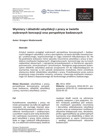 WSB University in Wroclaw Research Journal ISSN 1643-7772 I eISSN 2392-1153 Vol. 16 I No. 2 Zeszyty Naukowe Wyższej Szkoły Bankowej we Wrocławiu ISSN 1643-7772 I eISSN 2392-1153 R. 16 I Nr 2 Wymiary i składniki satysfakcji z pracy w świetle wybranych koncepcji oraz perspektyw badawczych Autor: Grzegorz Wudarzewski Abstrakt Artykuł zawiera przegląd wybranych perspektyw koncepcyjnych i badawczych kategorii satysfakcji z pracy sporządzony na bazie dorobku teoretycznego i praktycznego, wypracowanego w ciągu ostatnich kilkudziesięciu lat. Na tej podstawie wskazano różne sposoby rozumienia satysfakcji z pracy w kontekście możliwości badawczych i diagnostycznych, koncentrując się na trzech najbardziej obszernych i najczęściej przywoływanych w literaturze ujęciach: poznawczym, emocjonalnym i procesowym. Następnie pogrupowano potencjalne składniki satysfakcji poprzez przypisanie ich do odpowiadających im wymiarów, tworząc w ten sposób zestawienie modułowe, które umożliwia elastyczny dobór składników satysfakcji z pracy. Przedstawione przez autora propozycje mają charakter otwarty, umowny i stwarzają możliwości elastycznego ich doboru dopasowanego do konkretnego problemu badawczego. Słowa kluczowe: satysfakcja z pracy, perspektywa koncepcyjna, perspektywa badawcza, składniki satysfakcji z pracy, wymiary satysfakcji z pracy JEL: M12, M50 Historia: otrzymano 2016-04-07, poprawiono 2016-05-25, zaakceptowano 2016-05-25 Cel naukowi kładli nacisk na odmienne aspekty związane z tym pojęciem. Celem niniejszej publikacji jest wskazanie możliwych sposobów rozumienia i kierunków oddziaływania satysfakcji z pracy wraz ze wskazaniem możliwych obszarów badawczych oraz, docelowo, próba egzemplifikacji jej potencjalnych wymiarów oraz składników, a także ich systematyzacji w ujęciu historycznym i według podstawowych obszarów badawczych. Kształtowanie satysfakcji z pracy nie może sprowadzać się tylko do ogólnych rozważań, ale wymaga również pewnych skonkretyzowanych ustaleń o charakterze teoretycznym i praktycznym, a punktem wyjścia jest tutaj dookreślenie i pełniejsze rozumienie samej kategorii satysfakcji z pracy, która ewaluowała w ciągu ostatnich kilkudziesięciu lat, a w zależności od koncepcji, badacze Grzegorz Wudarzewski Wyższa Szkoła Bankowa we Wrocławiu Instytut Zarządzania i Marketingu [email protected] WSB University in Wroclaw Research Journal I ISSN 1643-7772 I eISSN 2392-1153 I Vol. 16 I No. 2 Metoda badawcza Implikacje badań Przegląd wybranych perspektyw koncepcyjnych i badawczych kategorii „satysfakcja z pracy” sporządzony został na bazie metody analizy dorobku teoretycznego i praktycznego wypracowanego w ciągu ostatnich kilkudziesięciu lat. Przedłożenie proponowanego przez autora wstępnego, wielowymiarowego konstruktu satysfakcji z pracy poprzedzone zostało przeglądem różnych sposobów rozumienia satysfakcji z pracy sporządzonych na bazie dorobku naukowego wypracowanego w ciągu ostatnich kilkudziesięciu lat i obejmującego zarówno publikacje naukowe, jak i narzędzia sprawdzone i zweryfikowane w praktyce. Na tej podstawie wskazano różne sposoby rozumienia satysfakcji z pracy w kontekście możliwości badawczych i diagnostycznych, koncentrując się na trzech najbardziej obszernych i najczęściej przywoływanych w literaturze ujęciach: poznawczym, emocjonalnym i procesowym. Następnie pogrupowano potencjalne składniki satysfakcji, poprzez przypisanie ich do odpowiadających im wymiarów. Zaproponowany układ prezentacji konstruktu satysfakcji z pracy może stanowić bazę dla naukowców zainteresowanych sposobami postrzegania samej satysfakcji z pracy, jak i jej wymiarów i składowych w okresie kilkudziesięciu lat. Przedłożony przez autora wstępny, teoretyczny konstrukt satysfakcji pracy złożony z 64 i 17 wymiarów może posłużyć jako obiekt badań psychometrycznych ukierunkowanych na wypracowanie i zatwierdzenie narzędzia do pomiaru satysfakcji z pracy oraz następnie do przeprowadzenia badań empirycznych w różnych przekrojach badawczych. Ograniczenia badań Przedstawione przez autora propozycje mają charakter otwarty, umowny i wymagają szeregu badań empirycznych i psychometrycznych. Wstęp Zainteresowanie czynnikiem ludzkim w kontekście efektywnego procesu motywowania stanowi współcześnie jeden z kluczowych obszarów zainteresowania każdej organizacji. Wiąże się to z potrzebą dbałości o pracowników pod kątem rozwoju, wykorzystywania w pełni ich potencjału, kreatywności i zaangażowania. Niezbędnym czynnikiem warunkującym te aspekty jest zjawisko satysfakcji z pracy. Wiele wcześniejszych i współczesnych badań dowodzi, że między satysfakcją z pracy a efektywnością i produktywnością zachodzą różnego rodzaju zależności, które powinny być uwzględniane w założeniach strategicznych organizacji. Kształtowanie satysfakcji z pracy nie może sprowadzać się tylko do ogólnych rozważań, ale wymaga również pewnych skonkretyzowanych ustaleń o charakterze teoretycznym Wnioski Konstrukt satysfakcji z pracy okazał się być zjawiskiem rozbudowanym, obejmującym 64 składniki przyporządkowane do odpowiadających im 17 wymiarów. Oryginalność/wartość artykułu, wkład w rozwój nauki Pogrupowano potencjalne składniki satysfakcji poprzez przypisanie ich do odpowiadających im wymiarów, tworząc w ten sposób zestawienie modułowe, które umożliwia elastyczny dobór parametrów badawczych satysfakcji z pracy w badaniach naukowych i przy próbach pomiaru satysfakcji z pracy. 124 Grzegorz Wudarzewski | Wymiary i składniki satysfakcji z pracy w świetle wybranych koncepcji oraz perspektyw badawczych i praktycznym. Punktem wyjścia jest tutaj dookreślenie i pełniejsze rozumienie samej kategorii satysfakcji z pracy, która ewaluowała w czasie ostatnich kilkudziesięciu lat, a w zależności od koncepcji, badacze naukowi kładli nacisk na odmien