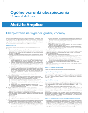 Ogólne warunki ubezpieczenia Umowa dodatkowa Ubezpieczenie na wypadek groźnej choroby Niniejsza umowa dodatkowa jest częścią umowy ubezpieczenia, zwanej dalej Umową. Niniejsza umowa dodatkowa obejmuje ochroną Ubezpieczonego wymienionego w Szczegółowej Umowie Ubezpieczenia i jest zawierana na wniosek Ubezpieczającego. Składkę należną z tytułu niniejszej umowy dodatkowej określa Szczegółowa Umowa Ubezpieczenia lub odrębny dokument dołączony do Umowy. Artykuł 1. Definicje W rozumieniu niniejszej umowy dodatkowej poniższe terminy będą oznaczać: 1. Rak: a) Guz złośliwy charakteryzujący się niekontrolowanym wzrostem oraz rozprzestrzenianiem się komórek nowotworowych z naciekaniem i niszczeniem zdrowej tkanki. Termin ten obejmuje również białaczkę oraz nowotworowe choroby układu limfatycznego. b) Diagnoza musi zostać potwierdzona przez badanie histopatologiczne (opisane cechy złośliwości komórek nowotworowych) oraz opinie lekarza onkologa lub patologa. c) Wykluczenia: 1) zmiany opisywane jako raki in situ lub nieinwazyjne oraz stany przednowotworowe, zawierające, ale nie ograniczone do: raka in situ gruczołu piersiowego, dysplazji nabłonka szyjki macicy w stopniu CIN-1, CIN-2, CIN-3, 2) nadmierne rogowacenie, podstawnokomórkowe i kolczystokomórkowe raki skóry, czerniaki naciekające tkankę na głębokość mniejszą niż 1,5 mm lub sklasyfikowane poniżej 3 stopnia w skali Clarka, za wyjątkiem obecności przerzutów, 3) raki gruczołu krokowego w skali TNM opisywane jako T1a lub T1b albo raki gruczołu krokowego sklasyfikowane w innej skali o podobnym lub niższym zaawansowaniu; brodawczakowaty rak tarczycy T1N0M0 o średnicy mniejszej niż 1 cm; brodawczakowaty mikro-rak pęcherza moczowego; przewlekła białaczka limfatyczna w stopniu zaawansowania mniejszym niż 3 w skali RAI, 4) wszystkie nowotwory w przebiegu zakażenia wirusem HIV. 2. Zawał mięśnia sercowego: a) Obumarcie fragmentu mięśnia sercowego w wyniku jego niedokrwienia. b) Diagnoza musi być oparta łącznie na trzech lub więcej z niżej podanych pięciu kryteriów, które składają się na świeży zawał mięśnia sercowego: 1) rozpoznany w wywiadzie medycznym typowy ból w klatce piersiowej, 2) świeże zmiany w EKG potwierdzające zawał mięśnia sercowego, 3) diagnostycznie istotne podwyższenie poziomu frakcji mięśniowej kinazy kreatyninowej, 4) diagnostycznie istotne podwyższenie poziomu Troponiny (T lub I), 5) frakcja wyrzutowa lewej komory mniejsza niż 50% mierzona 3 miesiące lub później od dokonanego zawału. 3. Choroba niedokrwienna serca wymagająca leczenia operacyjnego: a) Faktycznie przeprowadzona operacja z otwarciem klatki piersiowej mająca na celu korekcję zwężenia lub niedrożności jednej lub więcej tętnic wieńcowych poprzez utworzenie połączeń omijających, tzw. by-passów. b) Diagnoza musi być oparta na potwierdzonym koronarografią istotnym zwężeniu tętnicy wieńcowej. Wskazanie do zabiegu musi być potwierdzone przez lekarza kardiologa. c) Wykluczenia: 1) angioplastyka, 2) wszystkie inne wewnątrznaczyniowe techniki udrażniania naczyń. 4. Udar: a) Incydent mózgowo-naczyniowy obejmujący zawał tkanki mózgowej, krwawienie podpajęcze lub krwawienia do mózgu, zatory lub zakrzepy mózgowe. b) Diagnoza musi być oparta na wszystkich wymienionych poniżej kryteriach: 1) potwierdzone przez lekarza neurologa objawy trwałego uszkodzenia układu nerwowego utrzymujące się co najmniej przez 6 tygodni po dokonanym incydencie mózgowym, 2) zmiany stwierdzone zostały w rezonansie magnetycznym lub tomografii komputerowej lub innym wiarygodnym badaniem potwierdzającym rozpoznanie świeżo przebytego incydentu mózgowego. c) Wykluczenia: 1) przemijające niedokrwienie mózgu, 2) uszkodzenie mózgu spowodowane wypadkiem lub urazem, infekcją, zapaleniem naczyń, zapaleniem mózgu, 3) choroby naczyniowe dotyczące narządu wzroku (w tym nerwu wzrokowego), 4) zaburzenia układu równowagi (układu przedsionkowego ucha wewnętrznego) wynikające z niedokrwienia. 5. Niewydolność nerek: Przewlekłe nieodwracalne upośledzenie czynności obu nerek, wymagające stałego, regularnego odbywania przez Ubezpieczonego dializy nerki lub jej przeszczepu. 6. Przeszczepienie narządów: a) Leczenie operacyjne Ubezpieczonego obejmujące: 1) przeszczep szpiku kostnego przy użyciu krwiotwórczych komórek macierzystych poprzedzone całkowitym zniszczeniem szpiku (ablacją), 2) przeszczepienie jednego z następujących narządów pochodzenia ludzkiego: serce, płuca, wątroba, nerki, trzustka, które jest wynikiem nieodwracalnego i schyłkowego upośledzenia wymienionych narządów. b) Pozostałe rodzaje transplantacji komórek macierzystych są wykluczone. 7. Utrata wzroku: Całkowita i nieodwracalna utrata wzroku obu oczu na skutek choroby, potwierdzona przez lekarza okulistę. Artykuł 2. Przedmiot ubezpieczenia Przedmiotem niniejszego ubezpieczenia jest zdrowie Ubezpieczonego. Artykuł 3. Początek ubezpieczenia Odpowiedzialność Towarzystwa z tytułu niniejszej umowy dodatkowej rozpoczyna się w dniu wejścia w życie niniejszej umowy dodatkowej wskazanej w Szczegółowej Umowie Ubezpieczenia, pod warunkiem zawarcia niniejszej umowy dodatkowej i opłacenia składki. Artykuł 4. Zakres ochrony Suma ubezpieczenia wskazana w Szczegółowej Umowie Ubezpieczenia zostanie wypłacona tylko w przypadku, gdy Ubezpieczony pozostanie przy życiu w ciągu 30 dni: a) od daty rozpoznania jednej z chorób zdefiniowanych w artykule 1 punkt 1, 2, 4, 5, 7, lub b) od daty leczenia operacyjnego zdefiniowanego w artykule 1 punkt 3, 6. Świadczenie zostanie wypłacone tylko w przypadku, gdy objawy choroby pojawią się po raz pierwszy najwcześniej po upływie 6 miesięcy od daty zawarcia niniejszej umowy dodatkowej lub od daty podwyższenia sumy ubezpieczenia w niniejszej umowie dodatkowej. Ubezpieczonemu przysługuje prawo do wypłaty tylko jednego świadczenia z tytu