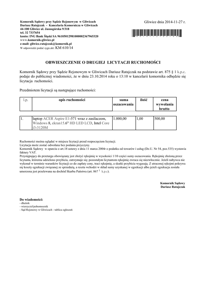 Komornik Sądowy przy Sądzie Rejonowym w Gliwicach Dariusz Ratajczak - Kancelaria Komornicza w Gliwicach 44-100 Gliwice ul. Jasnogórska 9/318 tel. 32 7337654 konto: ING Bank Śląski SA 96105012981000002367965320 www.komornik-gliwice.pl e-mail: [email protected] W odpowiedzi podać sygn.akt: KM Gliwice dnia 2014-11-27 r. *4014112700168* 610/14 OBWIESZCZENIE O DRUGIEJ LICYTACJI RUCHOMOŚCI Komornik Sądowy przy Sądzie Rejonowym w Gliwicach Dariusz Ratajczak na podstawie art. 875 § 1 k.p.c. podaje do publicznej wiadomości, że w dniu 23.10.2014 roku o 13:10 w kancelarii komornika odbędzie się licytacja ruchomości. Przedmiotem licytacji są następujące ruchomości: l.p. 1. opis ruchomości laptop ACER Aspire E1-571 wraz z zasilaczem, Windows 8, ekran15.6" HD LED LCD, Intel Core i3-3120M suma oszacowania 1.000,00 ilość 1,00 cena wywołania brutto 500,00 Ruchomości można oglądać w miejscu licytacji przed rozpoczęciem licytacji. Licytacja może zostać odwołana bez podania przyczyny. Komornik Sądowy w oparciu o art.18 ustawy z dnia 11 marca 2004r o podatku od towarów i usług (Dz.U. Nr 54, poz.535) wystawia faktury VAT. Przystępujący do przetargu obowiązany jest złożyć rękojmię w wysokości 1/10 części sumy oszacowania. Rękojmię złożoną przez licytanta, któremu udzielono przybicia, zatrzymuje się; pozostałym licytantom rękojmię zwraca się niezwłocznie. Jeżeli nabywca nie wykonał w terminie warunków licytacji co do zapłaty ceny, traci rękojmię, a skutki przybicia wygasają. Z utraconej rękojmi pokrywa się koszty egzekucji związanej ze sprzedażą, a reszta wchodzi w skład sumy uzyskanej w egzekucji albo jeżeli egzekucja została umorzona jest przelewana na dochód Skarbu Państwa (art. 867 1 k.p.c). Komornik Sądowy Dariusz Ratajczak Do wiadomości: - dłużnik - wierzyciel/pełnomocnik - Sąd Rejonowy w Gliwicach - tablica ogłoszeń