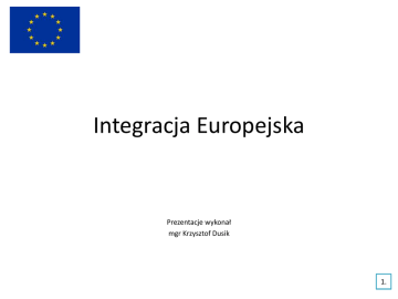 Integracja Europejska Prezentacje wykonał mgr Krzysztof Dusik 1. Spis treści 1. 2. 3. 4. 5. 6. 7. 8. 9. 10. Geneza integracji europejskiej SLAJDY Historia integracji europejskiej SLAJDY Ojcowie Unii Europejskiej SLAJDY Symbole Unii Europejskiej SLAJD Procesy integracyjne SLAJDY Filary Unii Europejskiej SLAJD Rozwój terytorialny Unii Europejskiej SLAJD Instytucje Unii Europejskiej i ich kompetencje Bibliografia SLAJD Materiały ikonograficzne SLAJDY 3. – 4. 5. – 7. 8. – 11. 12. 13. – 14. 15. 16. 17. – 22. 23. 24. – 25. 2. Geneza Unii Europejskiej Przyczyny integracji europejskiej: • Państwa europejskie wyszły z II wojny bardzo zniszczone. Zgodnie z planem Marshalla (1948) miały otrzymać 17 mld bezzwrotnej pomocy na odbudowę swojej gospodarki. W celu zarządzania pomocą utworzono OEEC – Europejską Organizację Współpracy Gospodarczej, która skupiła 16 państw. Miało to duży wpływ na proces integracji gdyż pomoc w ramach planu Marshalla uzyskały zarówno państwa zwycięskie jak i pokonane w wojnie. • Po II wojnie światowej znaczenie państw europejskich znacznie się zmniejszyło. Świat stał się dwubiegunowy – miejsce dawnych imperiów kolonialnych zajęły dwa supermocarstwa – USA i ZSRR, wzajemnie się zwalczające. Integracja europejska była odpowiedzią państw Europy Zachodniej na tę sytuację – dążyły one do odzyskania dawnej pozycji międzynarodowej. • Po doświadczeniu dwóch wojen światowych politycy europejscy zrozumieli, że dalszy konflikt między państwami nie ma sensu. Obawa przed możliwością wybuchu trzeciej wojny światowej i jej konsekwencjami, obawa przed komunizmem były przyczynami szukania innej drogi. • Początkowo najważniejszym aspektem były zniszczenia i ruina gospodarek państw europejskich oraz walka z głodem. Integracja gospodarcza wydawała się jedynym rozsądnym rozwiązaniem. 3. Geneza Unii Europejskiej Utworzenie pierwszej wspólnoty gospodarczej Po wyzwoleniu Jean Monnet zaproponował rządowi francuskiemu globalny plan modernizacji i rozwoju ekonomicznego. Zauważył, że tarcia między Francją i Niemcami w sprawie kontroli nad Zagłębiem Ruhry, (regionem produkcji węgla i stali) nasiliły się tak jak po I wojnie światowej. Jean Monet zaproponował ideę Wspólnoty Europejskiej, którą 9 maja 1950 przedstawił w imieniu francuskiego rządu minister spraw zagranicznych Robert Schuman (deklaracja Schumana) Na podstawie planu Schumana miała powstać organizacja międzynarodowa, do której mogły wstąpić państwa Europy Zachodniej. Plan miał powiązać gospodarczo Francję i Niemcy. Dzięki temu miała zostać podwyższona stopa życiowa mieszkańców krajów, które weszłyby do tej wspólnoty, a wojna między nimi stałaby się nieopłacalna z ekonomicznego punktu widzenia. Propozycję zaaprobowały: Republika Federalna Niemiec, Włochy, Belgia, Luksemburg i Holandia. Wielka Brytania nie wyraziła zgody. Skutkiem planu Monneta było powstanie Europejskiej Wspólnoty Węgla i Stali. 4. Historia integracji europejskiej 1951 traktat paryski Powstanie EWWiS Europejskiej Wspólnoty Węgla i Stali Powstanie EWG i EURATOM EWG – Europejska Wspólnota Gospodarcza 1957 traktaty rzymskie EURATOM - Europejska Wspólnota Energii Atomowej RFN, Francja, Włochy, Belgia, Holandia, Luksemburg RFN , Francja, Włochy Belgia, Holandia, Luksemburg 1967 traktat o fuzji Powstanie WE – Wspólnot Europejskich Trzy wyżej wymienione wspólnoty, połączyły swoje organy władzy RFN, Francja, Włochy Belgia, Holandia, Luksemburg 1968 unia celna Państwa WE przyjęły wspólną taryfę celną wobec państw trzecich RFN, Francja, Włochy Belgia, Holandia, Luksemburg 1979 Pierwsze bezpośrednie wybory do Parlamentu Europejskiego RFN, Francja, Włochy, Belgia, Holandia, Irlandia, Luksemburg, Wielka Brytania ,Dania, 1985 układ w Schengen Stopniowe znoszenie kontroli granicznej w ruchu osobowym między krajami RFN, Francja, Belgia, Holandia, Luksemburg 5. Historia integracji europejskiej 1986 Jednolity Akt Europejski JAE (Haga) Decyzja o utworzeniu Rynku Wewnętrznego do końca 1992 r. Zmieniono procedurę podejmowania decyzji we WE 1992 układ w Maastricht (Belgia) Powstaje Unia Europejska. (WE przekształca się w UE) oparta na trzech filarach. Powstaje jednolity rynek wewnętrzny UE 1995 w życie weszło Członkowie UE mogą swobodnie poruszać się porozumienie wykonawcze wewnątrz krajów UE. Do układu nie przystąpiła Wielka Brytania i Irlandia traktatu w Schengen 1997 traktat amsterdamski Niemcy, Francja, Włochy, Belgia, Holandia, Wielka Brytania, Luksemburg, Dania, Irlandia, Grecja, Hiszpania, Portugalia (12) Niemcy, Francja, Włochy, Belgia, Holandia, Luksemburg, Dania, Grecja, Hiszpania, Portugalia Reforma UE – zreformowano instytucje UE 1998 Utworzono Europejski Bank Centralny 2001 traktat nicejski Nowelizacja układu o UE – zgoda na rozpoczęcie negocjacji z nowymi państwami, które chcą wstąpić do UE Niemcy, Francja, Włochy, Belgia, Holandia, Wielka Brytania, Luksemburg, Dania, Irlandia, Grecja, Hiszpania, Portugalia, Austria, Finlandia, Szwecja (15) 6. Historia integracji europejskiej 2002 Strefa euro – 12 krajów członkowskich wprowadziło nową walutę (wyjątek – Wielka Brytania, Irlandia i Szwecja) Stara 15 : Niemcy, Francja, Włochy, Belgia, Holandia, Austria, Finlandia, Dania, Luksemburg, Grecja, Hiszpania, Portugalia 2003 Ateny Traktat akcesyjny pomiędzy UE (15 państw), a 10 nowymi członkami. W krajach tych po podpisaniu traktatu przeprowadzono referendum, by zatwierdzić akcesję do UE Nowe 10 krajów UE: Polska, Czechy, Słowacja, Litwa, Łotwa, Estonia, Malta, Cypr, Węgry, Słowenia 2004 18.06. Traktat Konstytucyjny Rada Europejska zatwierdziła Traktat Konstytucyjny. Został odrzucony w referendach we Francji i Holandii. 2007 13.12. traktat lizboński Traktat Lizboński utrzymuje najważniejsze postanowienia Traktatu Konstytucyjnego. 2007 21.12. Nowe kraje przystąpi