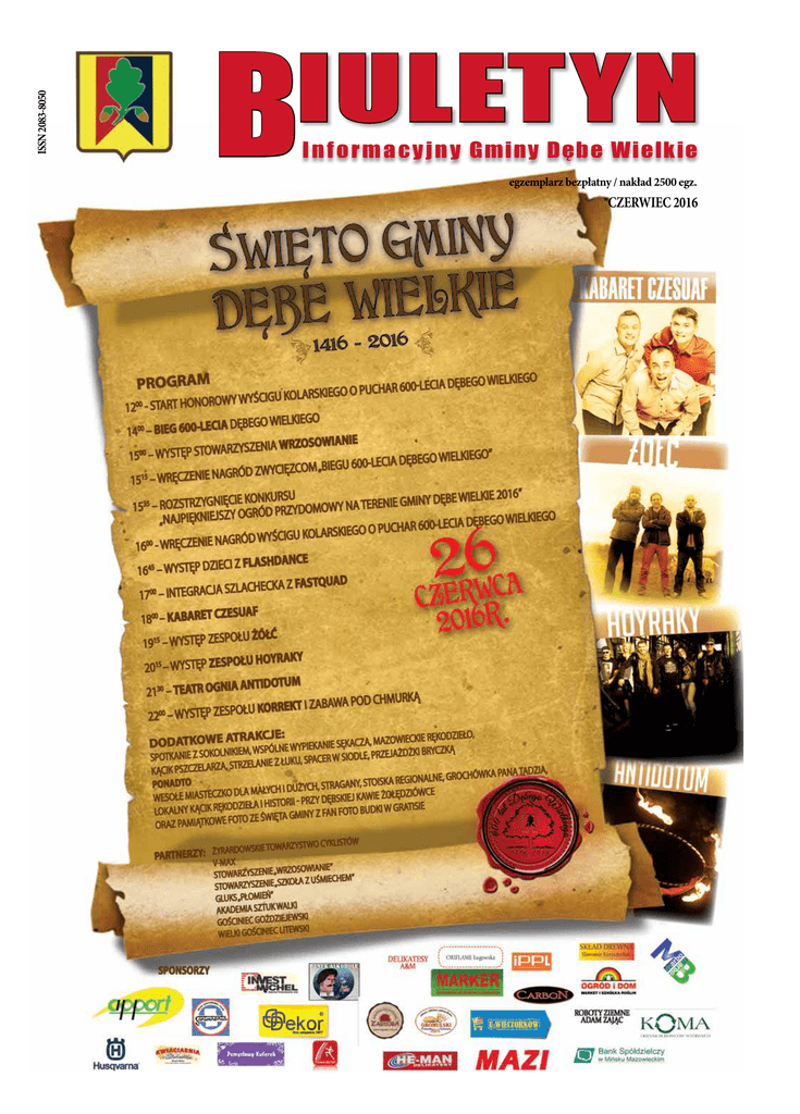 ISSN 2083-8050 IULETYN B I n f o r m a c y j n y Gminy Dębe Wielkie egzemplarz bezpłatny / nakład 2500 egz. CZERWIEC 2016 AKTUALNOŚCI 600 lat Dębego Wielkiego SZANOWNI MIESZKAŃCY I PRZEDSIĘBIORCY GMINY DĘBE WIELKIE Szybkimi krokami nadchodzi lato, którego zwiastunem już 26 czerwca będzie Święto Gminy Dębe Wielkie, w czasie którego w średniowiecznym stylu przygotowaliśmy dla Państwa wiele atrakcji. W czasie wakacji już po raz drugi planujemy kino plenerowe przed Urzędem Gminy. Lato będzie też czasem kolejnych inwestycji. Szanowni Mieszkańcy i Przedsiębiorcy informujemy, że od 1 lutego 2016r. w Referacie Strategii i Rozwoju Gminy oraz w Referacie Gospodarki Komunalnej i Ekologii KAŻDY CZWARTEK JEST DNIEM WEWNĘTRZNYM, INTERESANCI W GODZ. 800- 1400 NIE BĘDĄ PRZYJMOWANI. Prosimy o dostosowanie się do zmian. 24h 2 Już niedługo rozpocznie się budowa kolejnego odcinka kanalizacji - tym razem w ul. Długiej i Mazowieckiej w Aleksandrówce. Zostanie także wykonanych kilka nowych nakładek asfaltowych z poprawą ul. Pustelnickiej i 103 Bat. Strzelców oraz częściowo Olszowej w Dębem Wielkim, ulicą Leśną i Mazowiecką w Chrośli. Wykonana została już nakładka na drodze prowadzącej z Cyganki do Gorzanki. Powakacjach planowane jest ogłoszenie przetargu na budowę kolejnego odcinka sieci wodociągowej. Po uzyskaniu pozwolenia na budowę po przetargu rozpocz- nie się budowa nowego gminnego przedszkola w Dębem Wielkim przy ul. Krótkiej. Jak widać plany inwestycyjne jeszcze w tym roku są bardzo ambitne ale realne. Życząc Państwu odpoczynku w sezonie urlopowym pozdrawiam Krzysztof Kalinowski Wójt Gminy Dębe Wielkie Gmina Dębe Wielkie jest również dostępna w internecie, ma swój facebook i działa. Zapraszamy https://www.facebook.com/gmina.debewielkie USŁUGA NEWSLETTER Na stronie internetowej gminy www.debewielkie.pl funkcjonuje usługa newsletter, która umożliwia otrzymywanie bieżących informacji dotyczących pracy Urzędu i wydarzeń poprzez pocztę elektroniczną (e-mail). Aby móc korzystać z tej usługi wystarczy wejść na stronę internetową gminy i w oknie newsletter (prawa strona) wpisać swój adres e-mail oraz postępować zgodnie z otrzymanymi pod wskazany adres informacjami od administratora. Bądź na bieżąco i dopisz się do bezpłatnej usługi newsletter. MIESZKAŃCY GMINY DĘBE WIELKIE Jeśli w Państwa rodzinach są pary małżeńskie, które w 1966 roku zawarły związek małżeński, proszę o zgłaszanie tego faktu do Kierownika Urzędu Stanu Cywilnego Dębe Wielkie Małgorzaty Gańko tel. 25-756-47-30 lub 25-756-47-31. Taka informacja przyspieszy proces wystąpienia do Prezydenta RP o przyznanie odznaczeń za Długoletnie Pożycie Małżeńskie, w 2016 roku pary te obchodzą 50-lecie pożycia małżeńskiego. TELEFON KONTAKTOWY GMINNY ZESPÓŁ ZARZĄDZANIA KRYZYSOWEGO BIULETYN INFORMACYJNY GMINY DĘBE WIELKIE / CZERWIEC 2016 Małgorzata Gańko Kierownik Urzędu Stanu Cywilnego w Dębem Wielkim 0 604 197 100 W naszej gminie zameldowanych jest 9650 mieszkańców na pobyt stały i 150 osób na pobyt czasowy ( stan na dzień 10.06.2016r.) AKTUALNOŚCI 60 0 lat Dębego Wielkiego PROJEKTY UNIJNE Gmina Dębe Wielkie w dniu 20 kwietnia 2016 r. podpisała warunkową umowę o dofinasowanie na realizację projektu złożonego w ramach Priorytetu VII „Tworzenie i poprawa warunków dla rozwoju kapitału ludzkiego, działanie 7.2 „Infrastruktura służąca edukacji” pn. „Budowa hali sportowej wraz z łącznikiem do Gimnazjum w Dębem Wielkim”. Dofinansowanie przyznano w wysokości 2 748 938,53 zł. Już wcześniej gmina otrzymała dotację na ten cel w wysokości 1,2 mln zł...z Ministerstwa Sportu i Rekreacji. W ramach projektu wybudowana została przyszkolna hala sportowa z łącznikiem do Gimnazjum o łącznej powierzchni użytkowej 1688,98 m2 na terenie Szkoły Podstawowej oraz Gimnazjum. Wybudowana w ramach projektu hala sportowa jest w pełni przystosowana do potrzeb osób niepełnosprawnych. Projekt zakładał wielofunkcyjność wykorzystania obiektu, który jest wykorzystywany nie tylko przez uczniów Gimnazjum Gminnego , lecz również przez uczniów innych placówek publicznych w gminie, miesz- KONTROLA TABLICZEK NA BUDYNKACH Wójt Gminy Dębe Wielkie informuje, że właściciele nieruchomości zabudowanych lub inne podmioty, które takimi nieruchomościami władają, mają obowiązek umieszczenia w widocznym miejscu np. na ścianie frontowej budynku lub ogrodzeniu i utrzymania w należytym stanie tabliczki z numerem porządkowym. Obowiązek oznaczenia budynku numerem porządkowym wynika z art. 47b ustawy Prawo Geodezyjne i Kartograficzne (Dz. U. 2015.520). Niedopełnienie obowiązku wynikającego z powyższego przepisu skutkuje popełnieniem wykroczenia określonego w art. 64 Kodeksu Wykroczeń (Dz. U. 2015.1094). Prawidłowe oznakowanie posesji numerem porządkowym ma istotne znaczenie dla usprawnienia działań wszystkich podmiotów, dla których łatwość identyfikacji domów jest niezwykle ważna dla ratowania życia i zdrowia, a także zapewnienia bezpieczeństwa obywateli. W związku z powyższym, w celu zmobilizowania i zwiększenia świadomości społeczności lokalnej w zakresie oznakowania posesji, Wójt Gminy Dębe Wielkie, informuje, iż od 1 października 2016 roku będą przeprowadzane kontrole budynków. Ponadto przypominam, iż w Naszej Gminie, uchwałą Nr SR.XVII.0007.107.2012 Rady Gminy Dębe Wielkie z dnia 26 stycznia 2012r, .został wprowadzony System Informacji Gminnej, w której są zamieszczone wytyczne jak powinna być wykonana tabliczka. Zachęcamy więc Mieszkańców, którzy nie posiadają jeszcze żadnych tabliczek z numerem domu do wykonania zgodnych z obowiązującym SIG na terenie gminy Dębe Wielkie. Urząd Gminy Dębe Wielkie służy wszelką pomocą w tym zakresie. Aby ułatwić wymianę tablic na nowe mogą Państwo składać zamówienia w Urzędzie Gminy Dębe Wielkie, pok. 