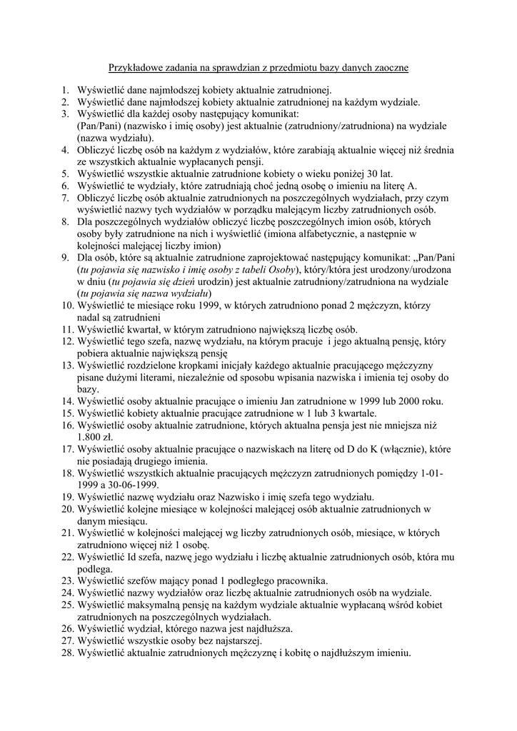 Przykładowe zadania na sprawdzian z przedmiotu bazy danych zaoczne 1. Wyświetlić dane najmłodszej kobiety aktualnie zatrudnionej. 2. Wyświetlić dane najmłodszej kobiety aktualnie zatrudnionej na każdym wydziale. 3. Wyświetlić dla każdej osoby następujący komunikat: (Pan/Pani) (nazwisko i imię osoby) jest aktualnie (zatrudniony/zatrudniona) na wydziale (nazwa wydziału). 4. Obliczyć liczbę osób na każdym z wydziałów, które zarabiają aktualnie więcej niż średnia ze wszystkich aktualnie wypłacanych pensji. 5. Wyświetlić wszystkie aktualnie zatrudnione kobiety o wieku poniżej 30 lat. 6. Wyświetlić te wydziały, które zatrudniają choć jedną osobę o imieniu na literę A. 7. Obliczyć liczbę osób aktualnie zatrudnionych na poszczególnych wydziałach, przy czym wyświetlić nazwy tych wydziałów w porządku malejącym liczby zatrudnionych osób. 8. Dla poszczególnych wydziałów obliczyć liczbę poszczególnych imion osób, których osoby były zatrudnione na nich i wyświetlić (imiona alfabetycznie, a następnie w kolejności malejącej liczby imion) 9. Dla osób, które są aktualnie zatrudnione zaprojektować następujący komunikat: „Pan/Pani (tu pojawia się nazwisko i imię osoby z tabeli Osoby), który/która jest urodzony/urodzona w dniu (tu pojawia się dzień urodzin) jest aktualnie zatrudniony/zatrudniona na wydziale (tu pojawia się nazwa wydziału) 10. Wyświetlić te miesiące roku 1999, w których zatrudniono ponad 2 mężczyzn, którzy nadal są zatrudnieni 11. Wyświetlić kwartał, w którym zatrudniono największą liczbę osób. 12. Wyświetlić tego szefa, nazwę wydziału, na którym pracuje i jego aktualną pensję, który pobiera aktualnie największą pensję 13. Wyświetlić rozdzielone kropkami inicjały każdego aktualnie pracującego mężczyzny pisane dużymi literami, niezależnie od sposobu wpisania nazwiska i imienia tej osoby do bazy. 14. Wyświetlić osoby aktualnie pracujące o imieniu Jan zatrudnione w 1999 lub 2000 roku. 15. Wyświetlić kobiety aktualnie pracujące zatrudnione w 1 lub 3 kwartale. 16. Wyświetlić osoby aktualnie zatrudnione, których aktualna pensja jest nie mniejsza niż 1.800 zł. 17. Wyświetlić osoby aktualnie pracujące o nazwiskach na literę od D do K (włącznie), które nie posiadają drugiego imienia. 18. Wyświetlić wszystkich aktualnie pracujących mężczyzn zatrudnionych pomiędzy 1-011999 a 30-06-1999. 19. Wyświetlić nazwę wydziału oraz Nazwisko i imię szefa tego wydziału. 20. Wyświetlić kolejne miesiące w kolejności malejącej osób aktualnie zatrudnionych w danym miesiącu. 21. Wyświetlić w kolejności malejącej wg liczby zatrudnionych osób, miesiące, w których zatrudniono więcej niż 1 osobę. 22. Wyświetlić Id szefa, nazwę jego wydziału i liczbę aktualnie zatrudnionych osób, która mu podlega. 23. Wyświetlić szefów mający ponad 1 podległego pracownika. 24. Wyświetlić nazwy wydziałów oraz liczbę aktualnie zatrudnionych osób na wydziale. 25. Wyświetlić maksymalną pensję na każdym wydziale aktualnie wypłacaną wśród kobiet zatrudnionych na poszczególnych wydziałach. 26. Wyświetlić wydział, którego nazwa jest najdłuższa. 27. Wyświetlić wszystkie osoby bez najstarszej. 28. Wyświetlić aktualnie zatrudnionych mężczyznę i kobitę o najdłuższym imieniu. 29. Wyświetlić poszczególne litery alfabetu (każdą jeden raz) wraz z długością najdłuższego imienia zaczynającego się na tę literę. 30. Wyświetlić nazwę wydziału oraz nazwisko i imię oraz datę zatrudnienia najdłużej aktualnie zatrudnionej na nim osoby. 31. Wyświetlić nazwę wydziału oraz największą pensję pobieraną przez aktualnie osobę zatrudnioną na nim. 32. Wyświetlić rok z największą liczbą osób kiedykolwiek w nim zatrudnionych. 33. Wyświetlić nazwy wydziałów o największej liczbie mężczyzn i kobiet aktualnie zatrudnionych na nich. 34. Wyświetlić nazwę wydziału, który aktualnie zatrudnia najwięcej kobiet. 35. Wyświetlić te nazwy wydziałów, na których aktualne zatrudnienie jest powyżej średniej ze wszystkich osób aktualnie zatrudnionych. 36. Wyświetlić te osoby, które aktualnie zarabiają więcej niż średnia ze wszystkich aktualnie wypłacanych pensji. 37. Wyświetlić najpóźniej zatrudnioną i aktualnie pracującą kobietę. 38. Obliczyć liczbę osób urodzonych w poszczególnych miesiącach na poszczególnych wydziałach. 39. Obliczyć liczbę osób o imieniu zaczynającą się na tę samą literę, przy czym wyświetlić tylko te litery, dla których liczba osób o imieniu zaczynającym się na tę literę jest większa niż 2. 40. Wyświetlić te kwartały, w których zatrudniono więcej niż 2 kobiety.