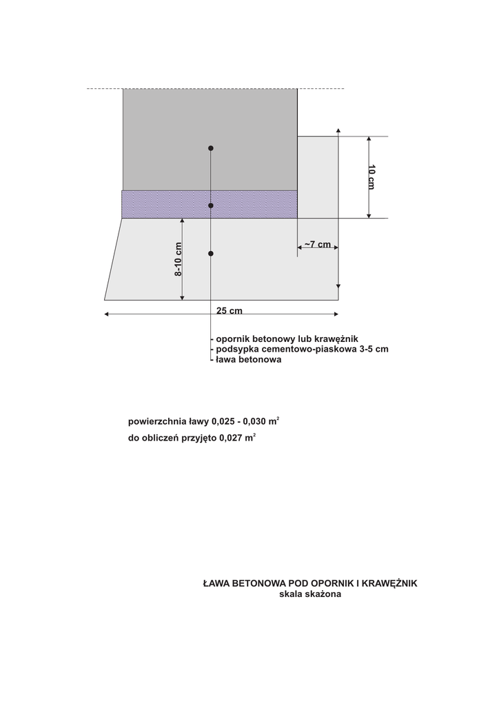 10 cm 8-10 cm ~7 cm 25 cm - opornik betonowy lub krawężnik - podsypka cementowo-piaskowa 3-5 cm - ława betonowa powierzchnia ławy 0,025 - 0,030 m 2 do obliczeń przyjęto 0,027 m2 ŁAWA BETONOWA POD OPORNIK I KRAWĘŻNIK skala skażona